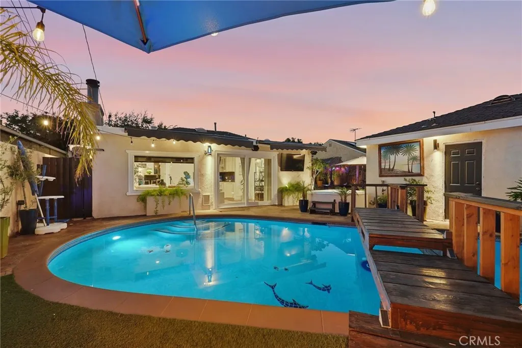 Welcome to your dream 3-bedroom, 2-bath entertainers delight! This stunning single-family home is designed to make lasting memories, featuring an open floor plan, luxurious upgrades, and a resort-style backyard perfect for entertaining. From the moment you arrive, youll love the beautifully landscaped front yard, white vinyl fencing, and charming covered porch that create incredible curb appeal. Step inside to find rich hand-scraped hardwood floors, crown molding, and wainscoting throughout the main living areasadding timeless style and warmth. The gourmet kitchen is a chefs dream, featuring custom cabinetry, granite countertops, a large island, stainless steel appliances, and elegant under-cabinet lighting. The spacious family room includes a cozy fireplace, custom built-ins, and a stylish wet bar with a mini-fridgeideal for gatherings and movie nights. Retreat to spa-inspired bathrooms with travertine mosaic tile, designer wallpaper, and custom vanities that feel straight out of a luxury hotel. Step outside to your own backyard oasis, complete with a sparkling swimming pool, above-ground spa, fire pit, and a fully equipped outdoor bar with refrigerationperfect for summer BBQs and pool parties. Additional highlights include plantation shutters, a whole-house speaker system, and a two-car garage with mounted TVplus three outdoor TVs for effortless entertaining. This move-in ready home truly has it allstyle, comfort, and outdoor living at its best.