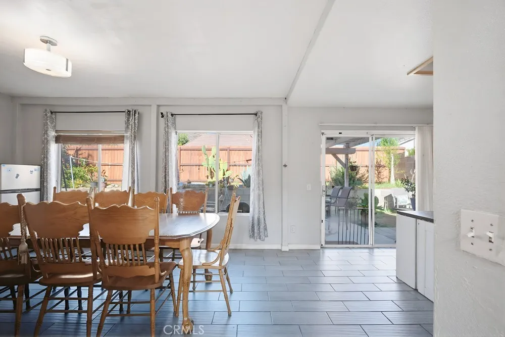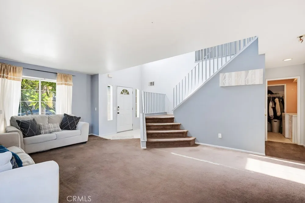 Located on a peaceful, tree-lined street, this Perris home sits in a serene neighborhood surrounded by mature landscaping and natural charm. The front exterior features lush greenery, a spacious driveway leading to a two-car garage, and a small front porch accented by a large window beside the entry. Inside, a welcoming foyer greets you with high ceilings that open to the upper level, setting a bright and airy tone. The staircase is positioned straight ahead, wrapping around with a classic banister. To the right, the living room offers a comfortable gathering space with multiple windows allowing soft natural light to fill the room. Off the living area, a short hallway leads to the laundry room, a half bath, and garage access for added convenience. Beyond the living area, the floor plan opens to a combined kitchen and dining spaceideal for everyday living and entertaining alike. The area is framed by large windows and a sliding glass door that leads to the backyard. Outside, enjoy a tranquil, garden-like setting with a small patio, lush landscaping, and plenty of room for relaxation or entertaining. Upstairs are 4 bedrooms, including a thoughtfully added fifth room that offers extra versatility for a guest room, home office, or play space. The primary suite features an en-suite bathroom with dual sinks, while another full bathroom conveniently serves the remaining bedrooms. Altogether, this home combines functionality and charm, offering comfortable living spaces inside and a peaceful, nature-filled backyard retreat outside.