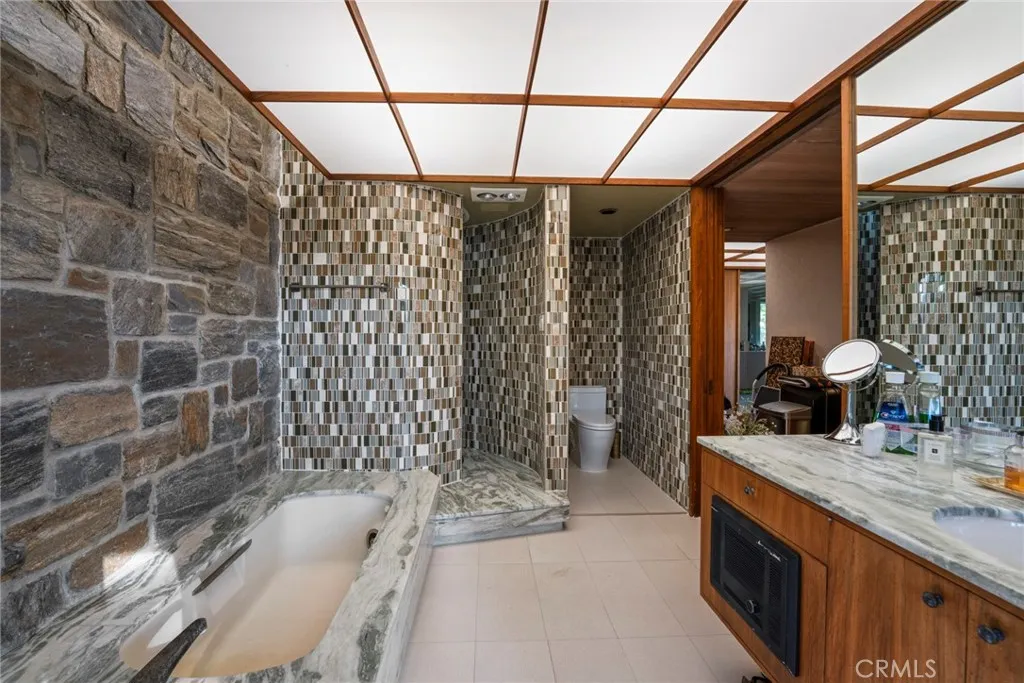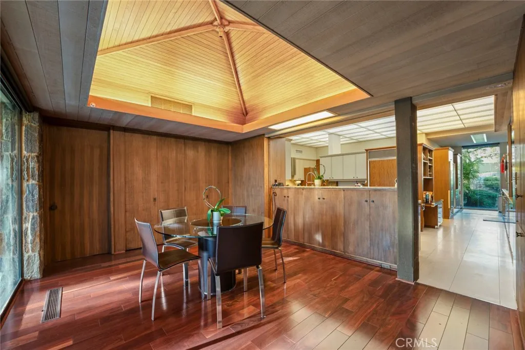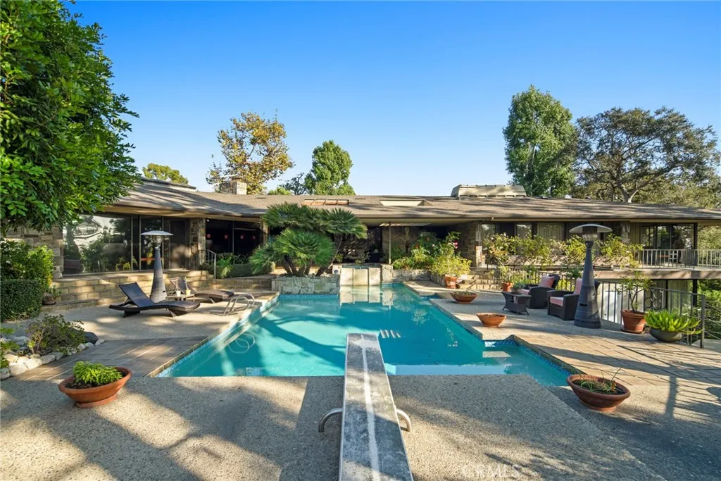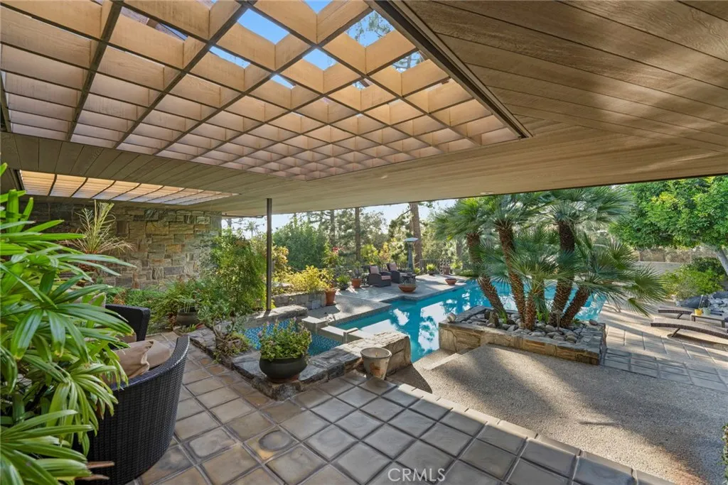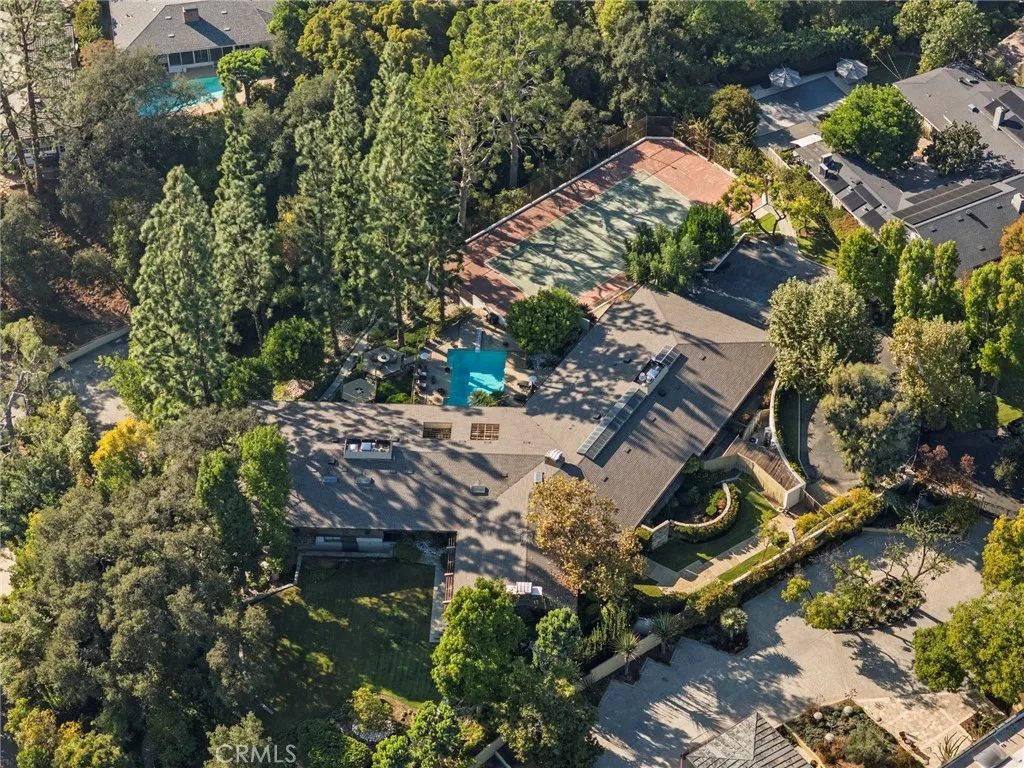 Perched on approximately 1.5 acres in the Langham Huntington enclave, this is a landmark Mid-Century Modern compound that celebrates glass, wood, and stone in harmony with sweeping garden and city-light vistas. Designed by noted architect Harold Zook, the residence showcases expansive window walls, crafted mahogany accents, and signature Bouquet Canyon stonework. An inviting foyer leads to voluminous living and dining spaces oriented to landscaped courtyards, while a catering-scale kitchen anchors a casual breakfast area and a generous family room with pool views. The private primary suite enjoys treetop panoramas, a sitting room, and dual dressing rooms/baths; four additional bedroom suites provide exceptional flexibility. Recent improvements by the current owner include a full remodel of the downstairs bedroom and new flooring throughout the home. Resort amenities span a sparkling pool, true north-south tennis court, and immersive gardens, complemented by skylights, dual-zone HVAC, security system, delivery reception area, potting shed, a four-car garage, and gated entry. A rare offering of scale, privacy, and pedigree in one of Pasadenas most sought-after locations.