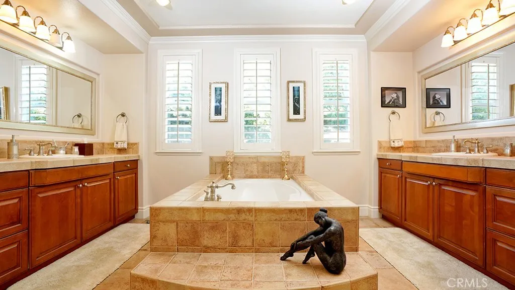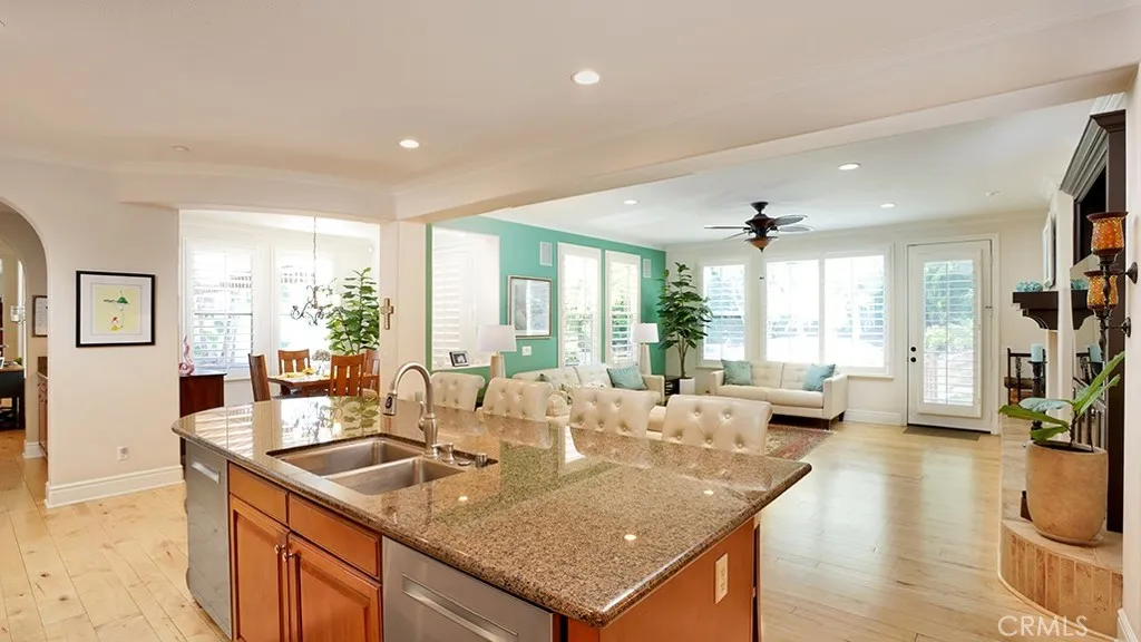 Exquisite Resort-Style Home in Talegas Coveted Montellano Tract. Pride of ownership radiates throughout this stunning 5-bedroom, 4.5-bath, 4,423 sq. ft. home on an 11,325 sq. ft. lot. This two-story residence blends timeless elegance with modern resort-style living. A dual-step path framed by lush palms and landscaping leads to a gated courtyard with a built-in fireplace and seating area. Inside, the grand formal dining room overlooks the backyard, while the formal living room offers cozy carpet, a fireplace, and abundant natural light. Crown molding and light hardwood floors flow throughout the main level, creating an elegant, open feel. Downstairs features a stylish powder bath and a private ensuite bedroomperfect for guests or multigenerational living. The gourmet kitchen is the heart of the home, showcasing granite countertops, rich wood cabinetry, a Sub-Zero refrigerator, Viking double ovens, stovetop and hood, dual dishwashers, pantry and a large island with seating and open shelves. A separate breakfast nook complements a butlers pantry with a dedicated coffee/bar. The adjoining family room offers custom built-ins, fireplace, and shuttered windows overlooking the backyard, plus direct outdoor access. A generous laundry room with cabinetry, sink, and counters connects to the three-car garage with new epoxy flooring. Upstairs, elegant white patterned carpet flows throughout. The primary suite features a fireplace, private balcony with retractable awning, and a spa-inspired bath with dual vanities, soaking tub, walk-in shower, and remodeled his-and-hers custom closet. T