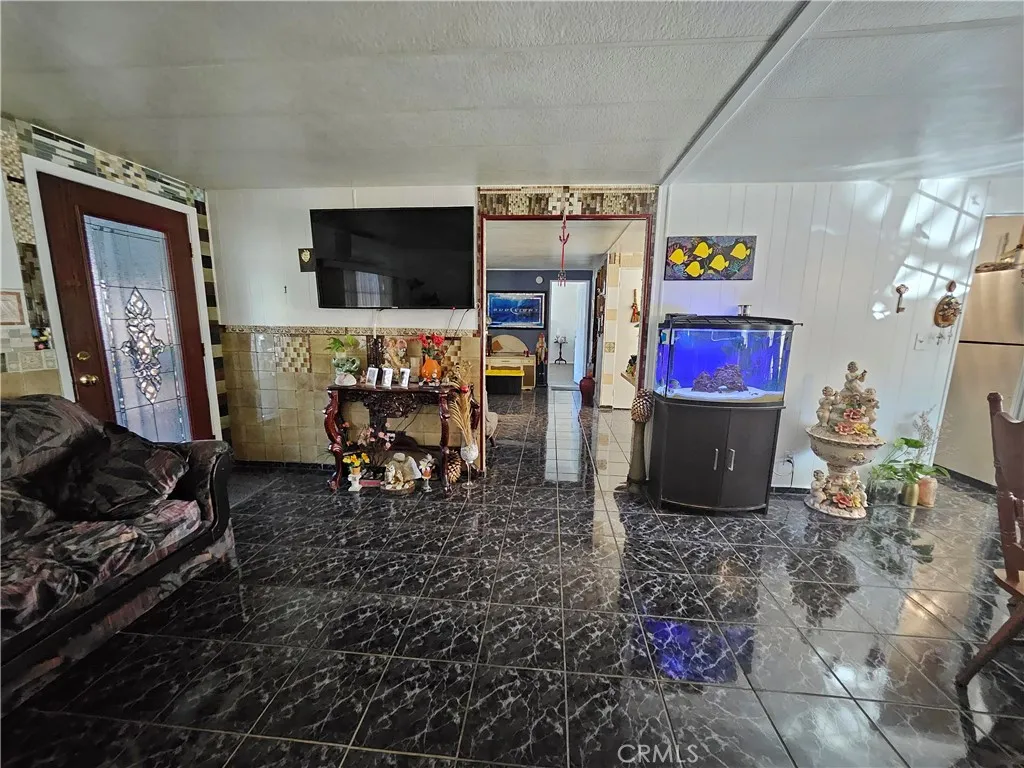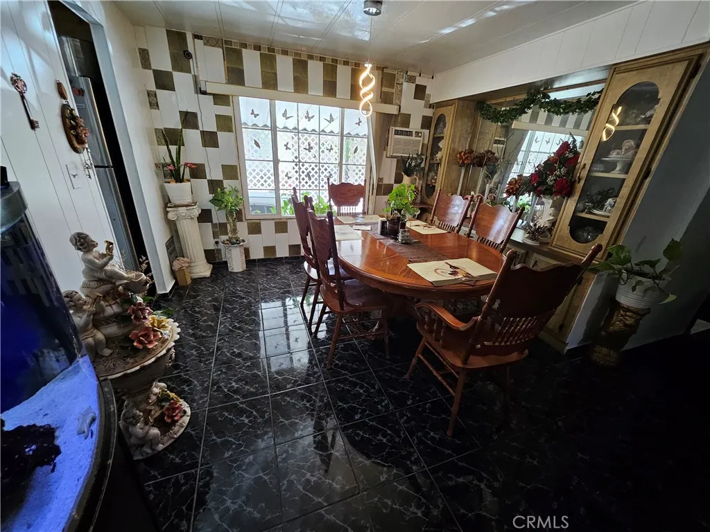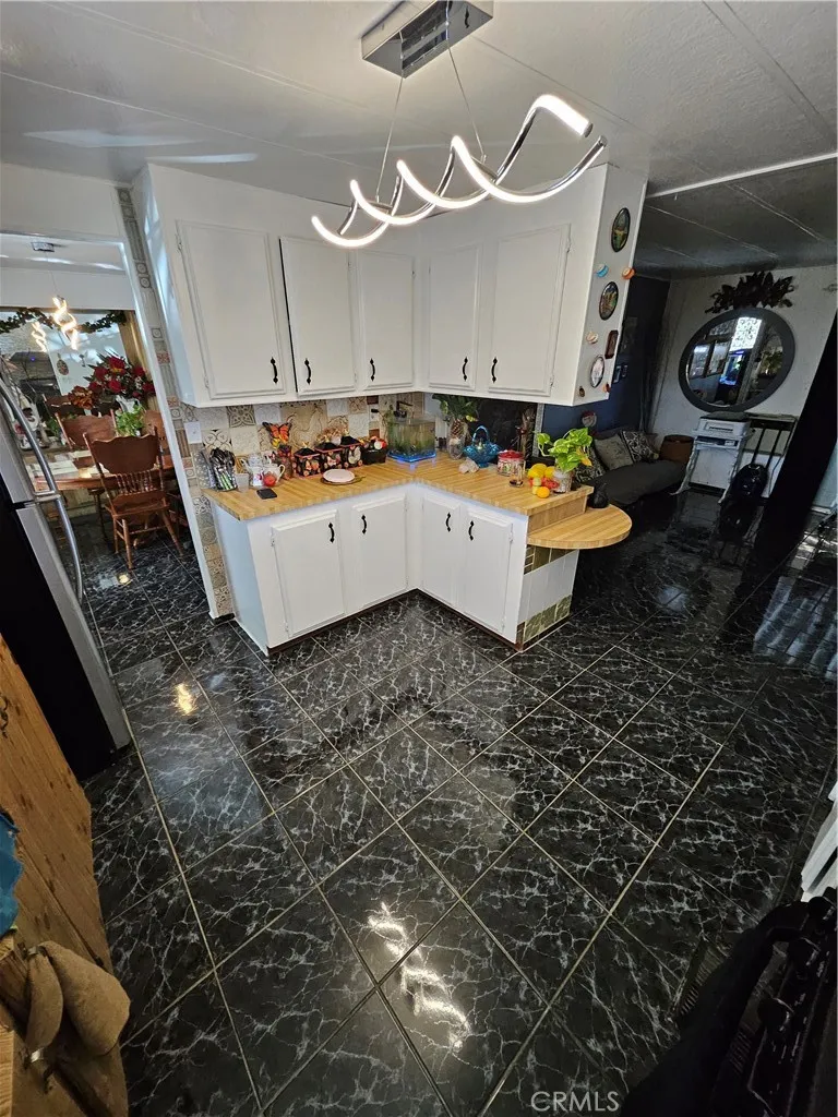 Welcome to this charming and well-cared-for 3 bedroom, 2 bathroom manufactured home, offering a warm and inviting atmosphere with plenty of living space. Step into a bright, open dining area with large windows, custom tile accents, and a modern light fixture that adds a stylish contemporary feel. The kitchen features generous counter space, butcher-block style countertops, white cabinetry, tile backsplash, gas stove, stainless steel refrigerator, and a convenient peninsulaperfect for prepping meals, A comfortable living room with plenty of room to entertain.