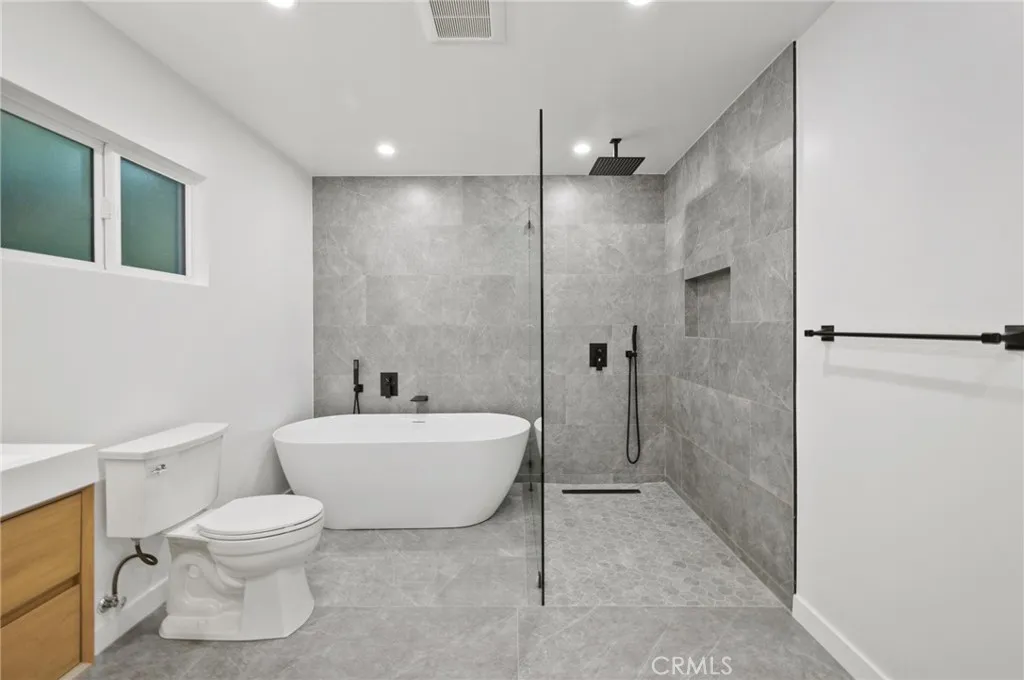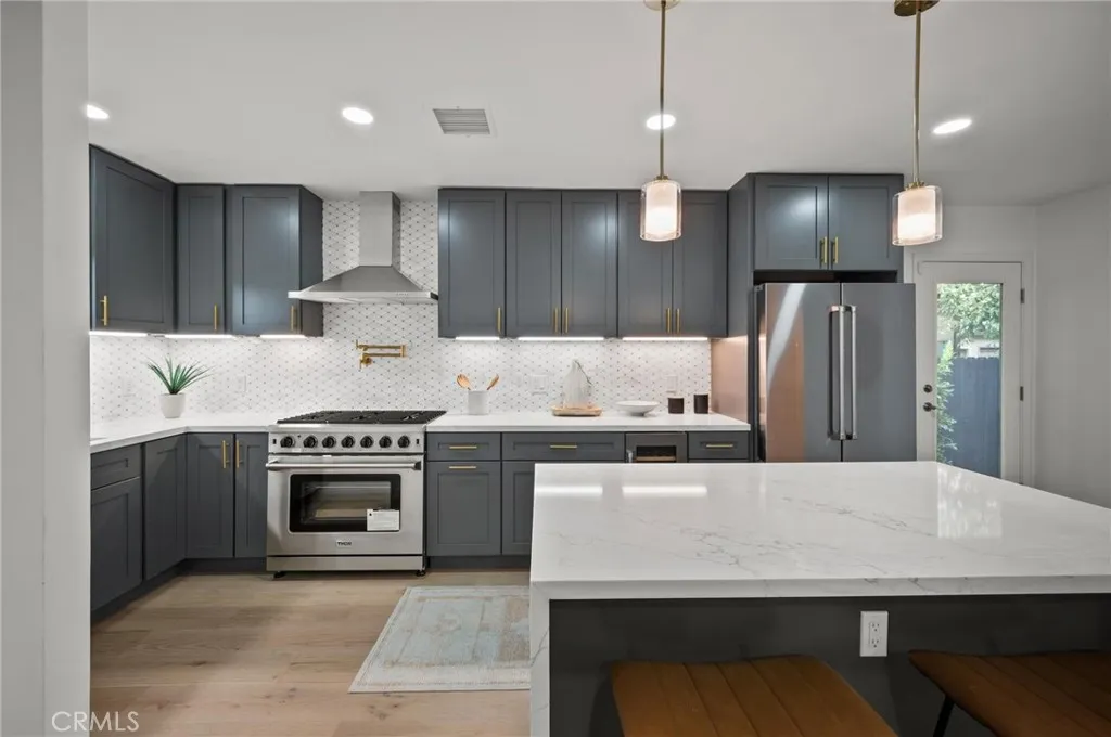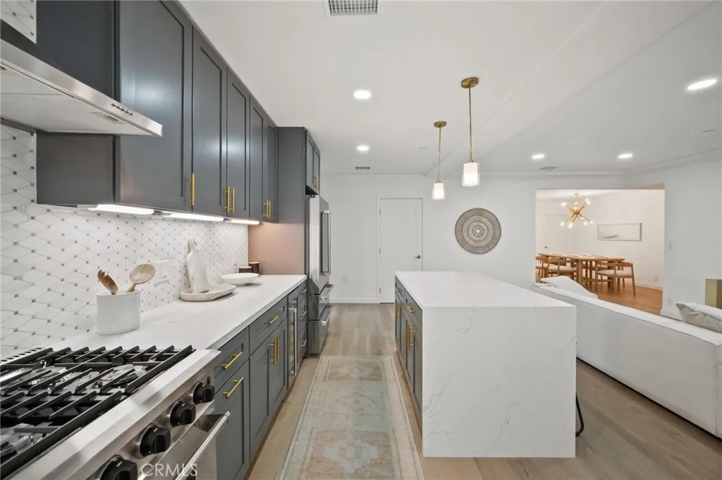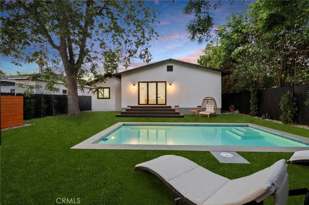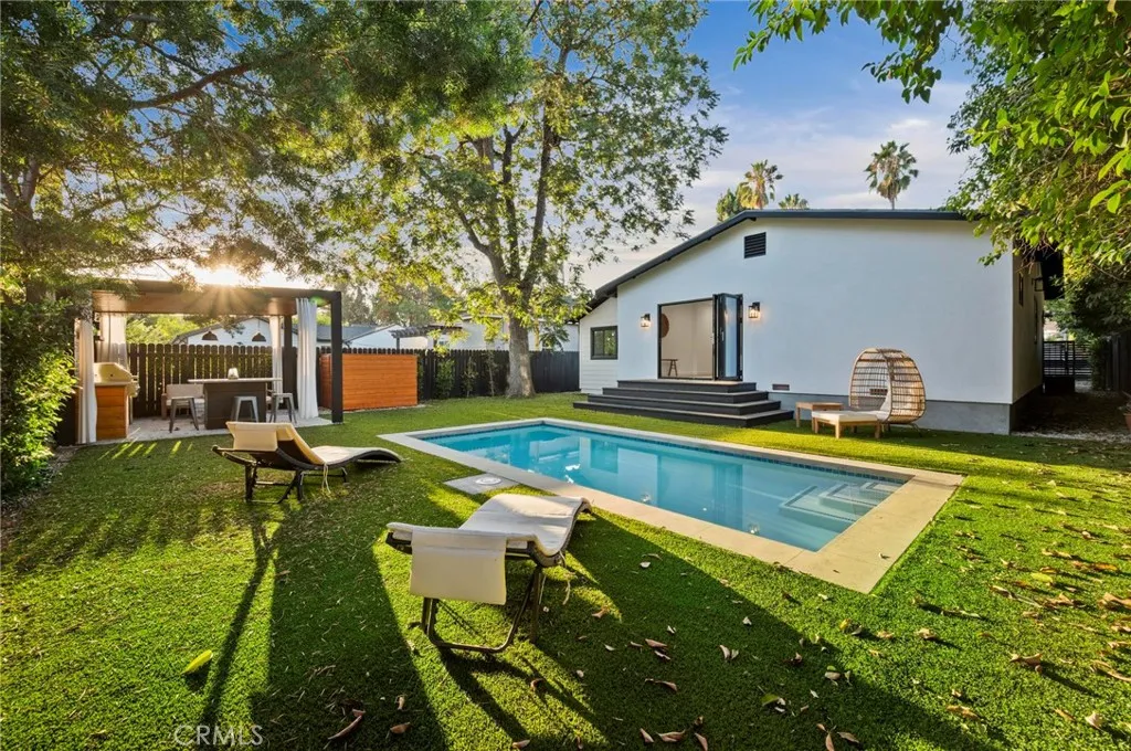 Tucked away on a lush, tree-filled lot, this modern retreat offers the perfect balance of privacy and resort-style living. A remote-controlled iron gate opens to reveal a beautifully reimagined 5-bedroom, 4-bathroom home showcasing timeless design and high-end upgrades throughout. Inside, the open-concept floor plan is anchored by White Oak hardwood floors and a sleek designer kitchen with quartz countertops, under-lit cabinetry, matching Thor appliances, and a built-in three-temperature wine refrigerator. The expansive primary suite overlooks the serene backyard and features a spacious walk-in closet along with a spa-inspired ensuite highlighted by dual sinks and a curb-less, zero-entry shower. Three additional designer bathrooms echo the same attention to detail with walk-in showers and luxury finishes. Step outside to your private paradise: a brand-new sparkling pool shaded by mature trees and complemented by a resort-style cabana. Designed for entertaining, the cabana is complete with an outdoor kitchen, built-in Spires BBQ, dual-temperature wine fridge, mounted TV, overhead lighting, and a cozy fire pit. Recent upgrades provide peace of mind, including a new roof, HVAC system, water heater, all-new copper and PEX plumbing, smooth stucco exterior, stamped concrete driveway, and low-maintenance synthetic turf in both the front and back yards. A rare blend of sophistication, comfort, and modern California living, this home is a true retreat designed for both relaxation and entertaining.