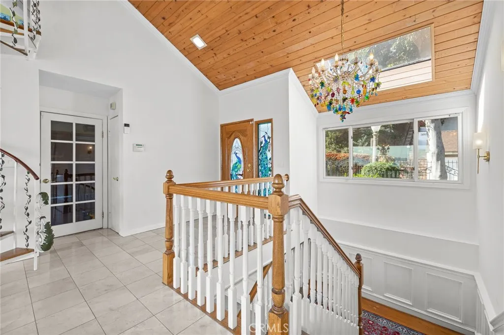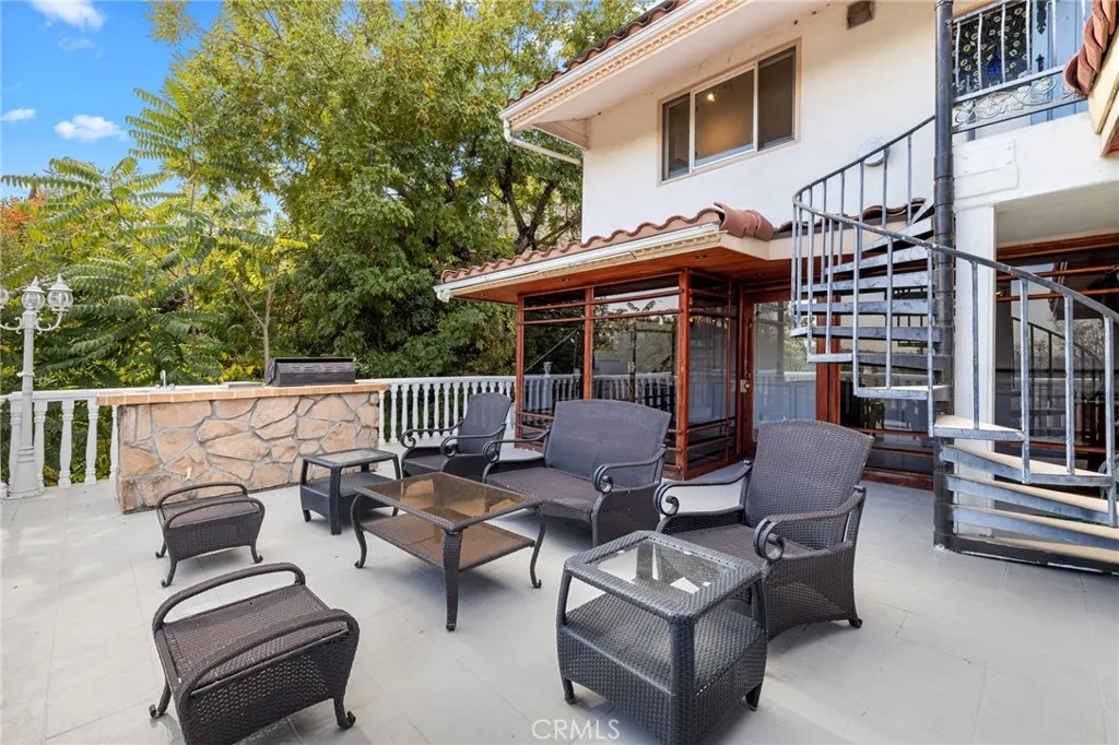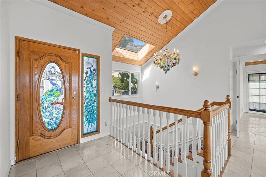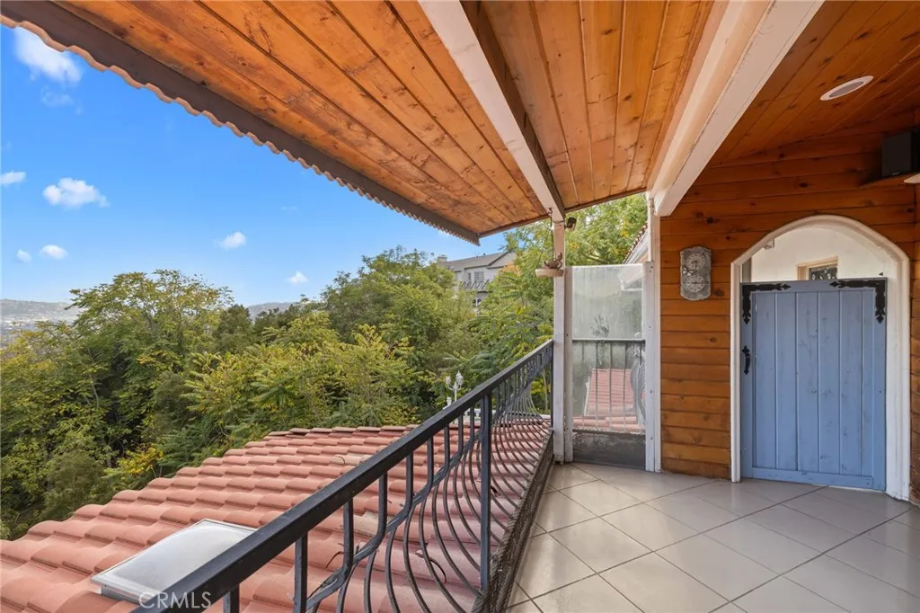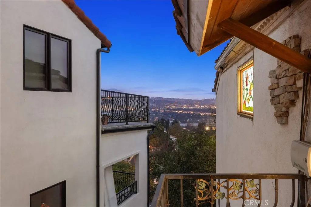 Welcome to this modern Mediterranean style 4 bedroom, 4 bath home in the prestigious Los Feliz hills with amazing views of the city and hillside. The front of the home features an electric gate which leads to the attached two car garage. As you enter this home you are greeted by a dramatic chandelier and expansive windows with incredible views. Several custom stained glass windows throughout add to the ambiance. The spiral staircase in the entry leads to a room that could be a study. The main level of the home includes a bedroom with a full bathroom, a laundry and access to the garage. The floors throughout much of the home are tiled. One level below the entry level is the expansive main living area with pitched ceilings, a dining room, living room with a wood burning fireplace and the entertainment oriented kitchen. The kitchen features an very large center island, a wine rack, granite counters, stainless steel appliances and an abundance of lighting. Included on this level of the home is the primary bedroom with a generous sized walk in closet and a large bathroom with an oversized shower. This level of the home also features two additional bedrooms, a full bathroom, an additional bonus room and a large wine cellar. As you open the exterior doors of these rooms, you find yourself on a generous sized deck that features a BBQ and lounge area, complete with outdoor furniture. But the unbelievable views are the real star of this portion of the property. An added bonus is the completely paid for solar system for lowering the utility bill. Additionally there are exterior stairs