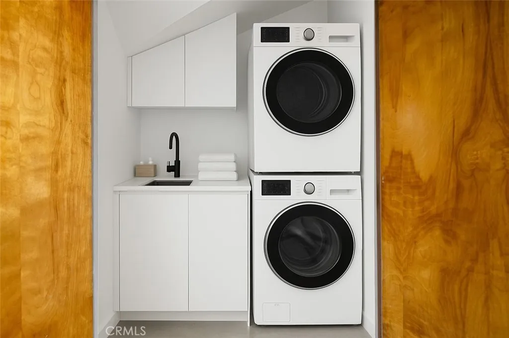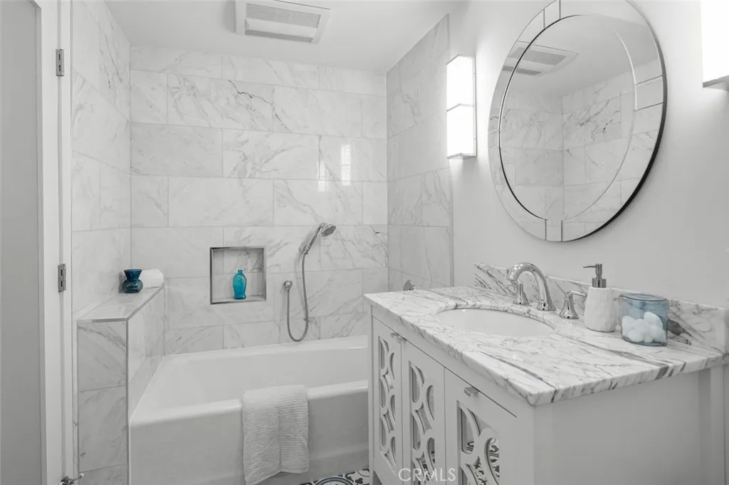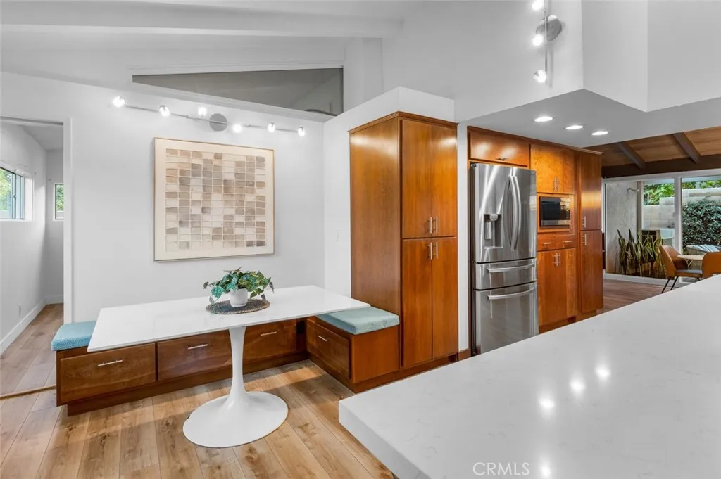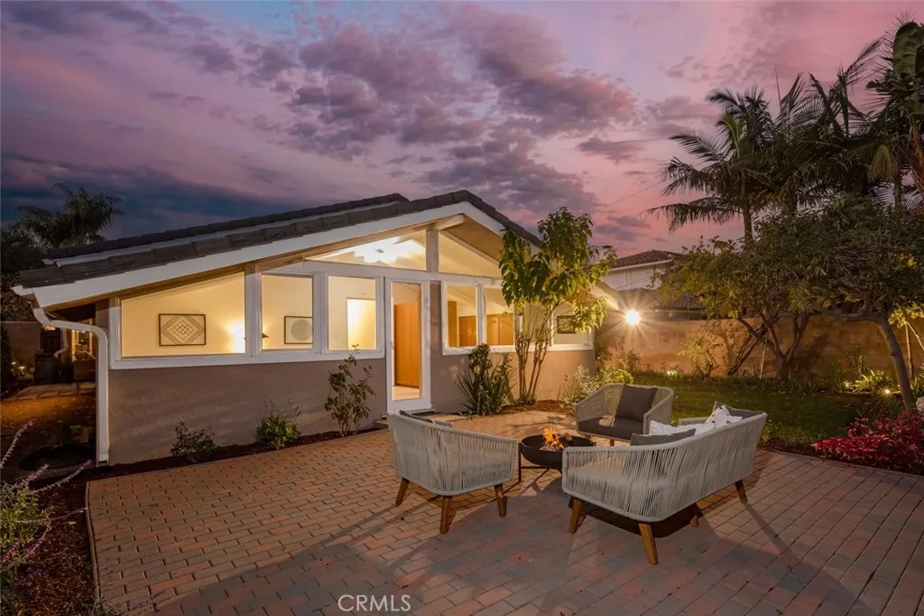 A rare opportunity to own an exceptional, architecturally significant mid-century residence attributed to renowned Long Beach designer Paul Tay, celebrated for his dramatic rooflines, voluminous interiors, organic integration of indoor and outdoor spaces, and meticulous attention to proportion and light. This beautifully updated home captures the spirit of Tays most iconic work while offering a refined, modern living experience. A terrazzo-clad entry flows into an expansive living room defined by soaring vaulted ceilings, a sculptural raised-hearth fireplace, and signature floor-to-ceiling glass that frames the lush, private backyard. True to Paul Tays residential aesthetic, the home features clean horizontal lines, warm natural materials, and a seamless visual connection between every interior space and the surrounding landscape. The newly remodeled kitchen is a contemporary showpiece, center island, sleek cabinetry, breakfast nook, and effortless flow into an inviting family room with sliders to the covered patio. The adjacent formal dining room is wrapped in natural wood finishes and opens to an intimate side courtyard, a hallmark of Tays affinity for protected outdoor vignettes. Two downstairs bedrooms accompany two beautifully remodeled bathrooms, including an oversized downstairs primary, along with a convenient laundry area that can be converted back into a third bedroom if required. Upstairs, the redesigned primary suite feels like a private retreat with vaulted ceilings, an entire wall of closets, a tranquil viewing balcony, and an elegantly redone bathroom featuri