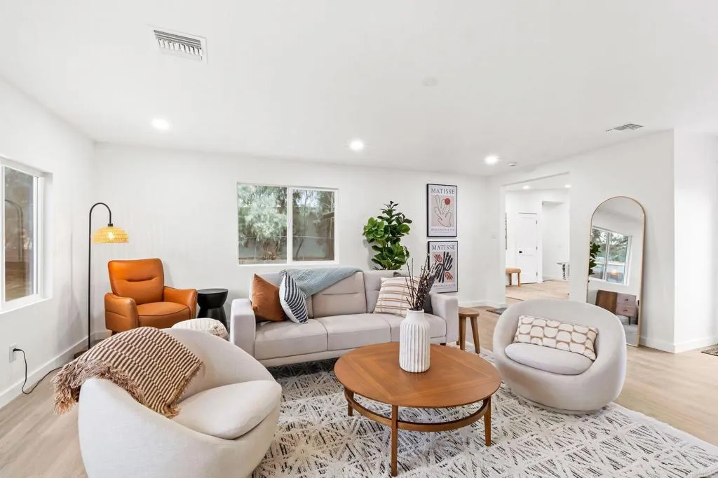 Step inside and youre greeted by clean lines, natural light, and a warm, inviting design. The fully reimagined kitchen features custom concrete countertops, a center island with bar seating, new stainless-steel appliances, modern cabinetry, and statement tile that adds both texture and personality. The kitchen flows seamlessly into the dining area and spacious living room, creating the perfect layout for everyday comfort and effortless entertaining. Major upgrades include a NEW roof, NEW central AC & heat, and brand-new refrigerator, stove, washer, and dryer all of which convey. NEW LVP flooring, recessed lighting, and updated fixtures run throughout the home, giving every room a polished, move-in-ready feel.The primary suite dual sinks, contemporary finishes, and great natural light. Two additional bedrooms provide ideal options for guests, office space, or creative use. Thoughtfully styled, each room highlights the calm, modern desert aesthetic buyers love.Outside, the large backyard is a blank canvas ready for your personal touch, outdoor dining, fire pit lounge, garden space, or simply a peaceful spot to take in the night sky. The front yard offers clean curb appeal with room to expand your desert landscaping vision.Located within walking distance to Downtown Joshua Tree, this home offers unbeatable convenience with quick access to JT National Park, the Desert View Conservation Area, local dining, shopping, and more.Fully remodeled, stylishly updated, and situated in one of Joshua Trees most desirable locations this turnkey property is one you wont want to miss.