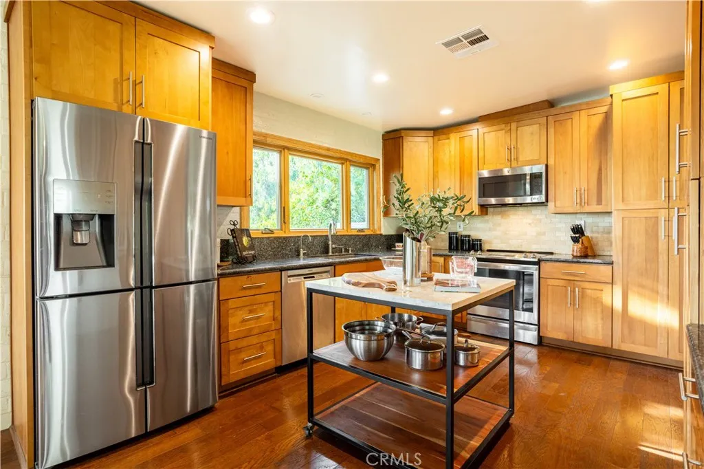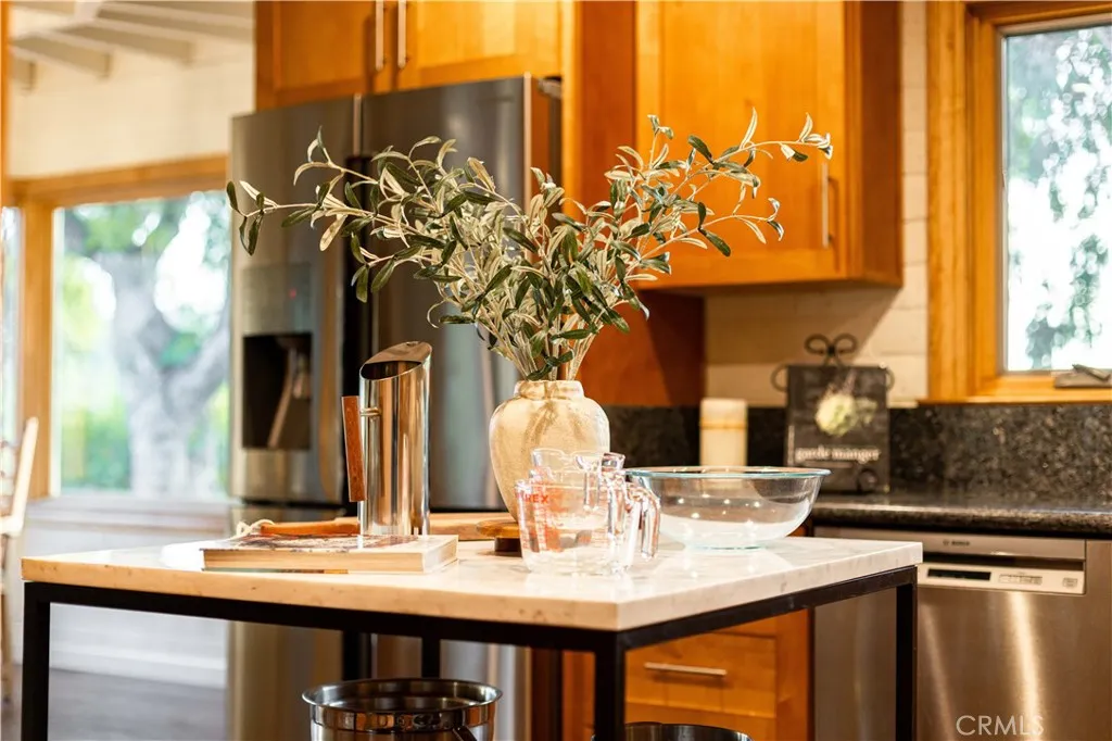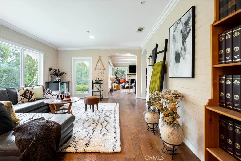 Calling all nature enthusiasts! This exceptional single-level home, set on a sprawling 34,609 sq. ft. lot in highly desirable North Monrovia, offers a rare combination of privacy, space, and modern efficiency. Sited behind a private fence and beautifully shaded by a mature oak tree, the property feels like a secluded retreat. The thoughtful, open floor plan is designed for both comfortable daily living and entertaining. Inside, you'll find a formal living room and a spacious Great Room featuring a cozy fireplace, designated dining area, and walls of windows that perfectly frame the views of the lush, expansive grounds. The kitchen is appointed with ample Shaker-style cabinetry, granite countertops, and built-in appliances. The primary retreat is thoughtfully tucked away for maximum privacy, boasting a walk-in closet and an adjoining bathroom with a dual-sink vanity. Two additional bedrooms and a secondary bathroom, also featuring a dual-sink vanity and a separate tub and shower. The outdoor space is a true highlight, offering several patio areas ideal for entertaining, as well as a large, flat pad accessible by a winding patha blank slate perfect for installing a pool or realizing a variety of other outdoor visions.Additional amenities include wood flooring, central air and heat, a dedicated utility room, and recent interior and exterior painting. The home is an all-electric residence powered by an owned solar system, offering significant energy efficiency. Parking is plentiful with a detached 2-car garage featuring upper storage, plus several uncovered spaces. Experience t
