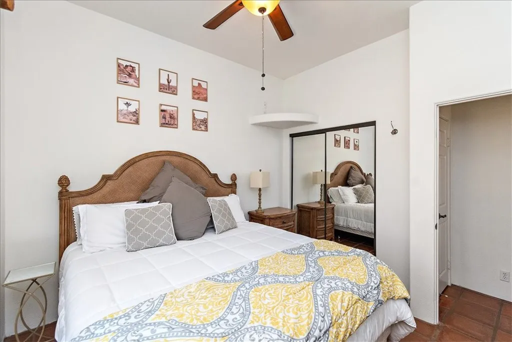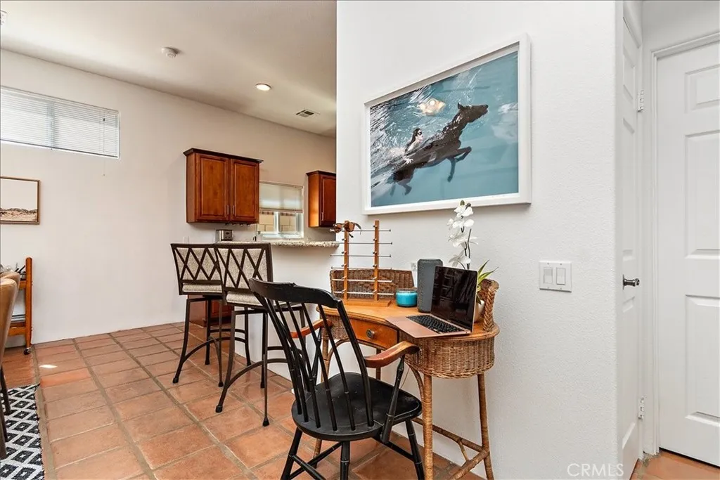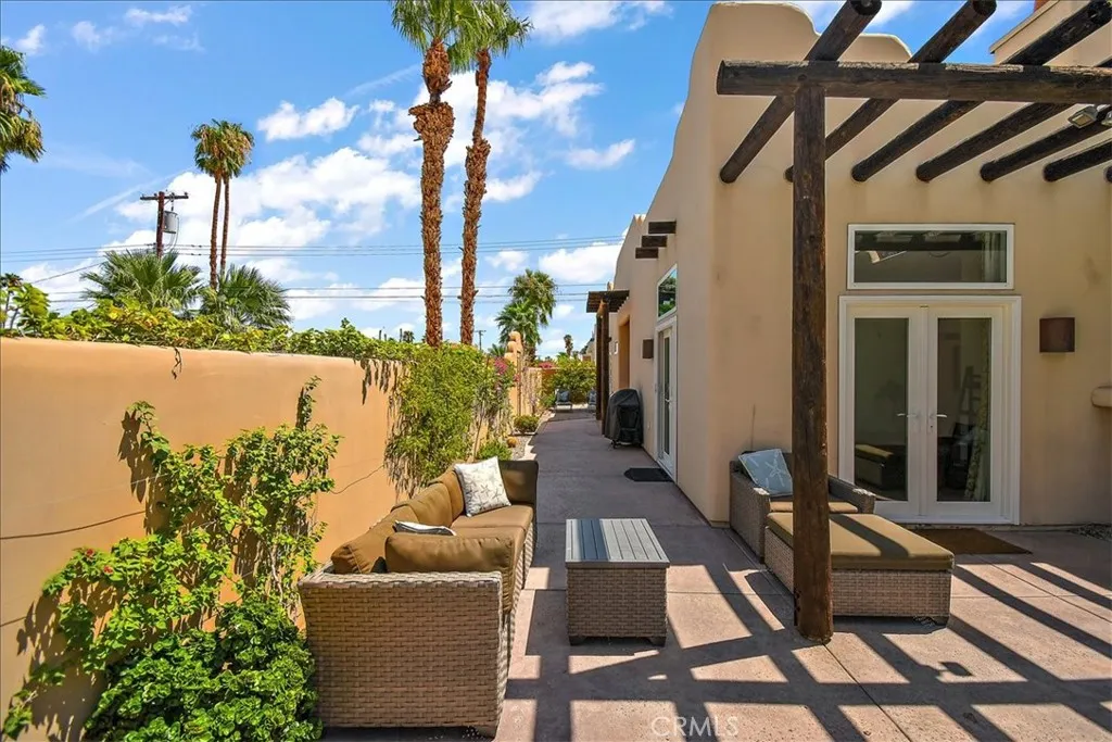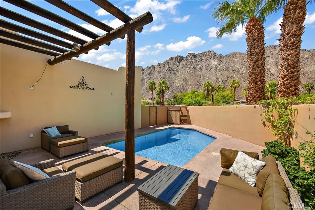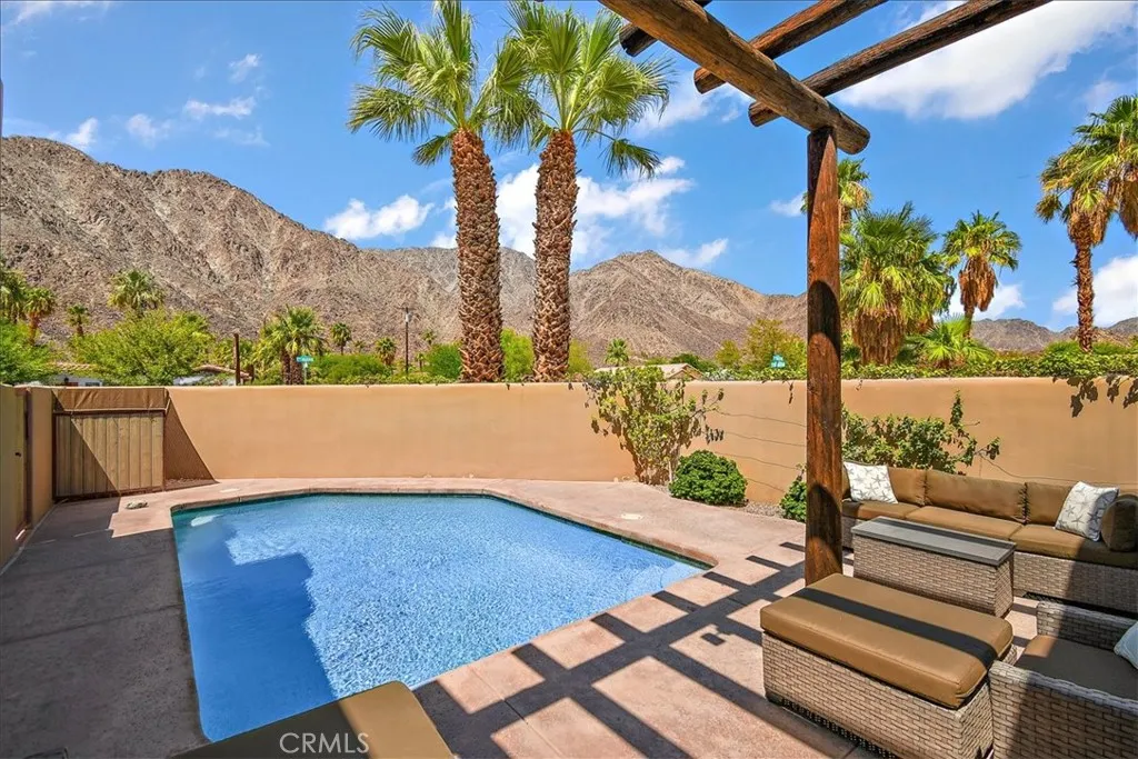 LOCATION. LOCATION. LOCATION. MOTIVATED SELLER. FURNISHED. SUCCESSFUL RENTAL. Beautiful garden, view home on an elevated, corner lot near walking trails & town center in storied La Quinta Cove. Located in coveted La Quinta Cove, this walled & gated, lock-&-go, private retreat sits on an elevated corner lot, surrounded by 3 original, historical Haciendas. Residence provides unmatched privacy, sweeping mountain & palm tree-top vistas (inside & out) w/seamless indoor-outdoor living. This comfortable home FEELS good & is designed to maximize its natural light & captivating views, w/vaulted ceilings & an open-design layout/floorplan. This Adobe Santa Fe-style home offers an exquisite blend of Spanish charm & present-day amenities that punctuate architectural elegance. You will love this comfortable, open-layout home w/refinished Tecate tile floors. Besides having great A/C, Tecate tile keeps the home cooler in summer & cuts down on cooling costs. Newer, stylish refrigerator w/ice maker & beautiful hardwood cabinets enhance the larger kitchen area open to dining room & living spaces. Oversized, primary bedroom has ensuite bath w/authentic Spanish tile in shower & glass block window for privacy & natural light. Bedroom slider leads to quiet, back patio breakfast area w/lemon tree, small fountain for water sounds & planters w/fresh basil & flowers. Two additional bedrooms round out the home & another full bath w/tub/shower. Inside laundry w/new washer/dryer & storage cabinets is next to an additional coat/utility closet. Wood-burning (now painted white) fireplace. Lots of storage.