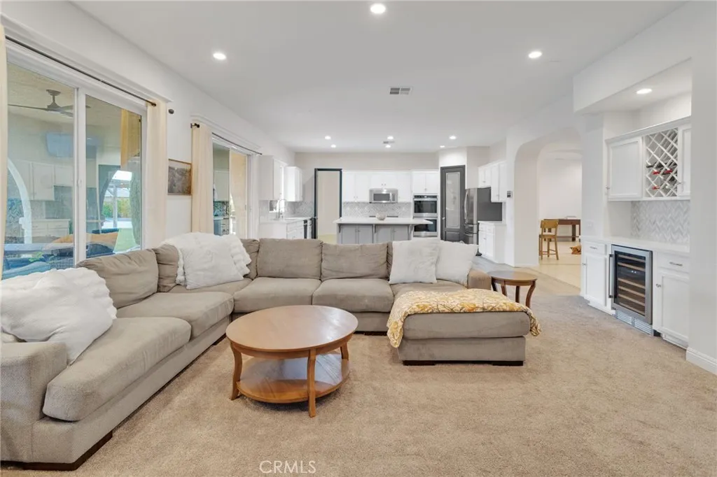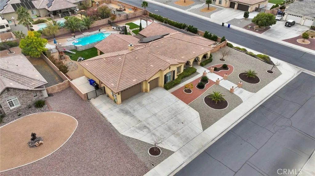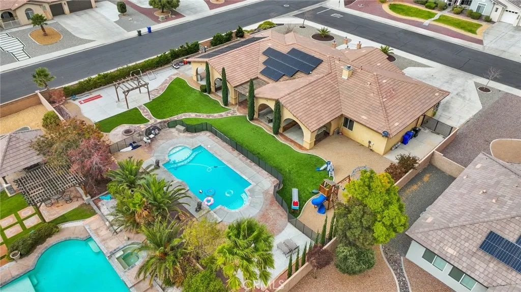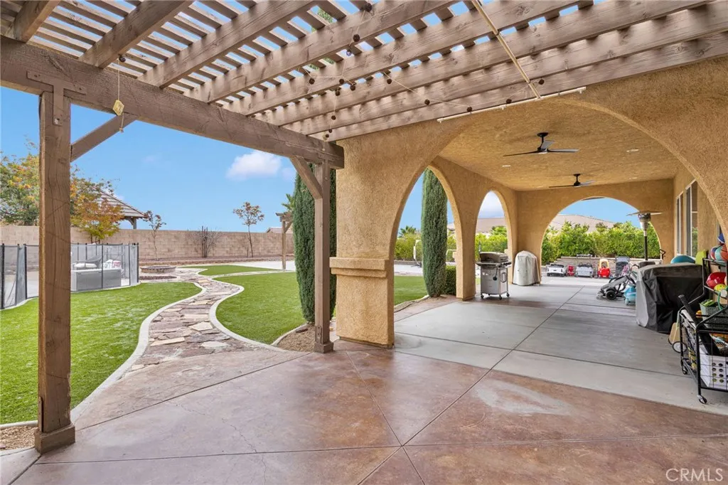 Welcome to Fuji Court, a retreat-like home in the gated Veranda community. With 3,184 sq ft of living space, 4 bedrooms, an office/bonus room, and 2.5 baths this home is designed for refined comfort and easy living. Beautiful curb appeal and landscape lighting highlights the architecture & mature plantings. Inside, tall ceilings and large windows bring natural light into every room. The layout includes a formal living room, formal dining, and a spacious family room with fireplace, built-in wine bar, and expansive views that extend living space into the stunning backyard. The remodeled chefs kitchen features white cabinetry, quartz countertops, a large island, Carrara marble backsplash, double smart ovens, walk-in pantry, coffee bar, and included refrigerator. The kitchen flows seamlessly to the family room where cooking, conversation and everyday living come together. The owner's suite offers a luxurious place to unwind and a spacious ensuite bath with dual sinks, makeup vanity, jetted soaking tub, and a large walk-in closet with built-in organization. Three additional generously sized bedrooms plus a bonus room that works well as a 5th bedroom, media room or home office. Set on nearly a half-acre corner lot, the backyard is designed for relaxation & recreation. Gated RV parking and extensive concrete work lead to a backyard built for year-round enjoyment. The large under-truss patio offers recessed lighting, ceiling fans and TV mounts. A swimming pool with a sunning ledge, raised waterfalls, tanning deck, & safety fencing creates a private resort feel. A wood gazebo, firep