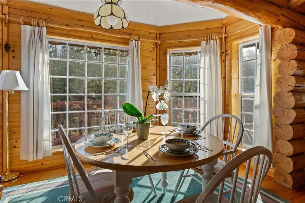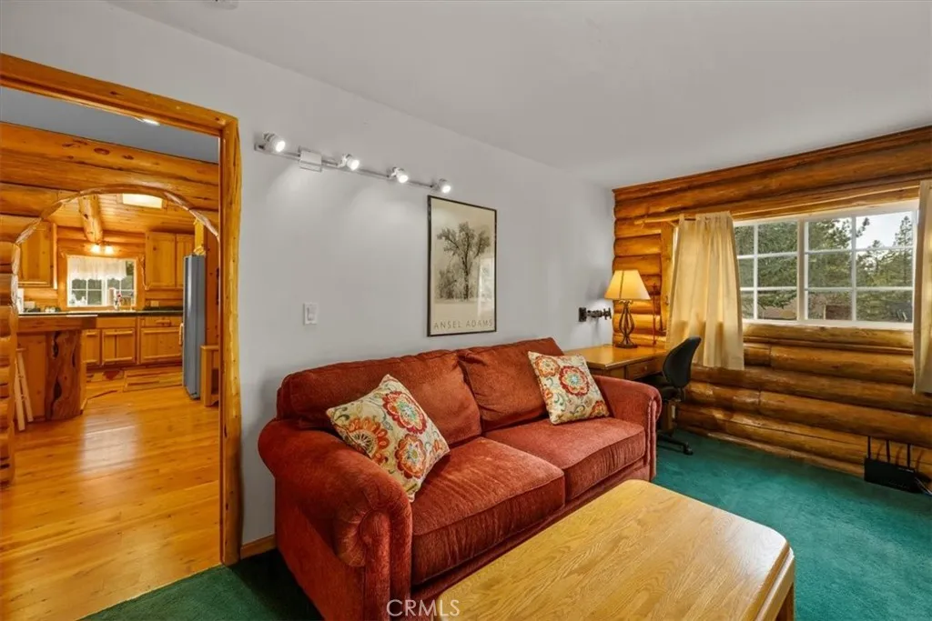 Welcome to this warm and inviting full-log home in Eagle Mountain Estates, located in the desirable Fox Farm area of Big Bear Lake. This single-level cabin features 3 bedrooms, 2 bathrooms, a 2-car attached garage, and underground utilities. Recent upgrades include a new roof, tankless water heater, new furnace, and a new hot tuball ready for comfortable mountain living. Inside, youll enjoy an open floor plan with natural wood flooring, vaulted T&G ceilings, and a dining area that looks out over the trees and mountain views. Theres also a separate laundry room with a sink for added convenience. Step outside to an almost wrap-around Trex deck, plus an additional back deck perfect for entertaining. Under the home, youll find a clean, easily accessible build-up area for extra storage. The home comes furnished and even includes a snow blower, making it truly move-in-ready. A great option as a second home or rental in the mountains.
