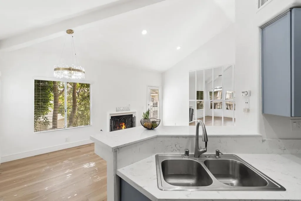 End of year opportunity to reside in Renaissance, one of the most desireable communities of University City. This is where you want to be! Walking distance to Nobel Athletic Center & Recreational park, the library, the famous UTC mall and trolley line. This upper level, END UNIT in the Capri complex has beautiful upgrades starting with the gorgeous LVP flooring from the stairway up (NO carpet throughout!) to a modern open kitchen. The high ceilings with many windows makes it feel so spacious throughout. From the instant you walk up the stairs and see the NEW designer chandelier, your main living room has a gas fireplace with the dining room adjacent offering a seamless design. The functional layout offers an open kitchen with quartz counter tops, modern bluish-grey cabinets and a roomy pantry space. In addition, the full size laundry room is conveniently in the hallway not in the garage. Both bathrooms have a classic tile surround that frames to the top and updated bath vanities. This is truly seller's lost; next buyers' gain! Capri offers plenty of guest parking and this unit is steps away from the relaxing pool and spa.