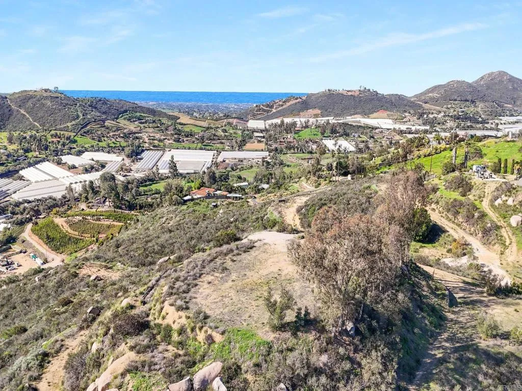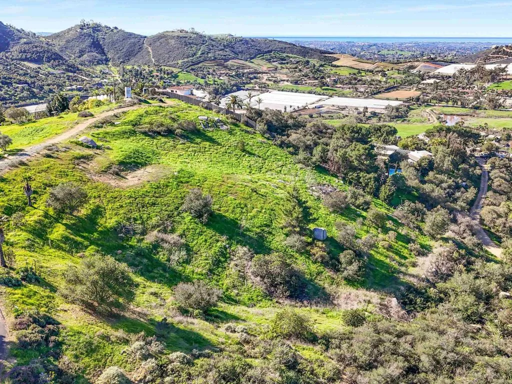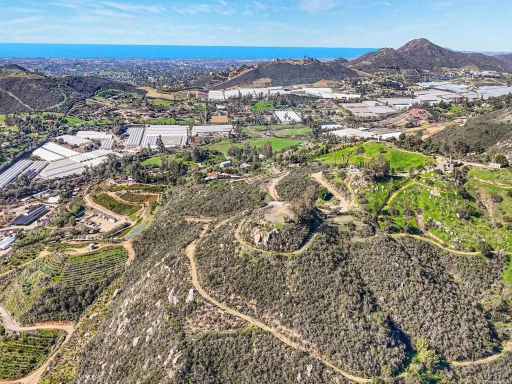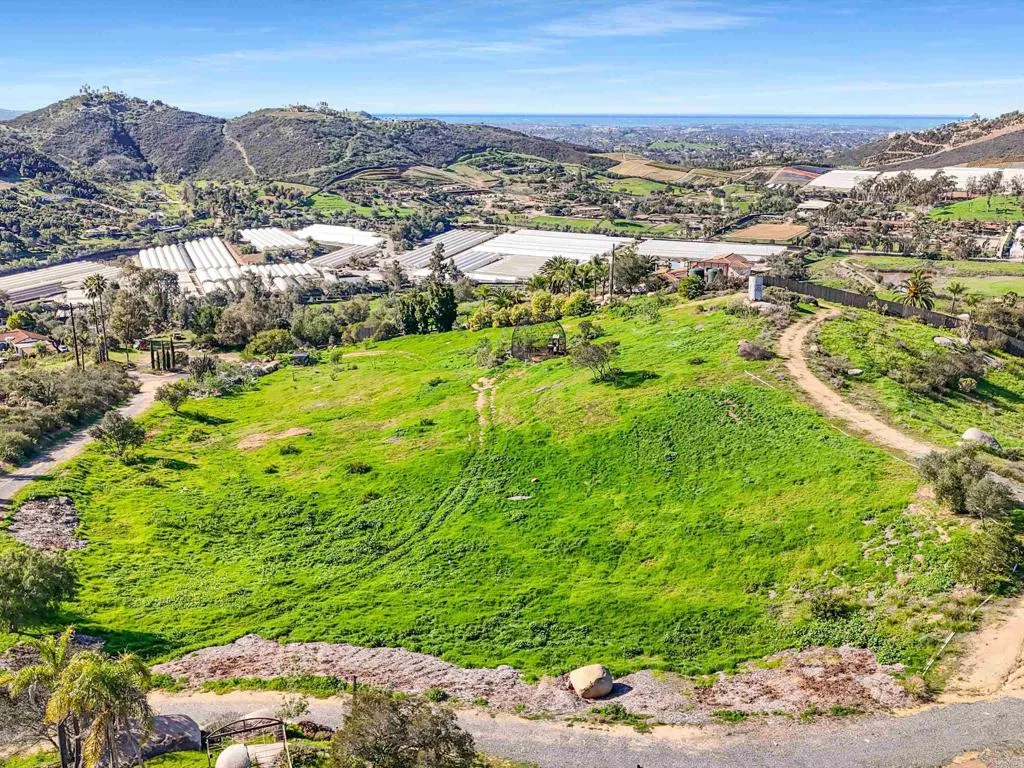 Perched atop the rolling hills of San Marcos, this extraordinary mountaintop property presents a rare chance to own more than 31 acres of ocean-view land with panoramic vistas stretching from the inland valleys to the Pacific. Offering both a 28.72-acre parcel and an additional 3-acre lot, the property is zoned A70 with the sought-after L animal designator, allowing for flexible agricultural and residential uses. Set at approximately 1,175 feet in elevation, the land enjoys uninterrupted 360-degree views, remarkable privacy, and exceptional development potential. County guidelines allowing for 4-acre minimum lot splits create the opportunity to build up to seven custom homes, opening the door for developers, multigenerational buyers, homesteaders, or investors seeking a long-term land hold in one of San Marcos most desirable growth corridors. More than $1 million in infrastructure has already been completed, including a producing private well with a booster pump, two water meters, two electric meters, recently paved access roads, three possible entry points, and multiple flat building pads oriented to capture sweeping views. The property is surrounded by upscale estates, boutique agricultural operations, and peaceful rural retreats, making it a prime location for luxury development, a private family compound, or a self-sustaining homestead.
