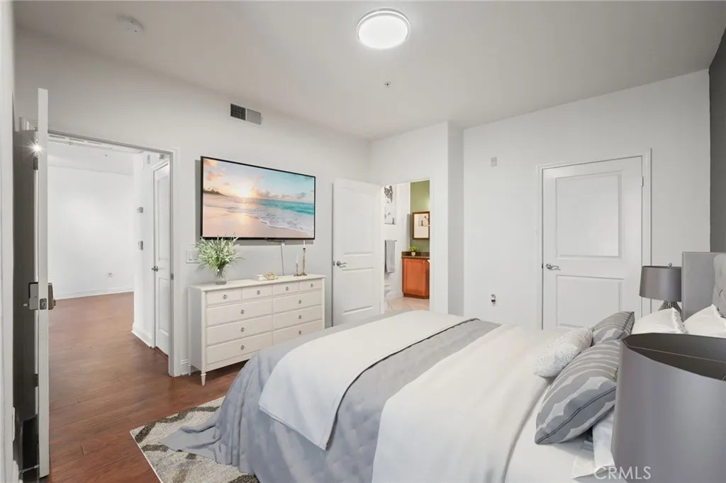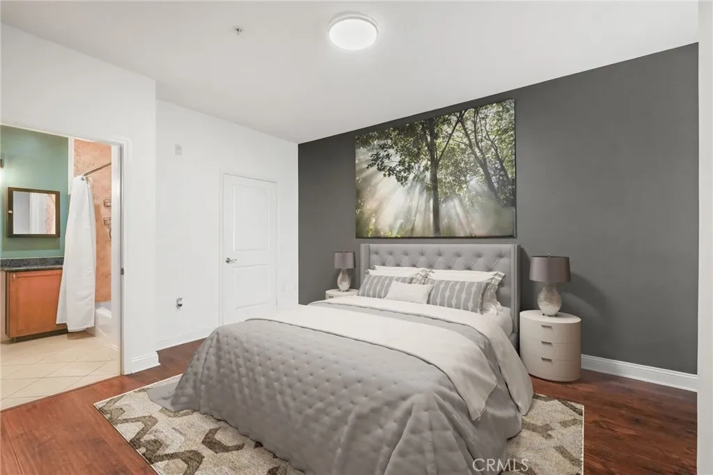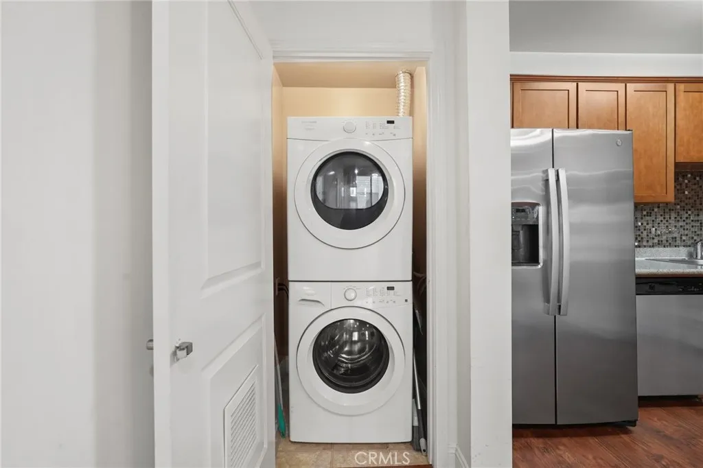 Welcome to this bright and spacious 2-bedroom, 2-bathroom condo located in a secure, Mediterranean-style building in the heart of North Hollywood. This beautifully maintained unit offers an open-concept layout with engineered hardwood flooring and high ceilings. The living room features large windows that fill the space with natural light, along with a sleek gas fireplace that adds warmth and modern appeal. The kitchen is equipped with granite countertops, stainless steel appliances, and ample cabinetry, creating a seamless flow between the dining and living areas. For added convenience, the home includes an in-unit stacked washer and dryer. Both bedrooms are generously sized, and the primary suite features a walk-in closet and an en-suite bathroom with dual vanities, granite counters, and a soaking tub/shower combination. The second bedroom is spacious and conveniently located near the full guest bathroom. The community offers secure controlled access, gated underground parking, a fitness center, and a beautifully tiled central courtyard with seating areas and decorative details. Residents also enjoy access to a rooftop deck with sweeping views of the San Fernando Valley. The HOA includes water, trash, elevator maintenance, and coverage for all building-related issues, leaving the owner responsible only for their electric and gas bills. Located just minutes from the NoHo Arts District, major studios, restaurants, shopping, and freeway access, this move-in-ready home offers comfort, convenience, and modern living in one of LAs most desirable neighborhoods.