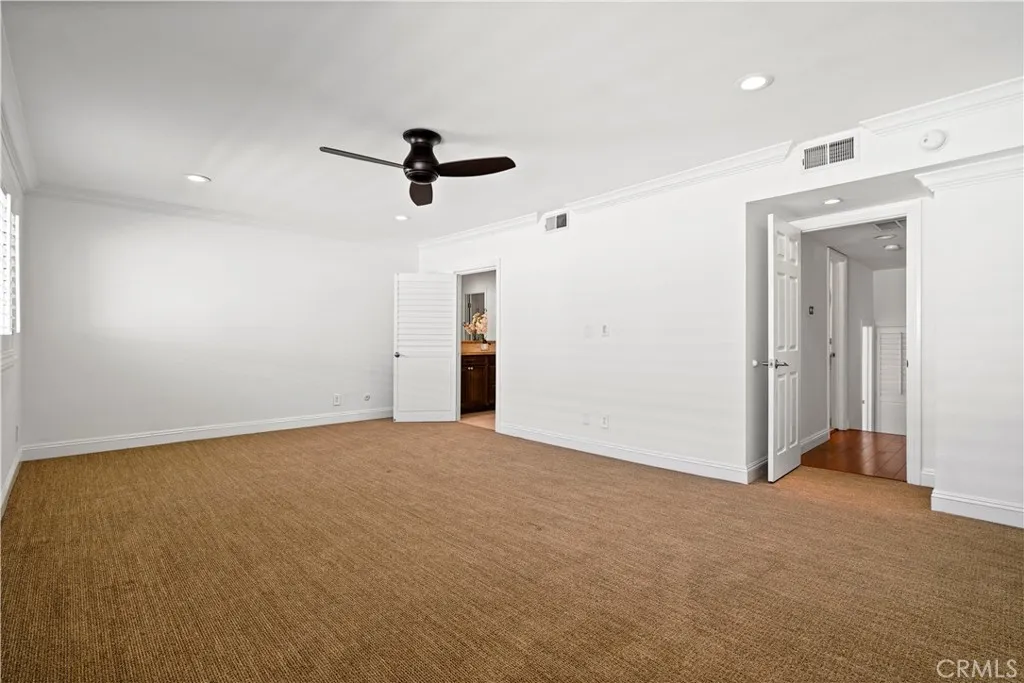 Welcome to this beautifully updated split-level townhome in highly sought-after gated Tarzana Villa North. From the landscaped, secured entrance, to the homes thoughtful multi-level layout and abundant natural light, it offers rare privacy and comfort. A spacious tiled private patio extends your living space, ideal for morning coffee, outdoor dining, or relaxing outdoors. Inside, youll find high ceilings, rich hardwood floors, custom plantation shutters, central air and heat, modern Minka Aire ceiling fans in every room, custom wrought-iron stair railings, wainscoting (wall paneling), crown molding, and crisp white walls for an airy, designer feel across all levels. The elevated dining area overlooks the large living room, creating an open, architectural flow. The kitchen offers generous granite counters, white cabinetry, a wide breakfast bar, custom millwork, and an included Jenn-Air refrigerator in excellent working condition. A spotless, beautifully maintained powder room completes the main level. All appliances, including a near -new matching washer and dryer (pictured) are included. The existing fireplace is decorative; a buyer may choose to replace it or install an electric or modern gas unit. Upstairs, the oversized primary suite easily fits a king bed and seating area. It features a large walk-in closet with full custom-built-ins, and premium Berber-style carpet. The ensuite bath includes a long double-sink vanity, separate makeup area, and a private water closet with walk-in shower. The second bedroom has high ceilings, a custom cedar-lined closet with added cabi
