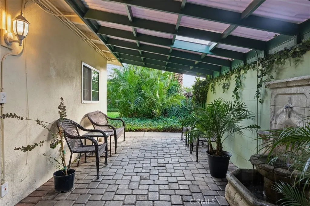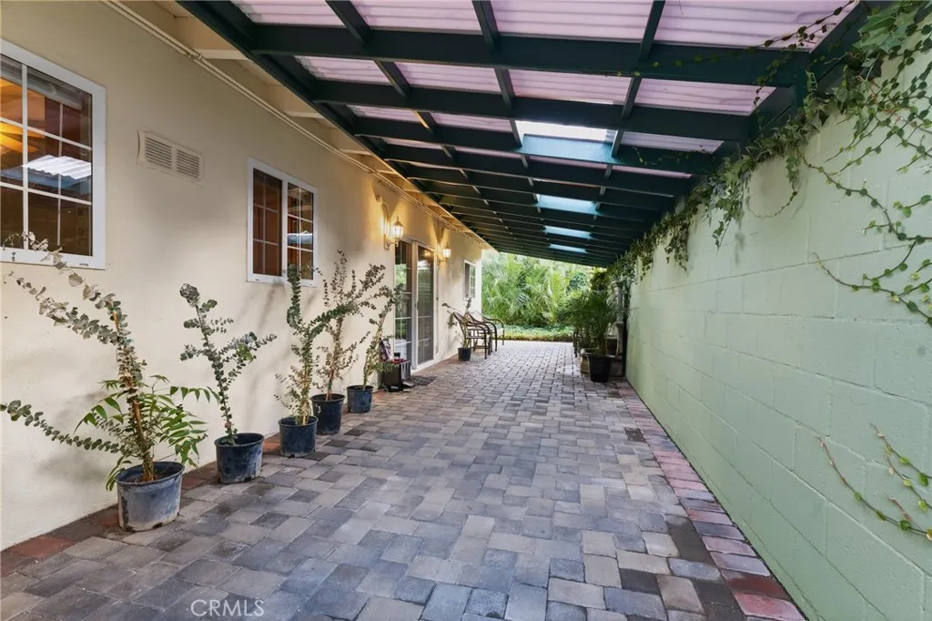 Immaculate single story mid-century ranch home with large backyard situated in a great Woodland Hills neighborhood zoned for highly acclaimed Hale and El Camino charter schools! The property sits back from the street with lush front lawn, mature trees, and paver stone driveway that leads to the attached 2-car garage with direct access. Step inside to find a large living room with high vaulted wood beamed ceiling, remodeled stone fireplace, large picture windows, and wood flooring found throughout. The updated oversized kitchen opens to the living room and boasts high vaulted ceiling, quartz counters with stone backsplash, large peninsula with breakfast bar seating, wood cabinetry, pantry space, and stainless appliances. There is a separate spacious formal dining room off the kitchen which could also serve as a den or office featuring high vaulted wood beamed ceiling, glass slider that opens to the yard, and walk-in storage closet. The three bedrooms are well appointed, each with high vaulted wood beamed ceilings and good sized closets. There are two hall bathrooms, one with bathtub and shower and the other with walk-in shower. The 2-car garage houses the laundry and has built-in storage and can also be used as great bonus space as it has been finished with tiled flooring and has high pitched ceilings. The extremely private and tranquil backyard features a sprawling grass lawn for play and entertaining, an expansive covered patio with skylights, serene water fountain, and paver stones ideal for outdoor dining and gathering; gorgeous mature palm tree, and perfectly manicured