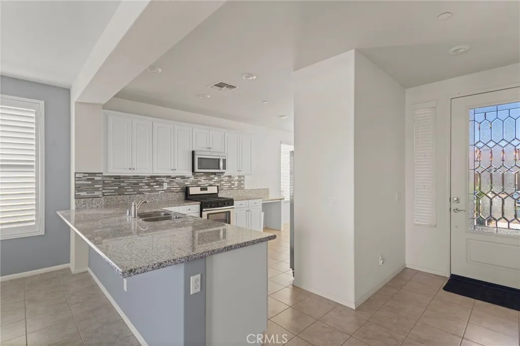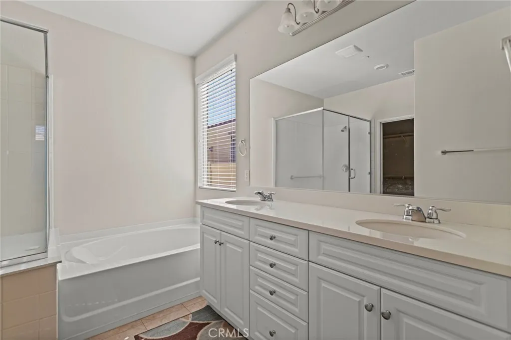 Welcome to Solera at Apple Valley, a highly desirable 55+ community where comfort and convenience meet resort-style living. This charming single-story home features 2 bedrooms and 2 bathrooms, along with a bright, spacious kitchen offering white cabinetry, grey-speckled countertops, a glass-tile backsplash, and stainless steel appliances. The primary suite offers a relaxing retreat with a spa like bathroom offering dual-sink vanity, large soaking tub, and separate walk-in shower with a built-in bench and glass enclosure. Enjoy low-maintenance living with drought-tolerant front landscaping and a beautifully finished backyard featuring a large concrete patio and artificial turf. Additional highlights include direct access to a 2-car garage and access to outstanding community amenities such as the Aspen Clubhouse, pool, spa, and tennis courts.
