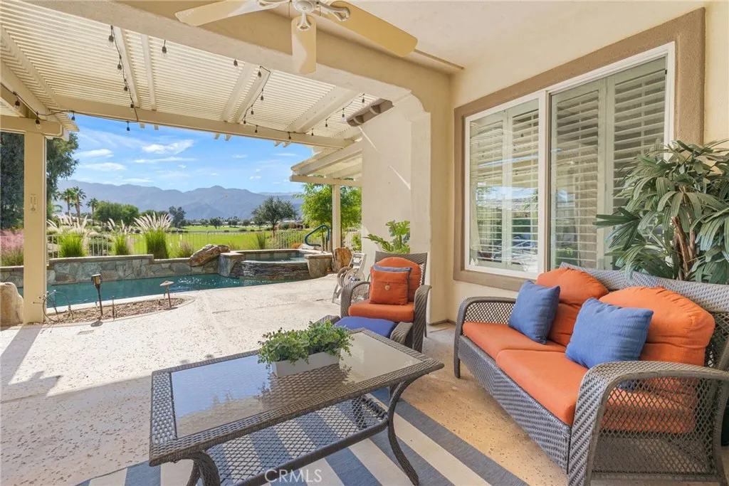 Discover one of the finest views in Trilogy La Quintas 55+ resort community. This exceptional Tamarisk modelwith over 2,700 sq. ft., 3 bedrooms, 4 baths, and a private casitaoverlooks two fairways and a serene lake, offering a truly breathtaking backdrop. Inside, the gourmet kitchen shines with stainless steel appliances, slab granite countertops, a large center island, trash compactor, custom stone backsplash, pantry, ceiling fans, and a cozy breakfast nook. The formal dining room captures beautiful views of the mountains and pool, perfect for elegant gatherings. The spacious great room is designed for comfort, featuring an entertainment niche, surround sound, ceramic tile flooring, and custom window treatments. A separate den can easily function as an additional sleeping space, and the powder room serves as a three-quarter bath for added convenience. The primary suite offers upgraded recently remodeled dual vanities, a large beautiful shower, and a walk-in closet. All bedrooms are upgraded with new carpet, custom drapes, insulating drop-down shades, ceiling fans, and updated fixtures. The casita is perfect for caretaker, guests or extended stays. Outdoors, enjoy beautiful dual paved patios with patio roof shade structures, framing a sparkling saltwater pool with waterfalls and rockwork, and spa ideal for relaxation or entertaining. The three-car garage comes fully outfitted with built-in cabinets, a workbench, and an evaporative cooler. A rare combination of luxury, comfort, all with one of Trilogys most remarkable views.