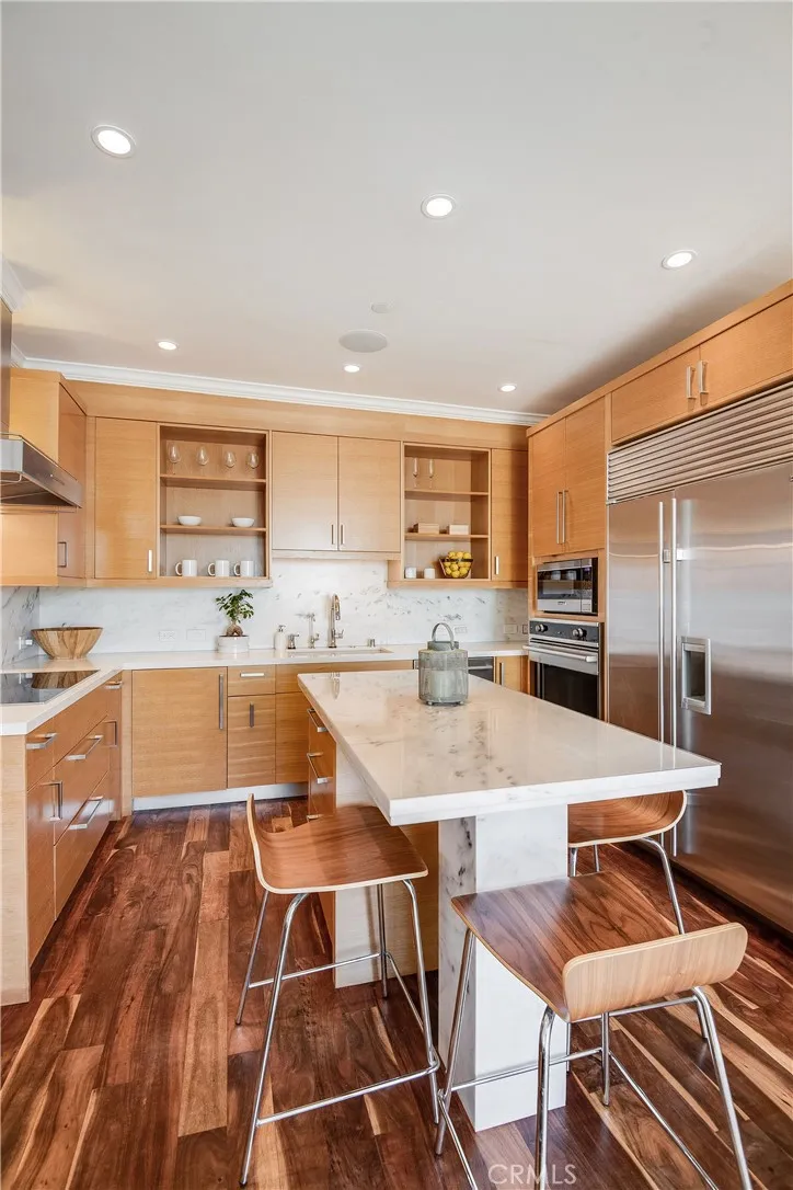 Discover this stunning 2-bedroom area retreat in the heart of Central Malibu, blending coastal luxury with effortless living. Adding to your living experience - not included in the square footage - are highly improved expansive outdoor covered patios with breathtaking ocean vistas, an enhanced bonus room, and an oversized garage with floor-to-ceiling ocean-view windows for versatile storage, hobbies, or workshops, all of which extend your indoor space for a sense of boundless grandeur. The gourmet kitchen is a chefs haven, featuring pristine Carrara marble countertops and premium appliancesincluding a state-of-the-art Sub-Zero refrigerator, Miele, and Viking models. A generous island with breakfast bar invites casual meals and gatherings. Adapt the versatile bonus area as a home office with convenient adjacent shower or a dedicated gym. Spa-like bathrooms blend Carrara marble accents and travertine flooring for serene relaxation. Inside, the bright open-concept layout showcases panoramic views, abundant natural light, and a sophisticated neutral palette. Gleaming solid Brazilian tiger wood floors and elegant travertine tile floors flow underfoot, enhanced by sleek recessed lighting. The fully finished garage offers mesmerizing ocean panoramas, while the living room flows seamlessly to an oversized balcony for al fresco dining amid crisp sea breezes and hillside vistas. This three-level home optimizes flow: garage on top, main living areas and two bedrooms in the middle, and bonus area below. Centrally located, enjoy easy Pacific Coast Highway access, nearby hiking trails, b