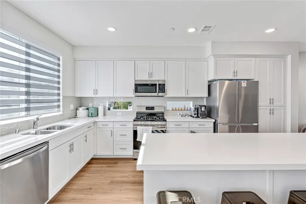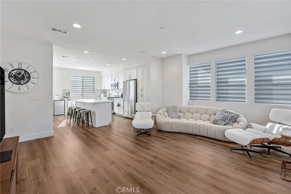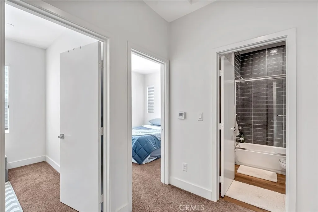 Welcome to VOLARA Community, built by Bonanni Development. Turnkey house. Ready to move in. Built in 2022, this corner unit home combines stylish upgrades with PAID-OFF SOLAR and low-maintenance living. Seller spent $15,000 for the premium double shades for the all the windows, landscaping, white kitchen cabinets and all the doors etc... Gourmet kitchen includes island space, generous dining area and state of the art stainless steel appliances. WALK TO PORTOLA PARK. Plan 3 property is an END LOCATION that offers entry level bonus/work from home space off the direct access, attached 2-CAR garage! The Great room design has a powder room and a walk out deck. Upstairs there are three bedrooms with two full baths and ample closets. The Primary suite offers dual sinks, oversized shower with hand set tile and walk in closet. La Habra is a terrific neighborhood, with many parks and the La Habra Children's Museum just across the street PLUS Excellent schools, part of the Fullerton Joint district. GFI-protected waterproof outlets at front and rear of home. Premium exterior light fixtures, Open floor plans, 9ft ceilings throughout Vinyl-plank wood-look flooring in all main living areas including, entry landings, living, dining, and kitchen areas. 2 door casings and 5 baseboards throughout. Whole House Fan, 30 four-burner gas freestanding range/oven, 24 built-in microwave, 4-cycle dishwasher, Quartz countertops with 6 backsplash throughout. Large stainless-steel sink, Designer shaker style cabinetry with ample storage in a wood finish. Full ceramic tile master shower surrounds. Elegan