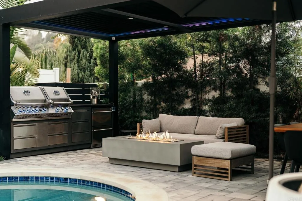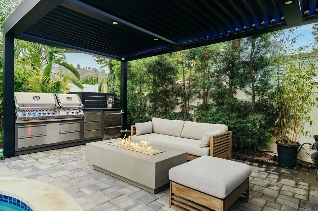 Welcome to this custom newer-built modern residence, a thoughtfully designed single-story home with pool that blends architectural style with elevated comfort. Behind the sleek faade, and fully gated with a motorized front gate, the home features along private driveway that provides an abundance of parkingan exceptional convenience rarely found in homes of this caliber. Inside, wide-plank wood floors, oversized windows, and a refined mix of black, white, and natural finishes create a warm yet upscale atmosphere throughout.At the center of the home, the chefs kitchen showcases a 36" Bertazzoni 5-burner gas stove, built-in monogram refrigerator, quartz countertops, high-gloss cabinetry, a walk-in pantry, and a built-in wine rack. The open living and dining areas connect seamlessly, enhanced by recessed Bluetooth speakers that fill the space with sound and elevate both entertaining and everyday living.The primary suite offers a serene retreat with a custom-built out closet and a beautifully appointed bathroom, featuring a dual vanity and oversized walk-in shower clad in modern tilework. Additional bedrooms are generously sized and well positioned for comfort and privacy. Designed for resort-like living, the backyard features a sparkling salt water heated pool with all newer equipment, surrounded by lush tropical landscaping for total privacy. The outdoor space features, lounge area, space for your bbq, a custom louvered pergola with built-in lighting and a linear fire feature create the perfect setting for year-round enjoyment. Completing the property is a rooftop deck above t