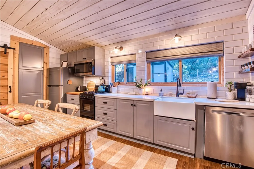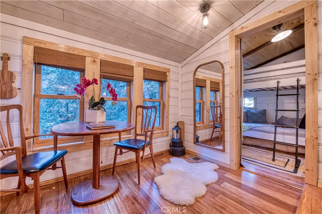 This fully refreshed 2-bedroom, 1-bath home has been remodeled with care, offering a warm and comfortable single-level living experience thats truly move-in ready. With its peaceful setting and turnkey updates, the property has also been a SUCCESSFUL VACATION RENTAL, though buyers should verify all rental requirements and possibilities with the county. The covered entry opens to an inviting living room with a stone fireplace, connecting to a bright kitchen with white stone counters, an oversized sink, tile backsplash, and stainless appliances. Dual-glazed windows, a blend of restored fir floors and new composite wood, and forced-air heating help keep the home cozy in every season. The primary bedroom leads to a private balcony with forest views and a glimpse of San Bernardino Peak, while the updated bathroom connects to a second bedroom with bunk beds for added versatility. Outside, two detached sheds provide convenient storage, and the backyard now includes a fun dart/game area along with neatly organized firewood for easy use.