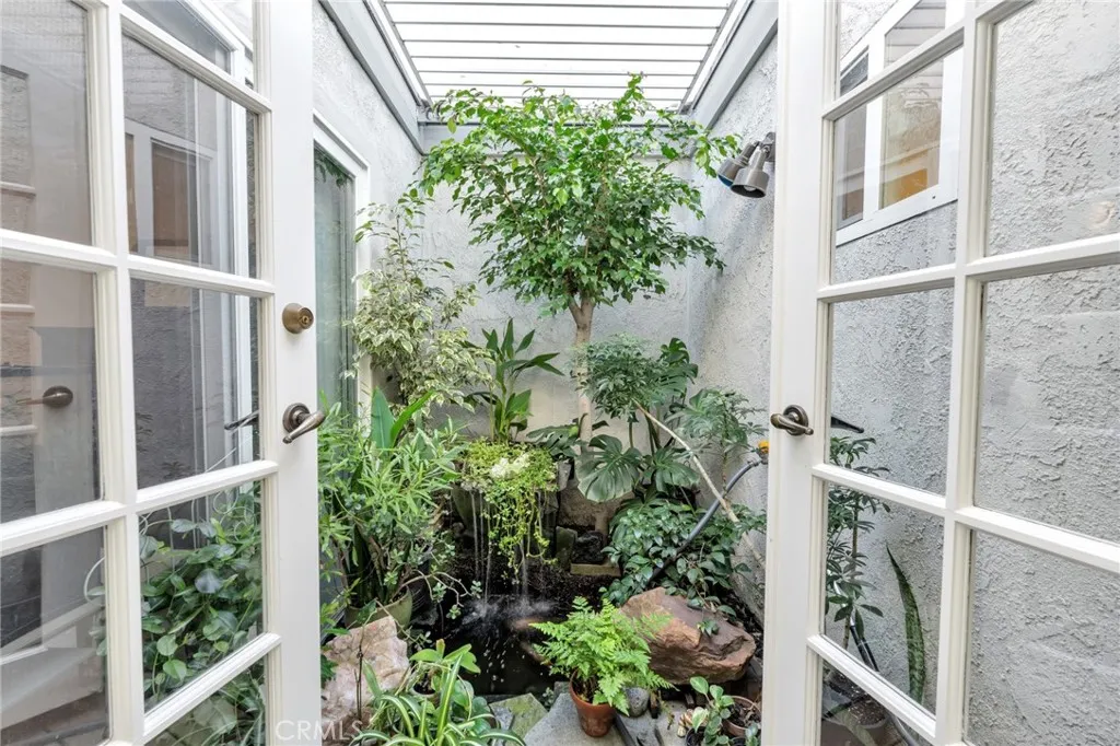 Tucked away at the end of a quiet street in Aegean Heights, this distinct single-level end unit is enveloped by landscaped gardens and serene grassy hillsides, offering privacy and natural beauty. At the heart of the home is a stunning atriuma true sanctuaryfeaturing a complete pond ecosystem with circulating pump, waterfall, lush plantings, and an automatic timer. Screened doors allow you to keep the atrium open year-round for the ultimate indoor-outdoor experience, with direct access from both the entryway and guest bedroom. The dining room and kitchen feature lush views of a garden, lawn area and hillside, while the remodeled 2020 kitchen impresses with soft-close cabinetry, pull-outs, deep storage, granite countertops, stainless steel appliances, and under-cabinet lighting. The tasteful fireplace remodel and smart, adjustable lighting elevate the living areas, complemented by sensible flooring for the active lifestyle. The primary suite delivers new carpet, keyless entry, and direct access to the private back courtyard with hot tub. The newly carpeted guest bedroom includes atrium access to soothe the soul. Home systems that are synced to Kasa app integration include lighting, garage door, alarm, and cameras, plus ceiling fans, attic fans, and A/C for year-round comfort. The third bedroom currently serves as an office with direct access to the garage. Should you choose to wall off the garage access in the third bedroom, there is an additional door to the garage near the entrance. The oversized garage includes extensive built-in storage, a deep workshop area, and a spaci