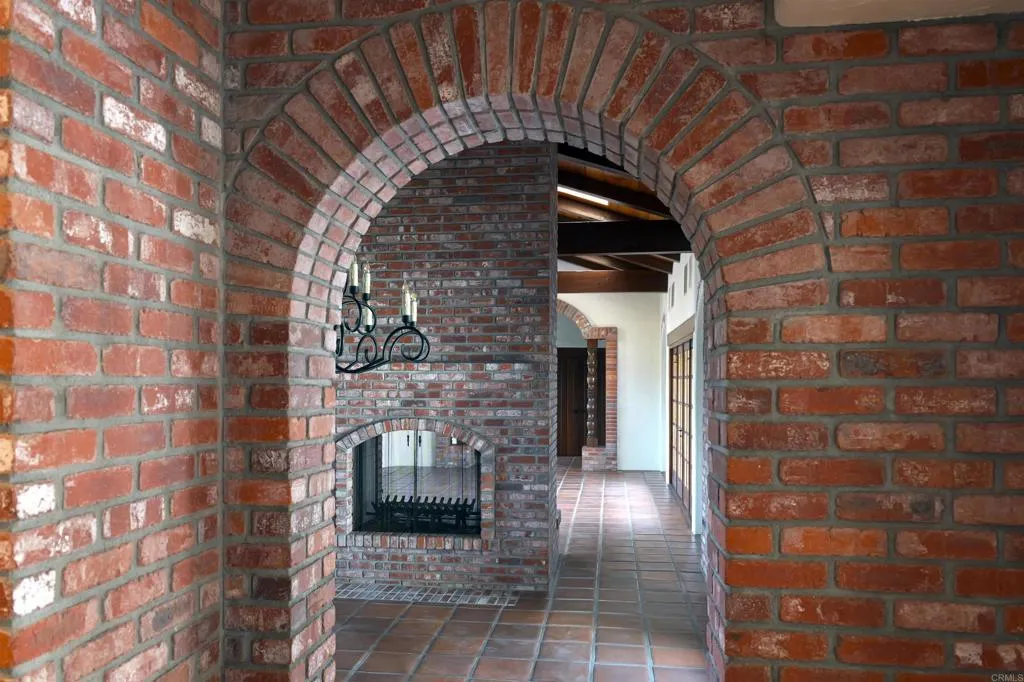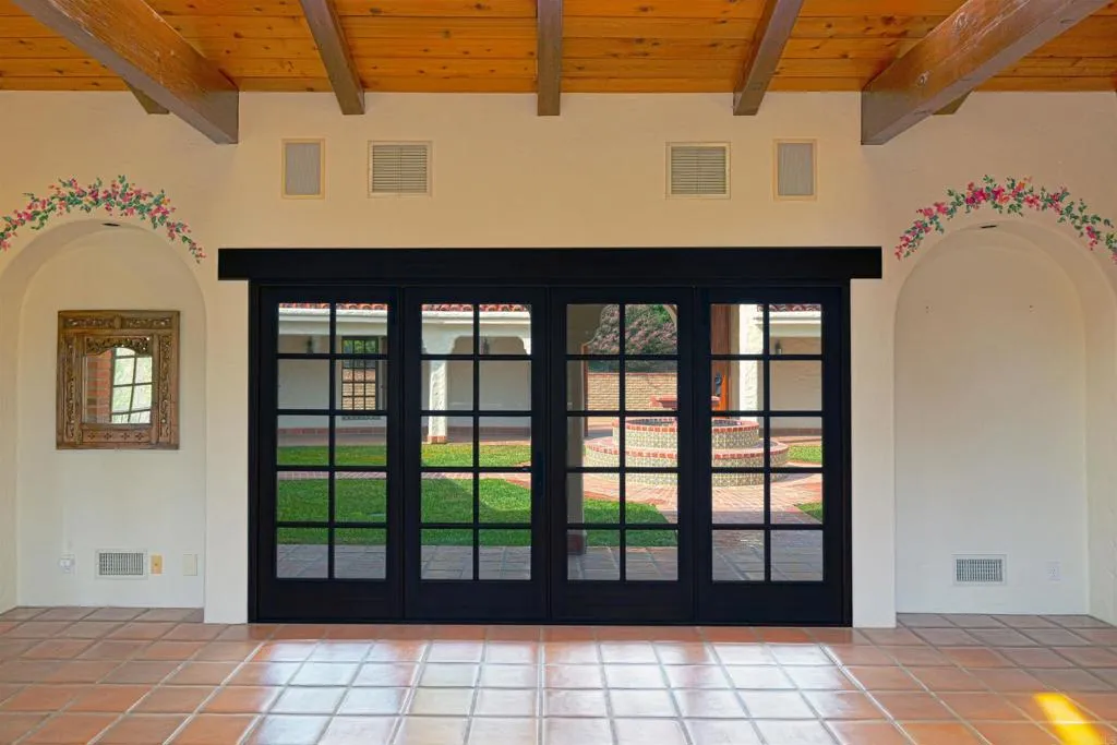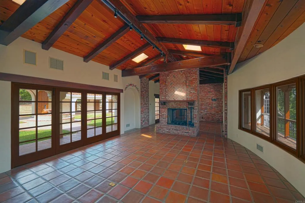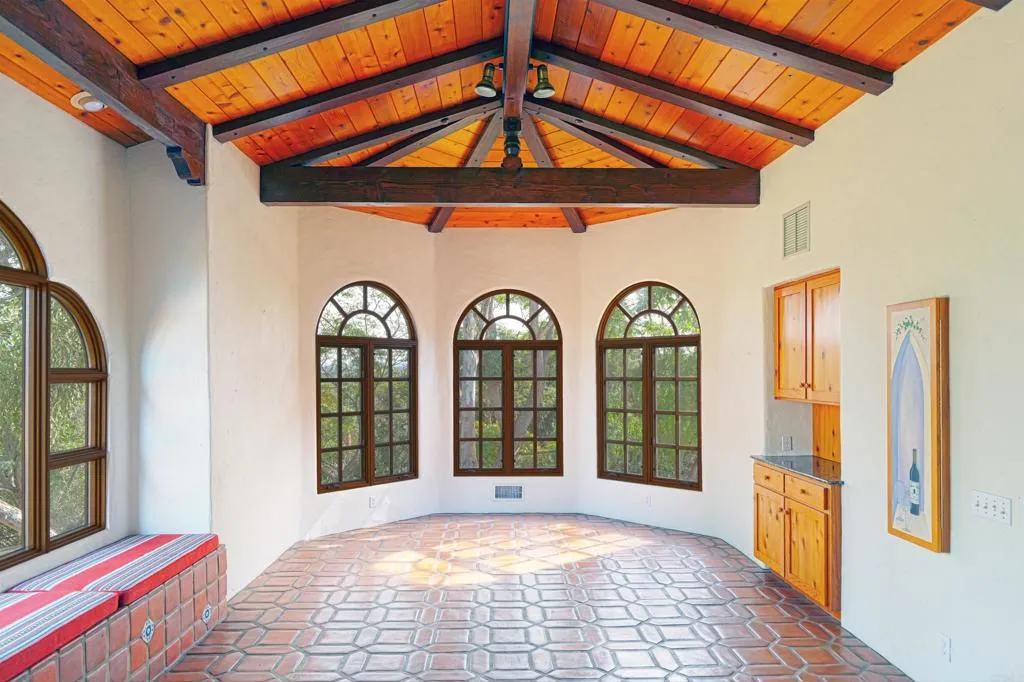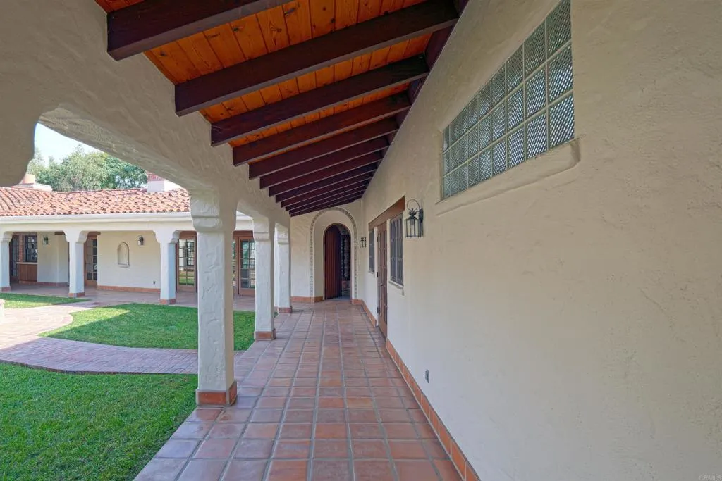Ralph H. Reisinger-designed 1994 Spanish hacienda, single-owner, never remodeled, original condition. 4 BR | 3.5 BA | 3,774 sq. ft. Classic U-shaped plan centers on a tiled Cantera fountain courtyard. Deep covered arcades wrap three sides with banks of French doors opening from nearly every room. Saltillo tile floors indoors and out. Exposed beam ceilings, arched doorways, barrel-arch passageways, four fireplaces (two-sided living-dining, family room, primary). Primary wing: bedroom with fireplace, sitting room, walk-in closet, en-suite + adjacent private study with separate courtyard entrance. Guest wing: Two ground-floor bedrooms and a second-story casita with full bath and large loggia overlooking courtyard and southern valley. Covered outdoor kitchen/grill in arcade. 3.18 gently sloping acres with mature gardens, eucalyptus, citrus, lawns and room for guest house, pool, tennis, stables or vineyard. Deep drive-through garage. Authentic Cliff May-inspired Covenant hacienda with expansion land.