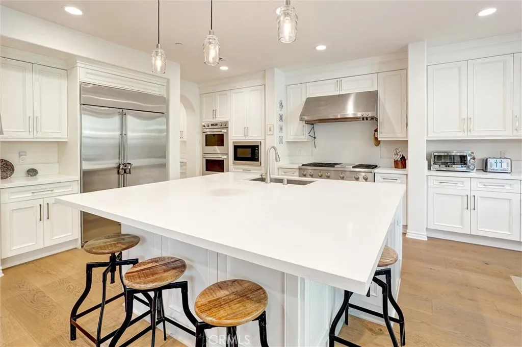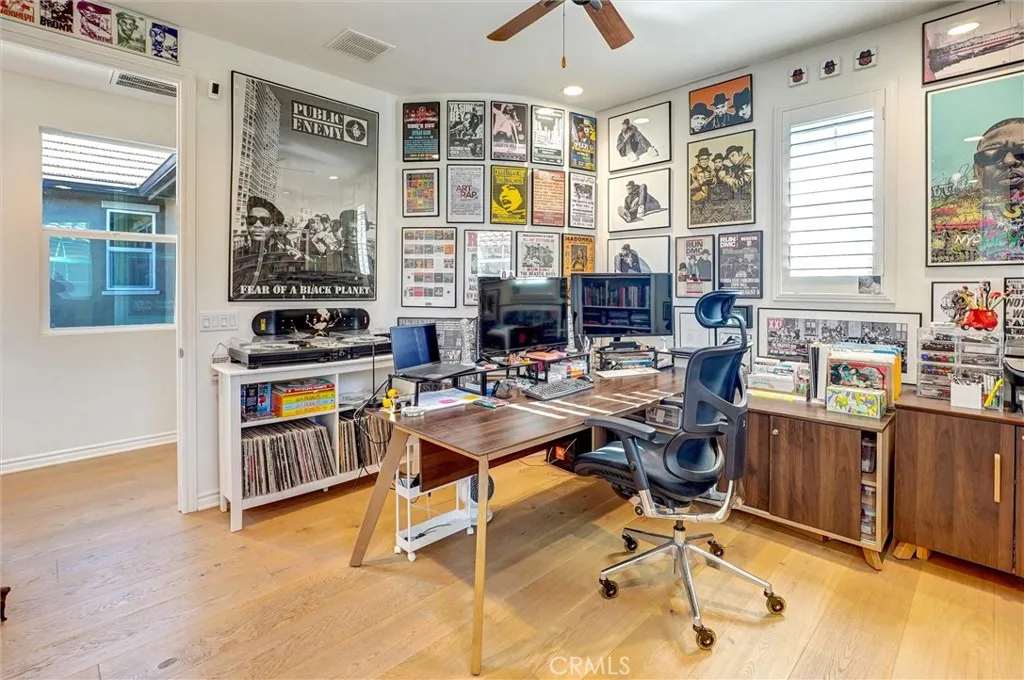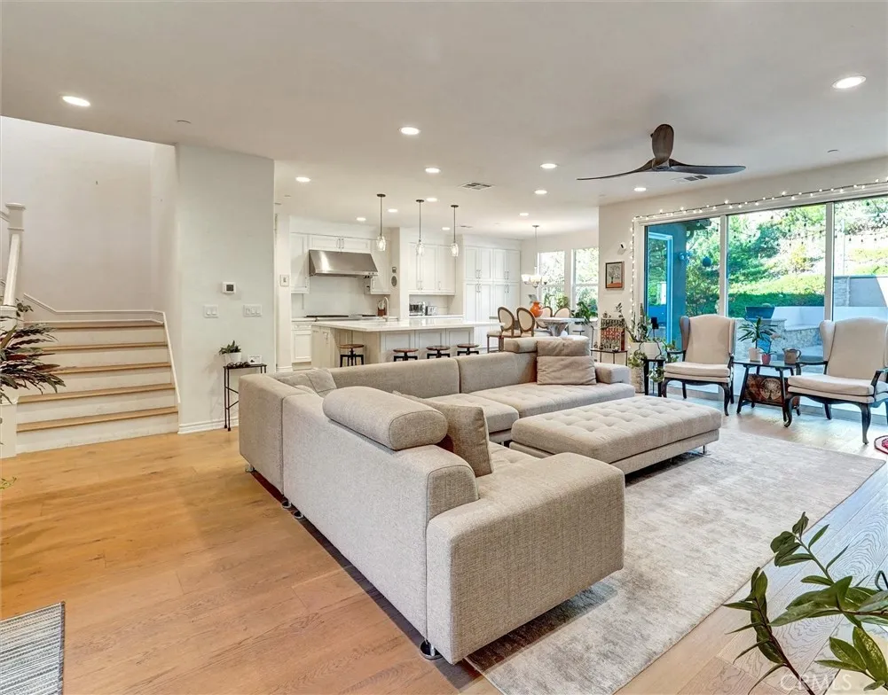This luxurious home has been thoughtfully upgraded for modern, comfortable living. Located in the prestigious, gated community of Meridian Hills, it sits just minutes from the exquisite Moorpark Country Club. One of the most desirable floor plans in the neighborhood, this residence features a spacious light-filled atriumcomplete with a dog door suitable for small to medium pets. While four bedrooms are located upstairs, a private bedroom with its own full bath is conveniently situated on the main floor, ideal for guests, a housekeeper, or multigenerational living. Rich hardwood floors run throughout the entire home, complemented by custom shutters in most rooms. The serene Primary Suite is a true retreat, offering a spa-like bathroom with soaking tub, oversized shower with upgraded glass enclosure, dual vanities, and two spacious his and hers walk-in closets. The open-concept living area centers around a gourmet kitchen with upgraded countertops and moldings, a large island perfect for gatherings, soft-close cabinetry, and a refrigerator in butlers pantry. The home is also equipped with interior fire sprinklers for added peace of mind. Outdoor living is equally impressive. Three tranquil water features are located in the front yard, atrium, and backyard sitting area complete with a fire pit. The backyard is an entertainers dream, showcasing travertine pavers, a side paver walkways on both sides of the home with circular detail on one side, and a pathway with steps leading to an elevated custom seating area with city views. A custom awning imported from Germany shades the ma