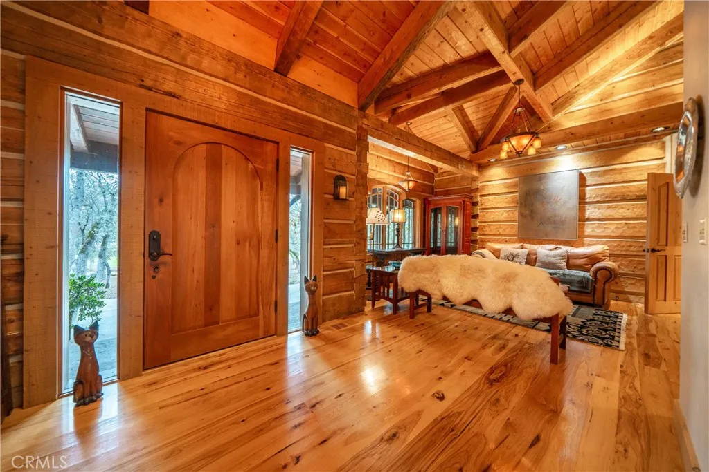 Incredible Custom Hand-Hewn Log Home on 5 Private Acres Prepare to be amazed by this one-of-a-kind, custom-built hand-hewn log home that perfectly blends rustic charm with modern elegance. *Scan the QR code (picture #2) to experience a 3D Virtual Tour!* Featuring 12-foot walls and soaring 25-foot ceilings, this architectural masterpiece offers a warm yet luxurious atmosphere throughout its nearly 3,500 sq. ft. of living space. Inside, you'll find hickory plank hardwood floors, granite countertops, and a commercial-grade chef's kitchen equipped with premium appliances. The stone hearth wood-burning fireplace creates a stunning focal point in the great room, while arched windows fill the home with natural light and showcase views of the surrounding landscape. With 4 spacious bedroomseach featuring at least one wall of exposed logsand 3.5 beautifully appointed bathrooms, this home offers both character and comfort. Step outside to enjoy the full wraparound covered porch, perfect for relaxing or entertaining. The in-ground gunite pool, garden boxes, and built-in fire pit make outdoor living exceptional. A poured concrete driveway and sidewalks are finished with natural, wavy edges and etched twig-and-leaf details for a custom artisan touch. Additional highlights include a Metal Class A fire-rated roof, detached 4-car garage, detached metal shop, and walking paths throughout the property. Every inch of this home reflects craftsmanship, creativity, and care. This absolute stunner and truly one of a kind was featured in Log Home Design magazine and found a spot in Redding, Califor