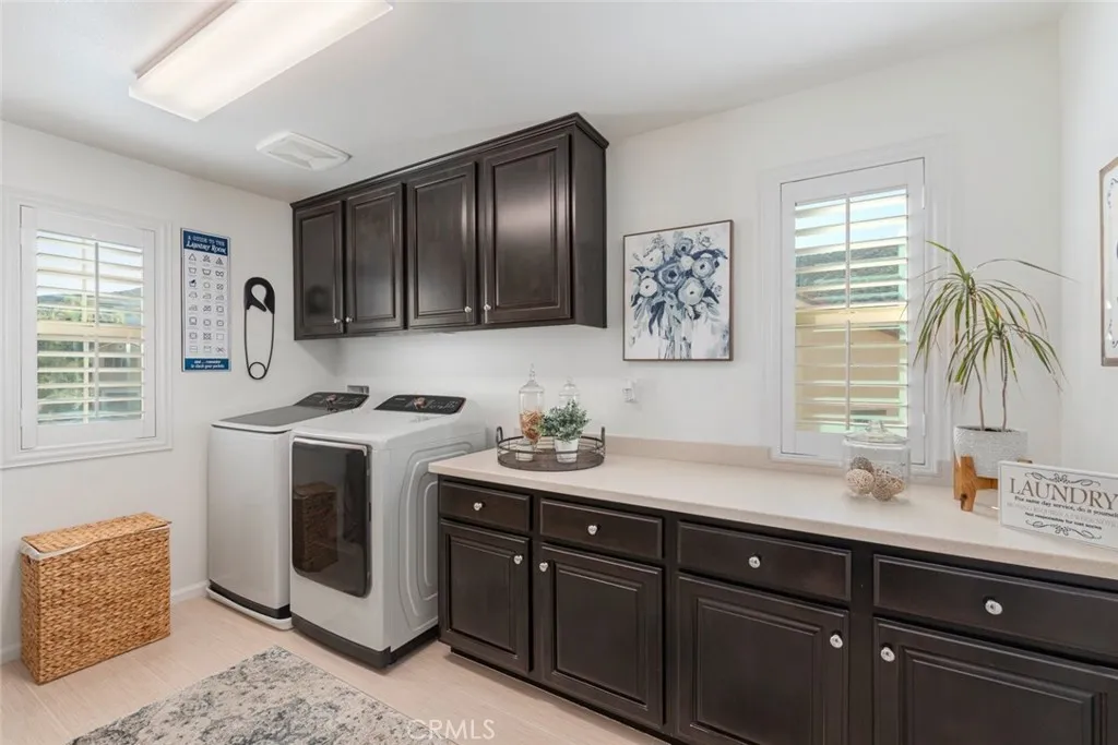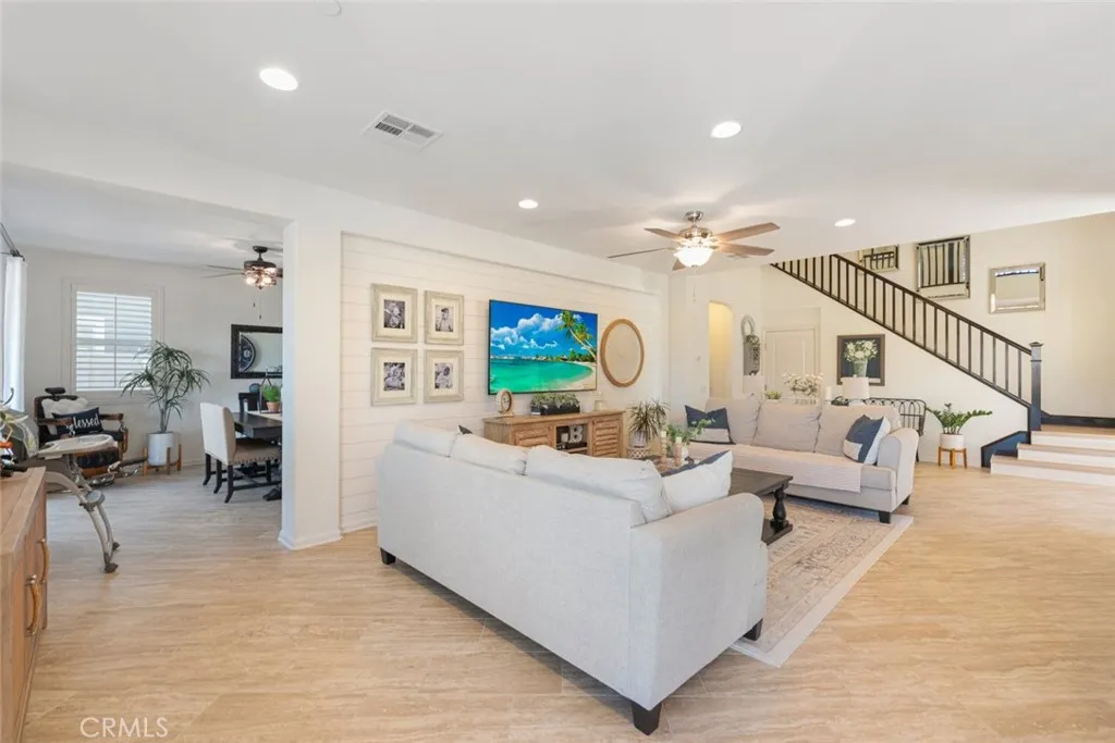 Situated at the end of a cul-de-sac, this immaculate home boasts magnificent curb appeal and shows just like a model. Pride of ownership radiates throughout every inch of this beautifully maintained residence. A decorative leaded-glass entry door welcomes you into a warm and inviting great room highlighted by a stylish shiplap accent wall. The gourmet chefs kitchen is a true showpiece, featuring stainless steel appliances, a decorative backsplash, an ample center island with sink and counter seating, elegant pendant lighting, and a large walk-in pantry. Conveniently located on the main floor is a full downstairs bedroom, ideal for guests, multigenerational living, or a private home office. A beautifully remodeled downstairs bathroom adds even more functionality. A majestic stairwell with upgraded banister leads to the open second floor, which includes two additional bedrooms and a spacious den that can easily serve as a fifth bedroom. The oversized upstairs laundry room offers abundant cabinetry and plenty of space to handle even the most overdue loads. The generous master suite impresses with a decorative shiplap accent wall, crown molding, and beautiful views of the local hills. The luxurious master bathroom features a walk-in shower, separate soaking tub, and dual walk-in closets. Additional interior highlights include elegant tile flooring, engineered wood floors, window shutters, and ceiling fans throughout. Step outside and access your entertainers dream backyard through the upgraded 12-foot slider in the kitchen or the second slider in the dining area. This outdoor s
