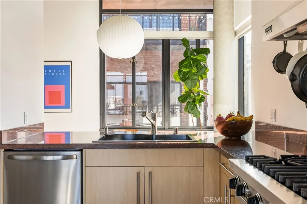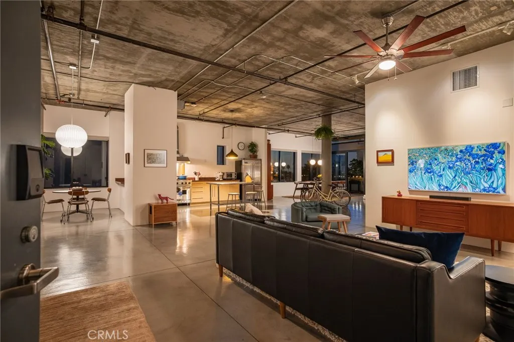 Perched on the top floor of the iconic Temple Lofts, this corner unit delivers the kind of design, light, and privacy that define true loft living. With nearly 1,800 square feet of open space, this one-bedroom home blends industrial architecture with modern upgrades in a way that feels both refined and effortlessly cool. The northwest-facing orientation is a standout featurefloor-to-ceiling windows capture treetop views, wide-open sky, and colorful sunsets, filling the space with natural light all day long. Because of its corner location within the complex (facing 9th St), you get an uncommon sense of openness and privacy thats rare in urban living. The private balcony extends your living space outdoors, making this home feel even larger and more connected to its surroundings. Inside, polished concrete floors, soaring ceilings, exposed ductwork, and clean architectural lines set the tone. The chefs kitchen features stainless steel appliances, granite counters, and a freestanding island perfect for cooking, hosting, or casual dining. The layout flows effortlessly between living, dining, working, and lounging momentsideal for those who value both style and functionality. A newly added full-height bedroom wall creates a fully enclosed primary suite while preserving the lofts open flow, enhanced by a custom floor-to-ceiling primary closet and a beautifully designed entry closet, both by California Closets. Originally built in 1927 as the Long Beach Masonic Temple, Temple Lofts is a celebrated example of adaptive reuse, where key architectural elements were thoughtfully preserve