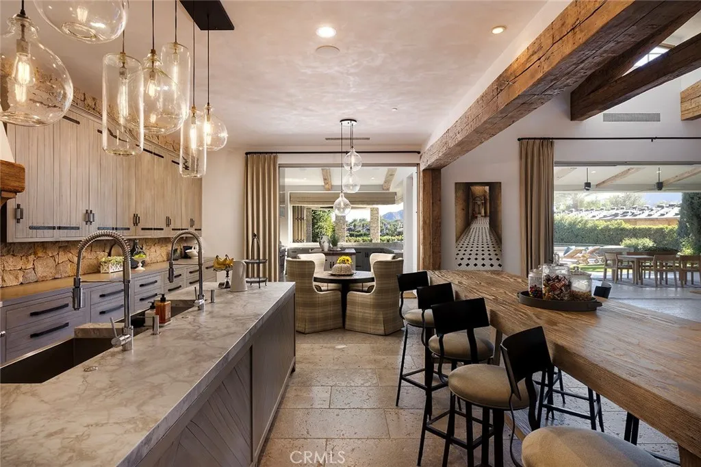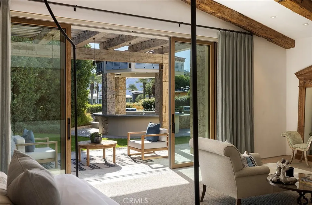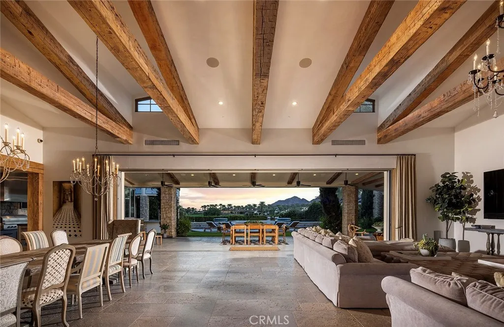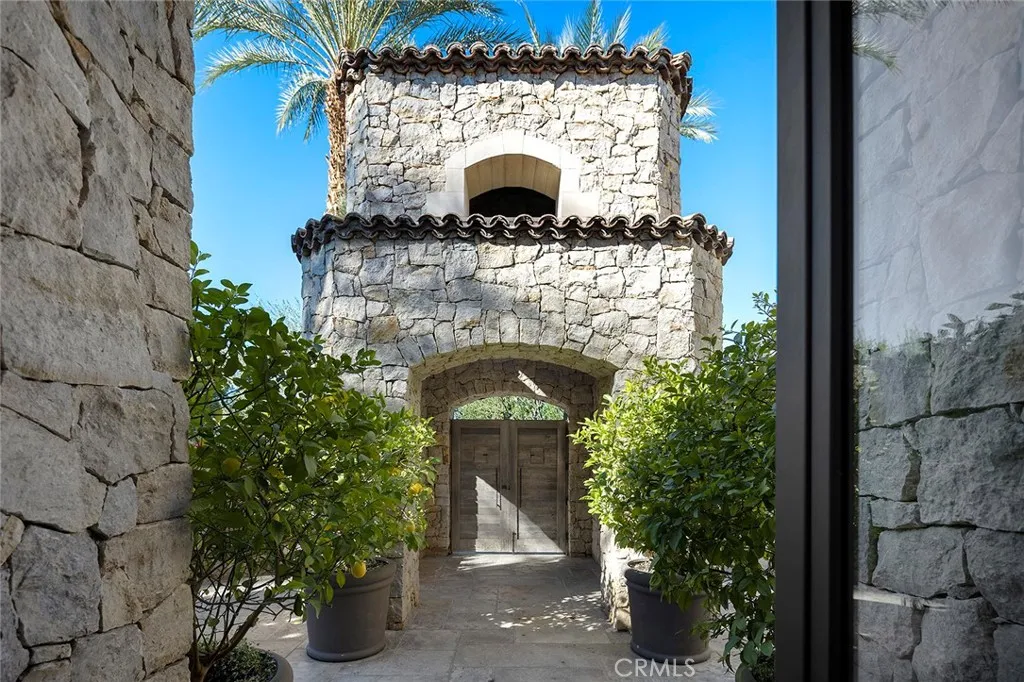 Prestige meets panorama on more than 250 feet of commanding frontage, where this contemporary French Country estate rises across one of Toscana Country Clubs most coveted settings. Perched on an expansive, view-rich parcel, the residence frames mountain silhouettes and double-fairway vistas that feel almost unreal. Stone portico architecturecrowned with a bronze ship bell from the USS Avery Islandcreates an unforgettable arrival before giving way to a sun-filled courtyard. Inside, nearly 10,000 square feet unfold with dramatic scale: soaring vaulted ceilings, a sculptural fireplace, and hand-hewn Pennsylvania barnwood beams elevate the great rooms warm sophistication. Culinary artistry takes center stage in a chefs kitchen accented by a stone feature wall, Wolf and Sub-Zero appliances, a climate-controlled wine room, and three distinct indoor dining experiencesincluding a grand 22-person formal dining area, a high-top bar for casual gatherings, and a corner nook ideal for intimate morning meals. Disappearing sliders dissolve the boundaries between inside and out, revealing a covered veranda and resort-worthy grounds that include a black-bottom infinity pool, stone gazebo bar, sunken fire pit, and a fully enclosed, climate-controlled indoor/outdoor kitchen crafted for effortless year-round entertaining. Mature landscaping embraces the property on all sides, heightening serenity and privacy. Retreat into a dual-primary layout offering flexibility and luxuryone suite shaped by exceptional calm with a dramatic fireplace, pocketing doors, and a marble bath opening to secluded ga