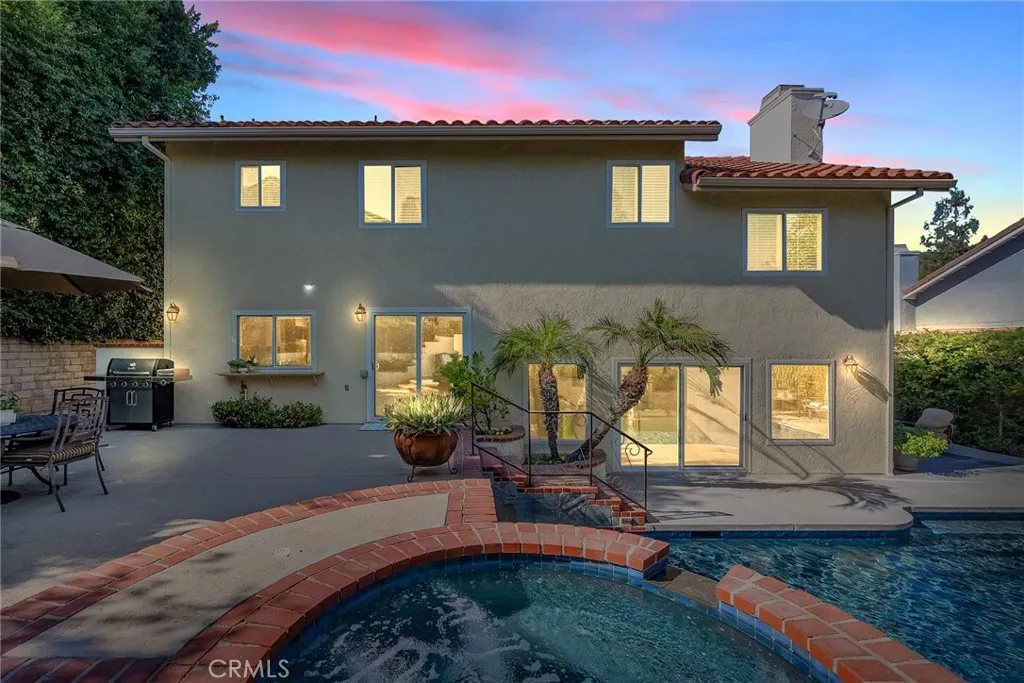 Truly spectacular West Hills pool home in the much sought after Castle Peak Estates and the Las Virgenes School District. Beautifully remodeled, this 4 bedroom, 3 bath sunlit home is the largest and most popular Castle Peak floor plan with almost 2900 sq ft of open living space. Enter this beautiful home through the custom glass doors and step into the large foyer. You will be greeted with soaring ceilings, picture windows, custom fireplace that looks like a piece of artwork, travertine floors, recessed lighting and dual pane windows. The heart of the home is a spectacular grand kitchen featuring a 9f ft center island with prep sink, and separate dining space perfect for entertaining, granite counters, stainless appliances including a built in Dacor fridge, double oven, warning drawer, 5 burner-gas cooktop and pot filler. The kitchen seamlessly flows into the enormous family room with custom maple cabinetry, a second fireplace and powder room. Outdoors, enjoy resort-style living with pool, spa and 4 separate lounging and dining areas all surrounded by lush landscaping. Upstairs you will find the spacious primary retreat with custom built-in cabinets, large walk-in closet and primary bath with soaking tub. The three additional bedrooms and bathroom are all spacious in size. Additional highlights include a 3-car garage, light filled interiors, and premium finishes throughout with tons of storage. This home offers the ideal blend of modern comfort and entertainer's flair in an enviable school district.