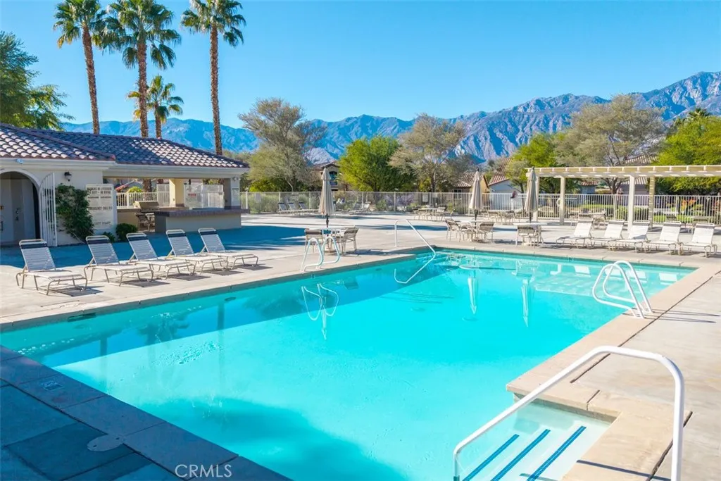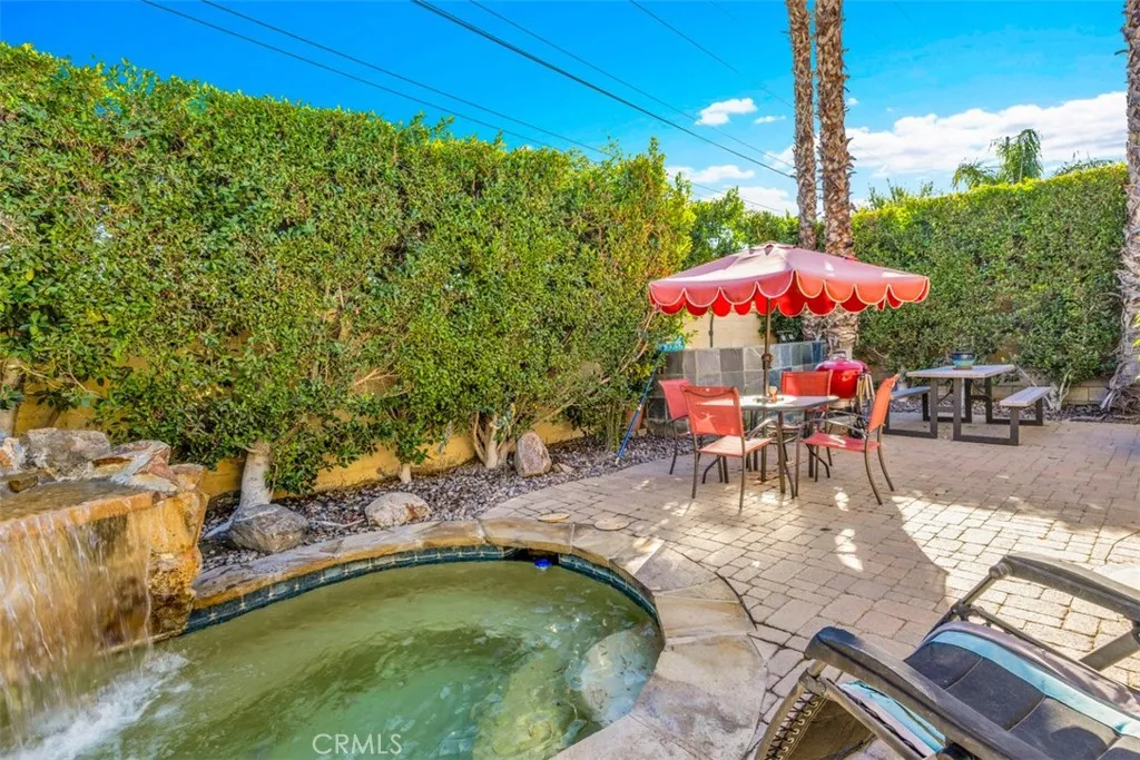Nestled inside the secure, gated community of Cimarron Coveone of Cathedral Citys most desirable neighborhoodsthis beautifully maintained home offers the perfect blend of comfort, style, and resort-like living. Featuring 3 bedrooms and 2.5 baths, this property welcomes you with spacious open-concept living and dining areas, enhanced by elegant slate tile flooring and soaring ceilings that create a bright, airy atmosphere. The upgraded kitchen is a standout, showcasing granite countertops, a large granite island, upgraded cabinetry, stainless steel appliances, and a built-in wine fridgeideal for cooking, entertaining, and everyday convenience. The downstairs primary suite is a peaceful retreat with a walk-in closet and a double-pane slider that opens to the backyard, offering a relaxing connection to the outdoor space. Upstairs, youll find two generously sized guest bedrooms, a full bathroom, and a dedicated laundry room. Additional home features include dual-zone HVAC, window blinds throughout, and a direct-access 2-car garage with excellent storage and included washer/dryer. The low-maintenance backyard includes a unique, intimate dipping pool with a waterfall, creating your own peaceful hideaway. An important added benefit: this home is equipped with SOLAR and a backup battery system, dramatically reducing energy costs and providing extra peace of mind. Cimarron Cove offers exceptional community amenities, including a pool, spa, BBQ area, basketball court, playground, and optional RV parking for an additional fee. Centrally located, this home places you just minutes from