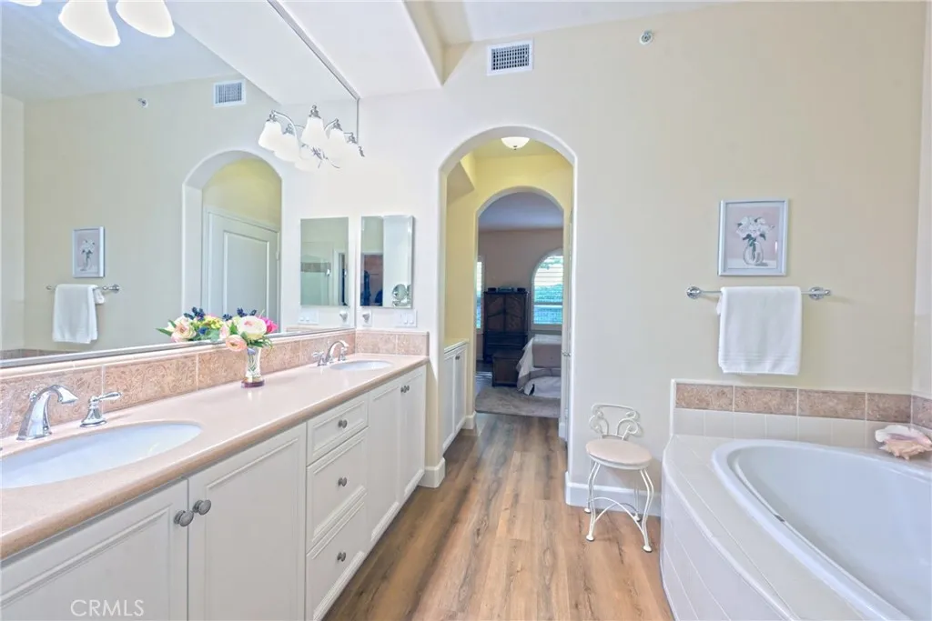 Welcome to luxury living in the prestigious San Lorenzo community of Yorba Linda. This fabulous single-level corner-unit townhome offers 1,702 square feet of beautifully appointed living space, three bedrooms, two-and-a-half bathrooms, and an attached two-car garage. The interior features luxury vinyl plank flooring and plantation shutters throughout, creating a warm and sophisticated atmosphere. The stunning gourmet kitchen features granite countertops, a large island with bar seating, stainless-steel KitchenAid appliances, including a five-burner cooktop, LED recessed lighting, and an abundance of cabinetry. The kitchen opens to an inviting family room enhanced by high ceilings and a charming gas fireplace with logs. The dining room offers high ceilings and a new chandelier. The spacious primary bedroom features an elegant arched window and leads to a luxurious primary bathroom appointed with dual sinks, Corian countertops, a tile backsplash, a large wall-sized mirror with upgraded fixtures, a soaking tub, a frameless glass shower, and a generous walk-in closet with a chandelier. The secondary bedrooms are equally inviting, offering high ceilings and mirrored closet doors. The hall bathroom includes a tub/shower combination with Corian countertops, while the powder room provides a pedestal sink and updated fixtures. Additional conveniences include an inside laundry room with built-in cabinetry and a two-car garage with epoxy flooring and a workbench area. A spacious backyard space with updated landscaping includes a lemon tree and a newer gazebo. Recent upgrades completed