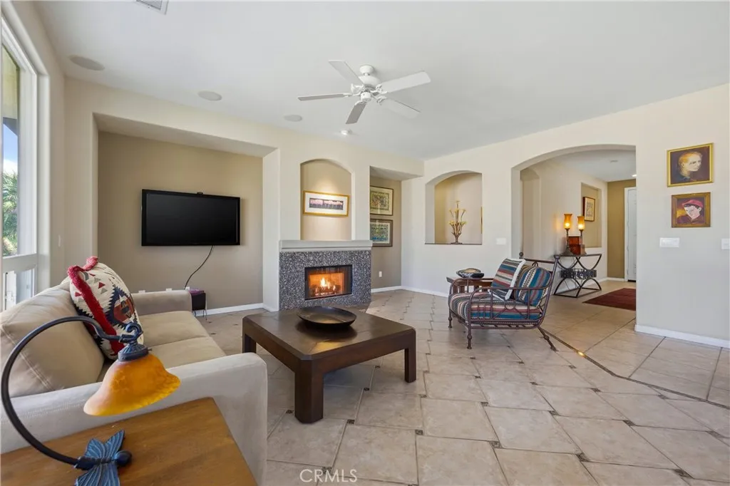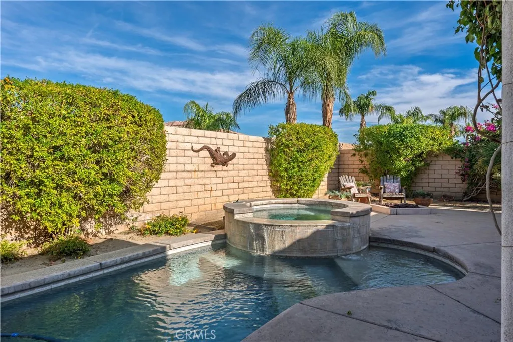 Great new price! Private pool home in the wonderful, gated community of Tuscany. Enjoy views of the San Jacinto mountain peak from your rear yard and private pool, spa, and firepit. You can even see the light at the top of the tram at night. This community boasts exceptional space, landscaping, a gated entry, dog park, playground, and stunning water fountain. The community pool and hot tub with bathrooms and BBQ equipment are across the street. The home has a practical floor plan with 3 bedrooms, 2 bathrooms and an additional flex room that would make a stately home office or den. Enjoy the surround sound speaker system, air conditioning, and convenient single level living. Also, this property was just retrofitted with all those items that insurance companies are looking for like water flow, temperature and smoke detector monitoring, a tremendous help in getting new insurance. Affordable Coachella Valley living in a fantastic community near everything that makes the Palm Springs area so desirable.