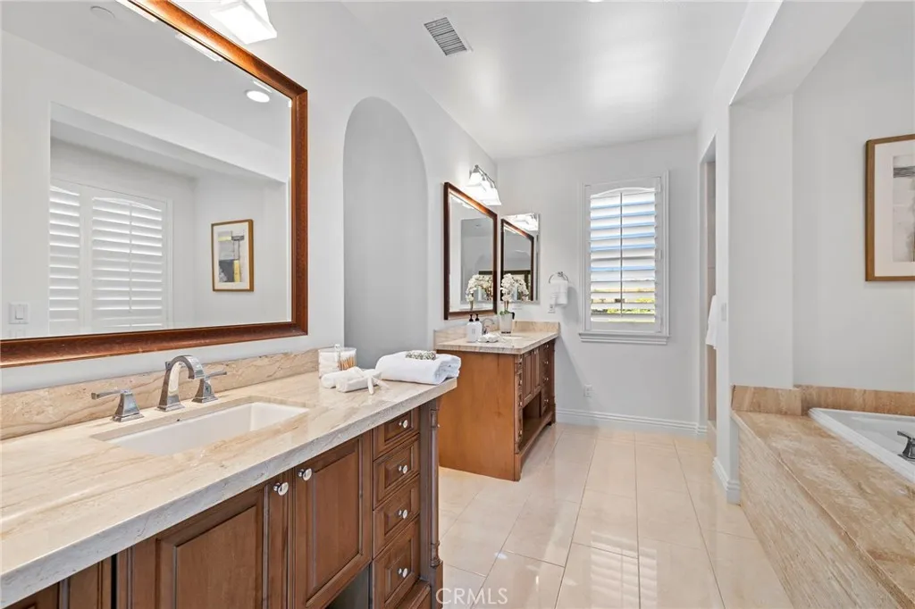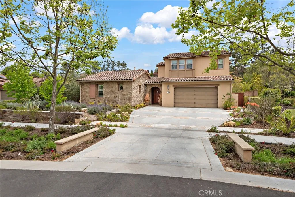 Located on an idyllic cul-de-sac with a central landscaped island in the newer Legacy Collection at Ladera Ranchs guard-gated Covenant Hills, this impressive home rivals the luxury and craftsmanship of custom estates. Move-in ready, the expansive design is host to five ensuite bedrooms and five- and one-half baths in approximately 4,225 square feet of refined living space, ensuring ample comfort and privacy for you and your guests. Three bedrooms are located on the first floor, including a grand primary suite that opens to the homes large courtyard and features a walk-in closet, soaking tub, separate shower and two vanities. Two additional suites join a spacious loft on the second level. An upscale aesthetic is infused throughout the home, emphasized by a formal entrance, a stunning foyer with dramatic staircase and glass doors leading to the courtyard, and a dining room for picture-perfect entertaining. Opening to the courtyard and the backyard, the light and open family room showcases a vaulted ceiling with open beams, an elegant fireplace and plenty of room for large gatherings. In the kitchen, top-of- the-line stainless steel appliances include a built-in refrigerator, double oven and a six-burner range with griddle and matching hood. Wood cabinetry, stone countertops, an oversized island, walk-in pantry, and full-tile backsplash are also featured. Archways, handsome millwork and stylish lighting fixtures complement plantation shutters, hardwood flooring, and granite and marble finishes throughout the residence, while a spacious laundry room and an attached three- car g