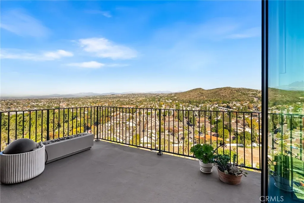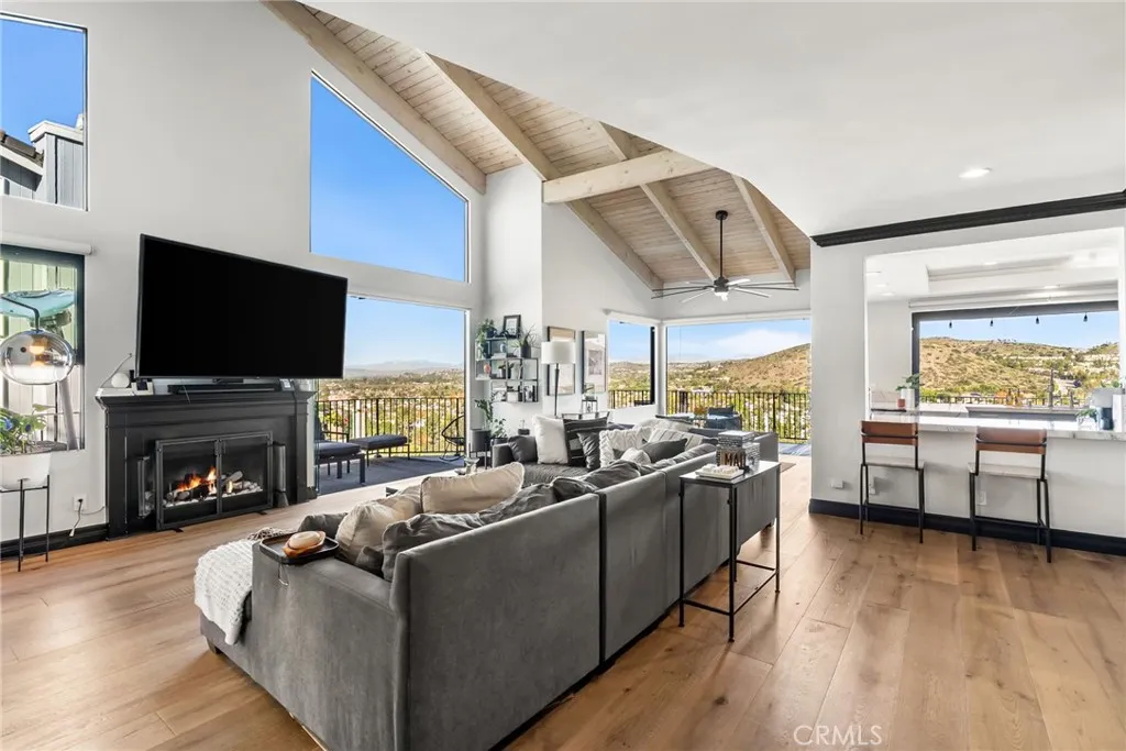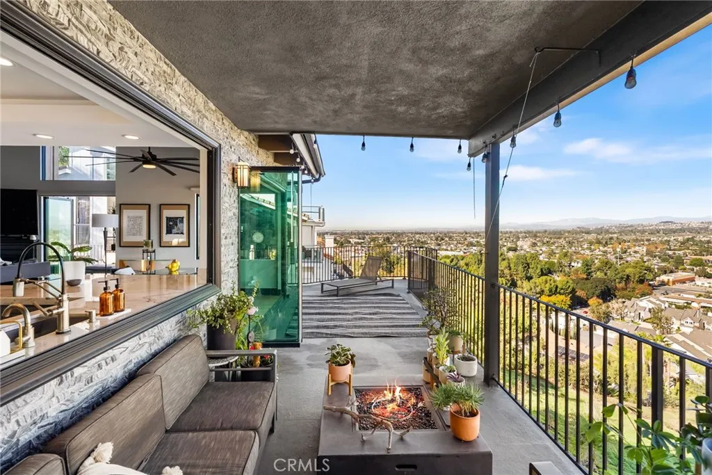 Perched in the hills of North Tustin, this beautifully reimagined home pairs a modern, high-end aesthetic with the charm of a quiet, established neighborhood known for its peaceful hillside setting. 12348 Circula Panorama showcases sweeping views of city lights and surrounding mountains, framed by dramatic architecture, soaring ceilings, and expansive glass that fills every room with natural light. A striking pivoting front door sets the tone, opening to an airy interior defined by clean lines, contemporary finishes, and floor-to-ceiling windows that seamlessly blend indoor and outdoor living. Thoughtfully placed Marvin sliders and generous balconies invite you to enjoy panoramic vistas from nearly every angle, creating an ambiance reminiscent of a private retreat. The main level centers around a fully redesigned chefs kitchen featuring premium stainless-steel Thermador appliancesincluding a wine refrigerator and microwave drawersleek custom cabinetry, a built-in espresso station ideal for morning rituals or entertaining, and extensive quartz waterfall countertops. The kitchen opens to an informal dining area and a warm, inviting great room anchored by a fireplace, with a formal dining room, currently used as a creative space, located just off the kitchen. White-oak engineered wood flooring enhances the home throughout. Spanning approximately 3,200 square feet on nearly half an acre, the property embraces indoor-outdoor living with multiple terraces and a gently sloping lot offering potential for a custom deck, garden terrace, or additional outdoor entertainment areas. Desi