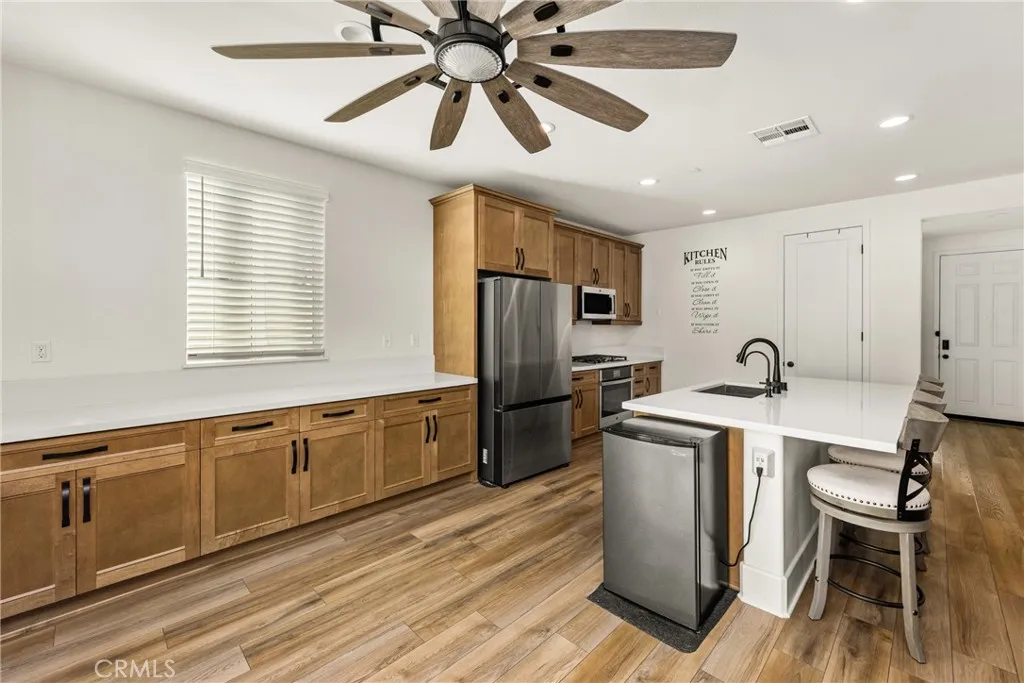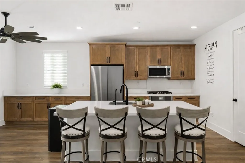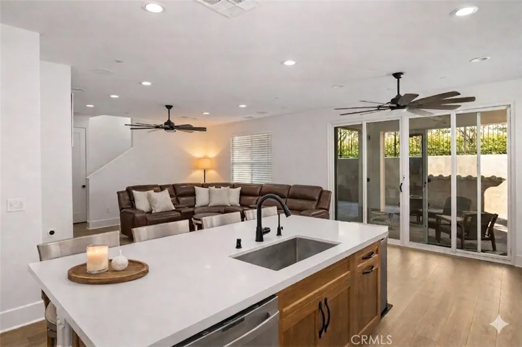 Freshly reduced to $649,988, this 2022-built home in guard-gated Terramor offers a rare combination of newer construction, flexible living space, and fully paid solar. Inside, the open-concept layout is designed for modern living, with upgraded flooring, a fireplace, built-in speakers, wired ethernet, and a spacious great room that connects seamlessly to the kitchen and dining areas. The kitchen is upgraded with quartz countertops, GE Profile stainless steel appliances, soft-close cabinetry, and a generous pantry. A first-floor flex room with closet offers an easy option for a fourth bedroom, office, or guest space. Lots of Options....... Upstairs, the primary suite includes a walk-in closet and large walk-in shower, along with two additional bedrooms, including one with its own walk-in closet. A Spacious-full laundry room with sink and storage adds everyday convenience. The backyard is thoughtfully designed for low-maintenance enjoyment, with pavers, artificial turf, and a covered patio with gas hookup for relaxing or entertaining. Additional features include epoxy garage floors, EV charging capability, water softener, drinking water filtration, tankless water heater, and energy-efficient systems throughout. Located within the guard-gated Terramor community, residents enjoy access to resort-style amenities, parks, trails, dog parks, and community events. Move-in ready, energy efficient, and well equipped for the way people live today, this home is an exceptional opportunity in one of Terramors most sought-after neighborhoods.