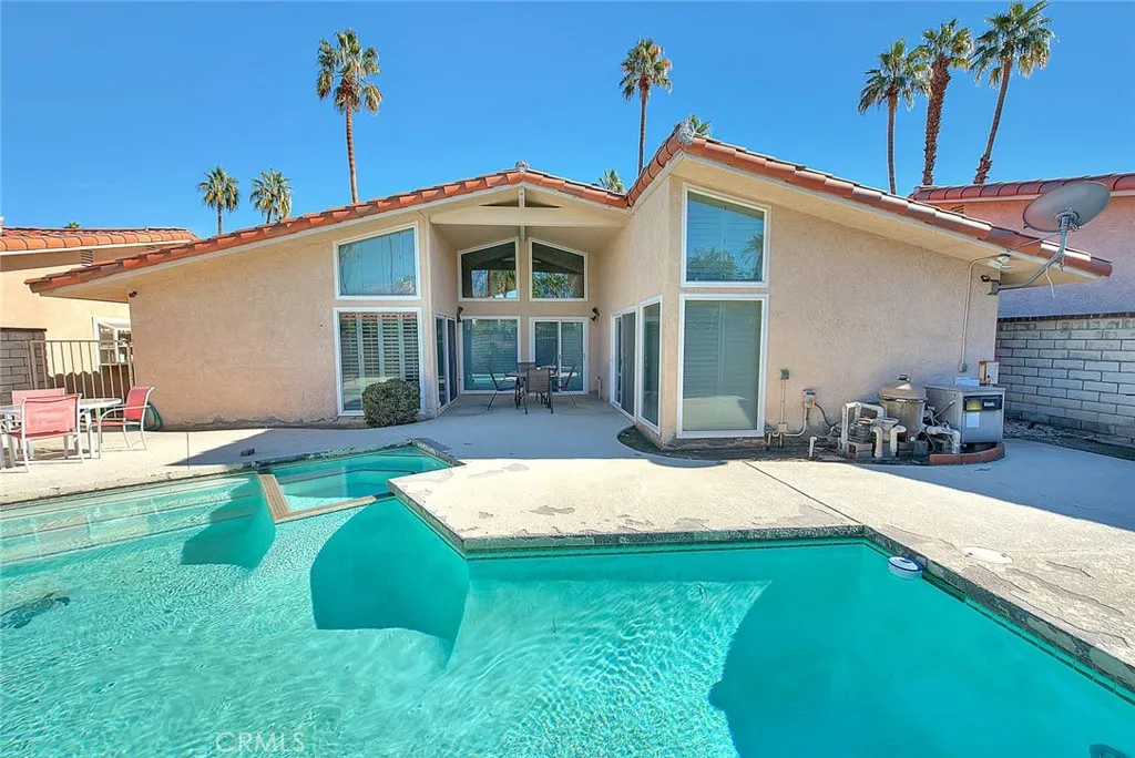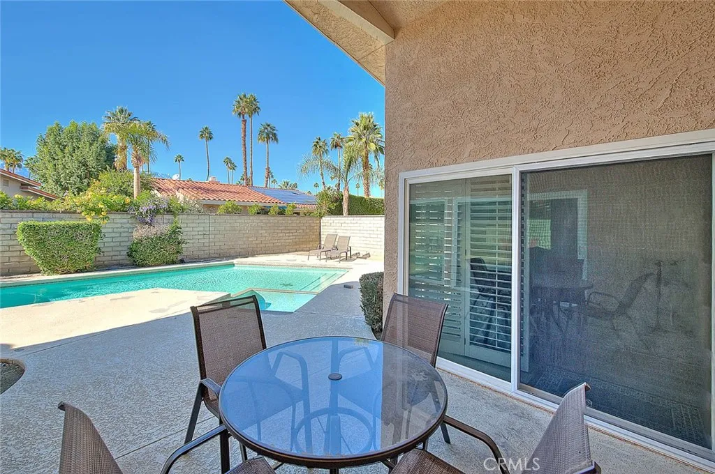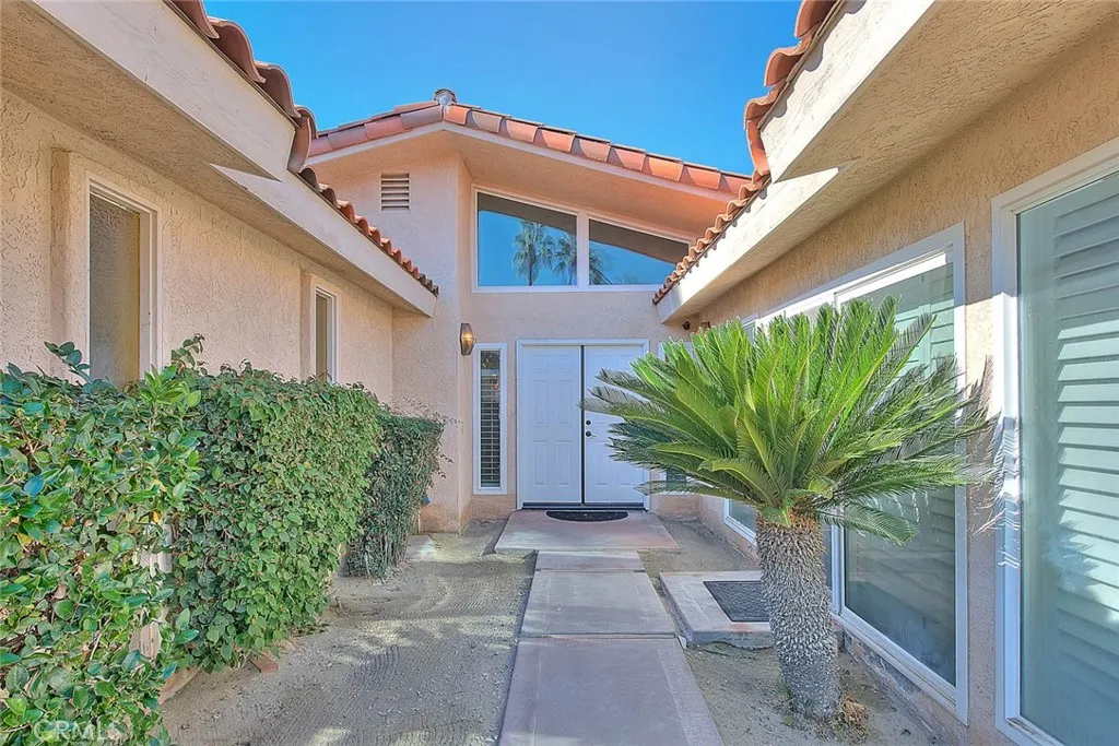 Welcome to resort style living! This Charming desert home is a must see!!! It's Immaculate and move in ready! This exquisite single-story, three-bedroom spacious home, is on a cul-de-sac that and is located in the highly desirable Rancho Village community in Cathedral City. Upon entering the home, you will be delighted by the elegant, grand and spacious open concept great room with a living room, a dining room, a family room and kitchen. The home has stunning high Vaulted ceilings and recess lighting. There are also many elegant windows throughout the house, all with crisp white plantation shutters that let in a lot of natural light. The entire home has been freshly painted and has new neutral colored laminate flooring throughout. There are three large bedrooms that each have their own private bathroom. The spacious backyard has a lovely private pool, a covered patio and plenty of space to entertain friends or just relax. This Charming gated community borders the city of Rancho Mirage, close to all the great shopping, restaurants and golf courses. The grounds in this community are so beautifully maintained. There is an elegant newly renovated clubhouse, a grand main community pool, beautiful tennis and pickleball courts. It's a lovely home to make your own.