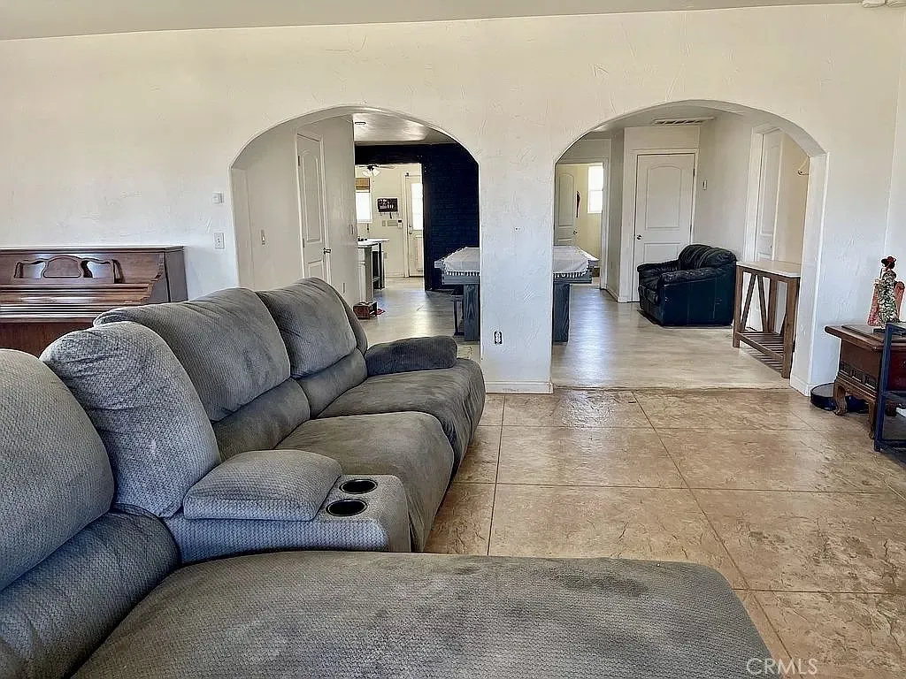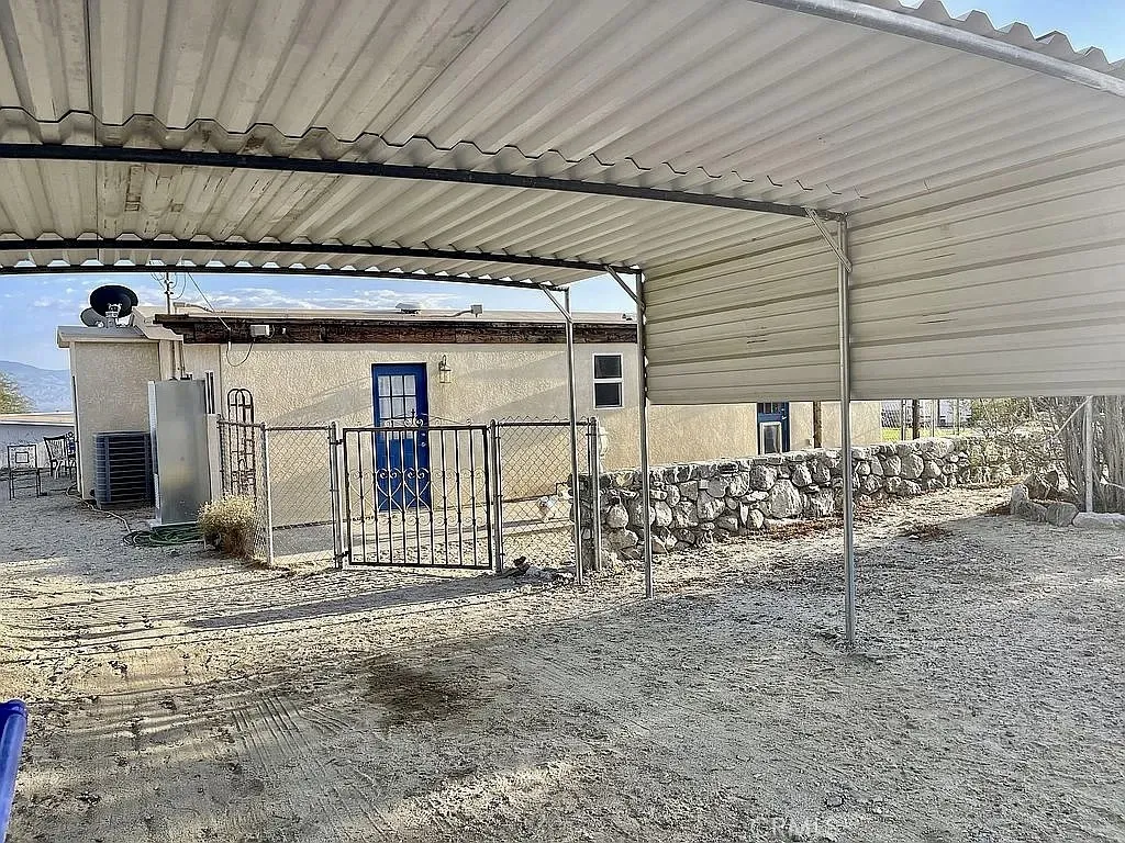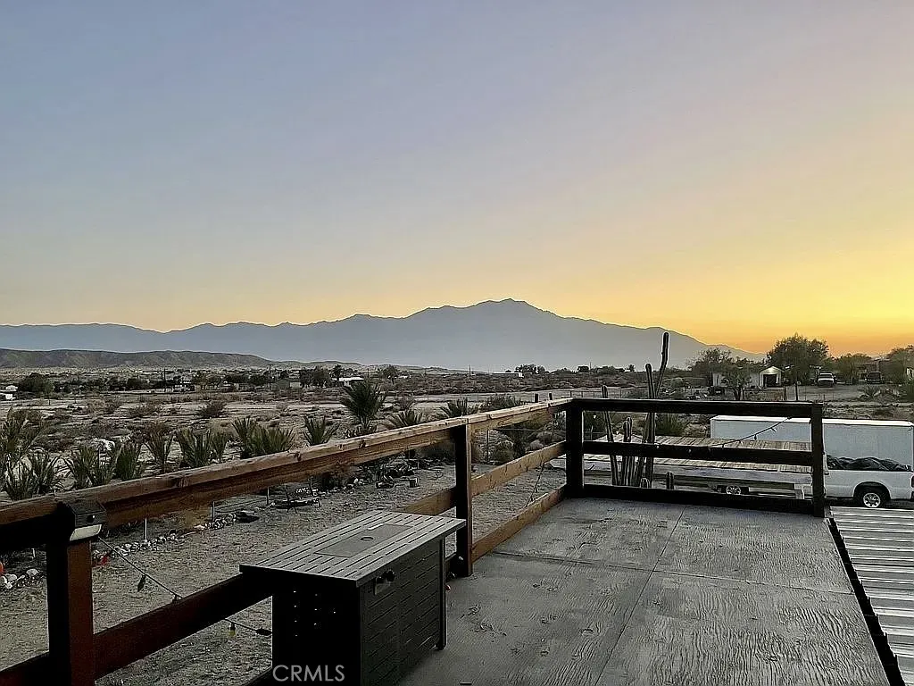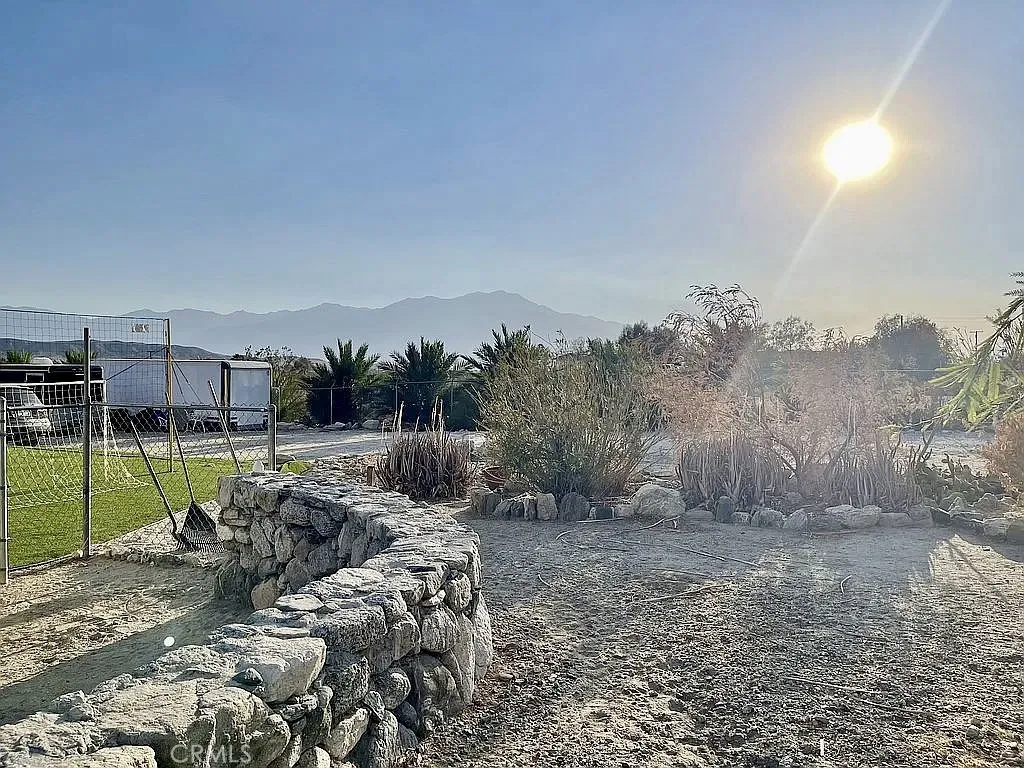 Escape the city and enjoy serene, private living on this gorgeous 2.5-acre property featuring over 65 Medjool Date trees with room to plant many more. Zoned for agriculture and equestrian use, this secluded retreat offers spectacular mountain and desert vistas, perfect for appreciating stunning sunsets, sunrises, and starry nights in peace. The charming, furnished 4-bedroom, 1-bath Sky Valley home boasts a European kitchen with white and gray granite countertops, Old World cabinetry, and spacious dining area. The bathroom features a high vanity with a glass bowl sink and an open tile shower. The living room is warm and inviting, with French doors and a real wood-burning stove, complemented by a spacious 6 x 40 screened-in porch for outdoor relaxation. A fourth bedroom on the west side of the home provides additional flexibility. Outside, the property includes a trailer for a project ideal for guests, a caretaker, or in-law quarters as well as four sheds for storage. For entertainment and gatherings there is 20x40 concrete slab on the lower part of the property offers versatile space for additional projects or structures. The home is partially gated for privacy and features a covered carport, making it perfect for families, artists, musicians, or contractors seeking a peaceful rural lifestyle. This property offers a unique blend of natural beauty, functional living spaces, and agricultural potential, or just a private getaway for those seeking a weekend home