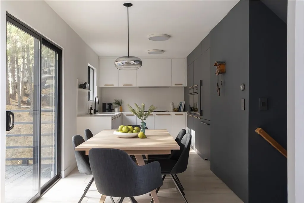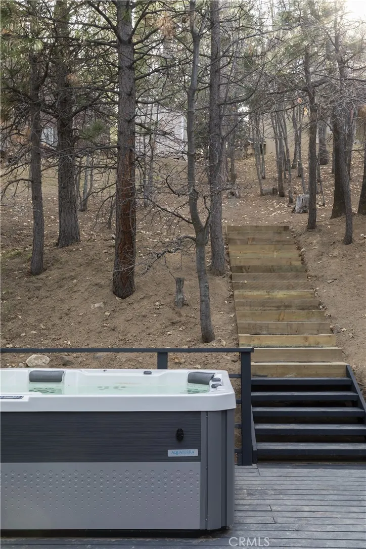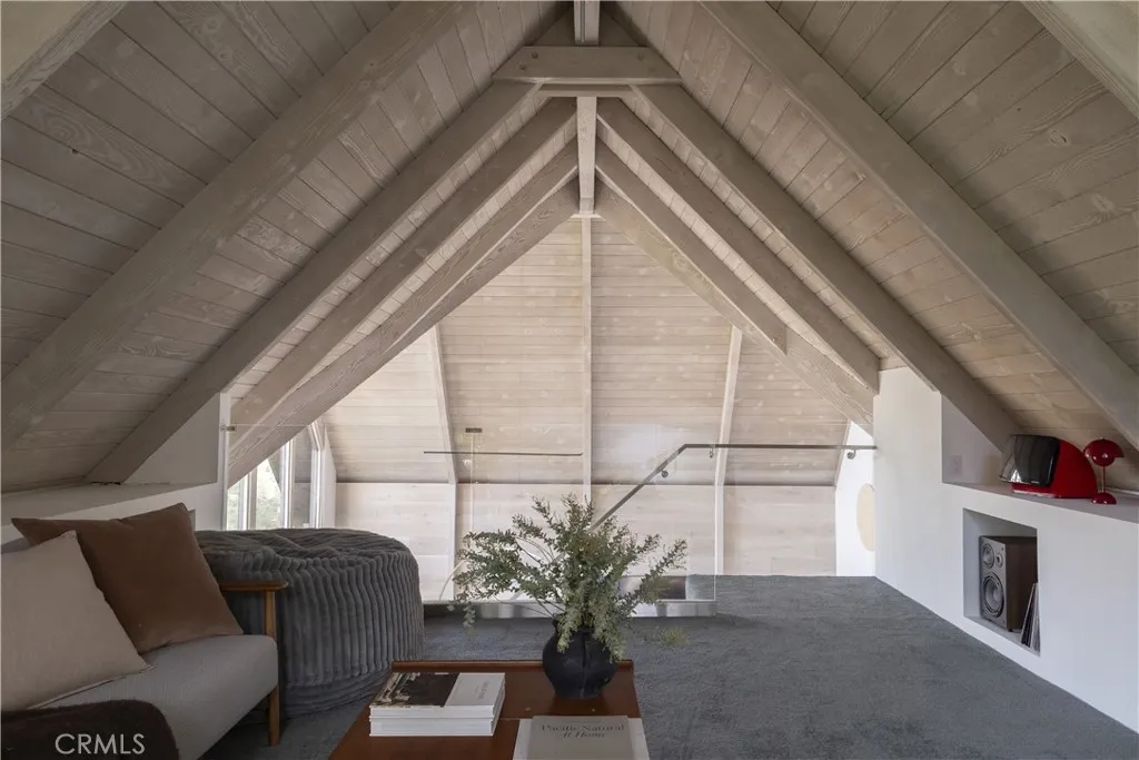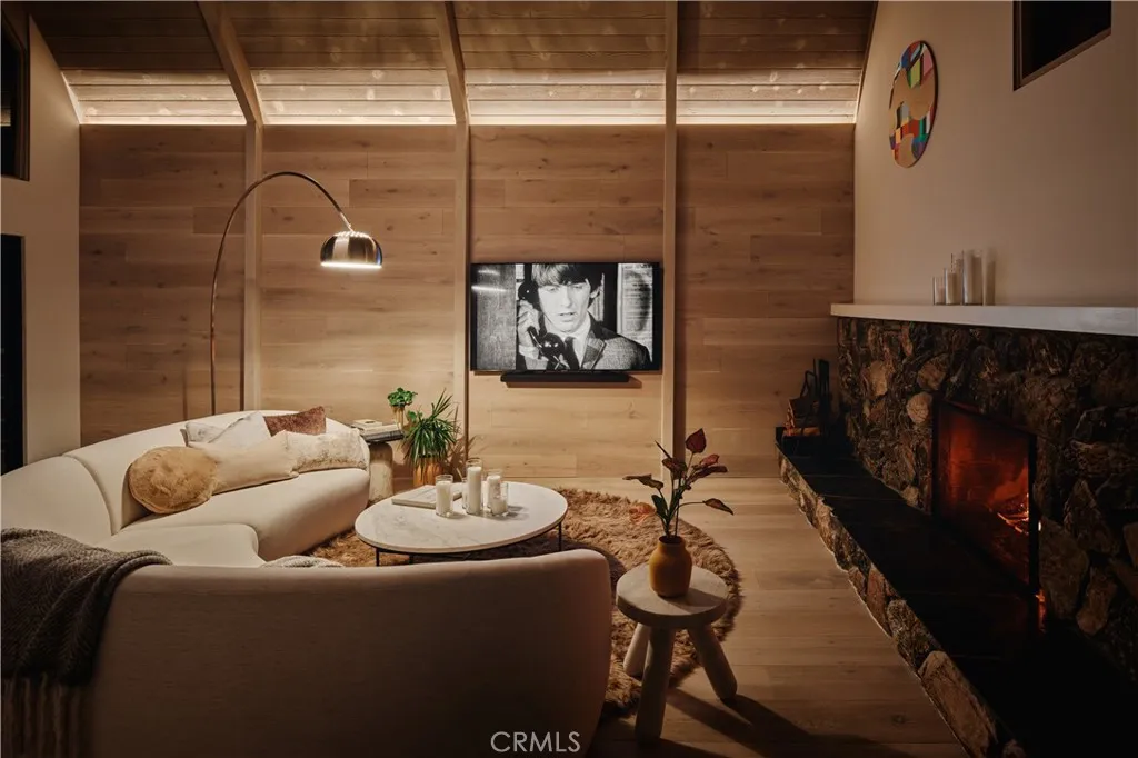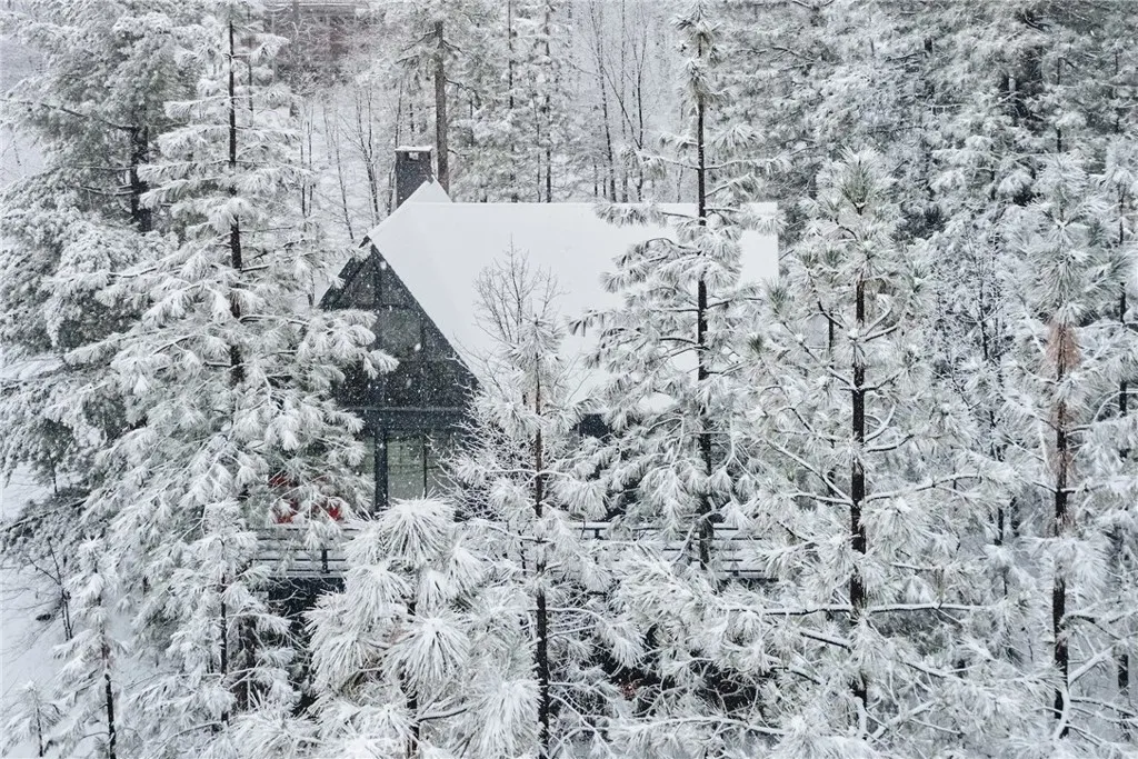 Perched in the pines of Lake Arrowhead, this striking architectural retreat reimagines a classic 1960s cabin into a sophisticated, modern mountain escape. Designed by Dan Brunn Architecture, a renowned firm known for thoughtful residential work, the home is defined by its rare double A-frame form, blending iconic character with a refined, minimalist palette inspired by Scandinavian and Japanese influences. Original wood elements were preserved and revived through walnut blasting, bringing warmth and authenticity to the contemporary upgrades throughout. Spanning three levels, the layout offers restful privacy on the lower floor with the primary suite, vibrant gathering spaces and a guest suite on the main level, and a dramatic loft retreat above. The central living room is anchored by a tumbled-boulder fireplace and framed by tall glass that captures sweeping forest views. A custom terrazzo countertop, navy Fenix cabinetry, and curated lighting elevate the kitchen and dining space into a true showpiece, while mid-century influences and soft textures add depth and comfort. Outdoor living takes full advantage of the setting, relax on the deck overlooking the trees or soak in the jacuzzi and breathe in the crisp mountain air. Just beyond the backyard, a forest trail leads directly to the UCLA Conference Center and Tavern Bay Beach Club, only a short walk or easy golf-cart ride away, placing you in one of Lake Arrowheads most desirable locations. Sustainability guided the transformation, preserving the original structure while enhancing comfort and style. Perfect as a high-end i