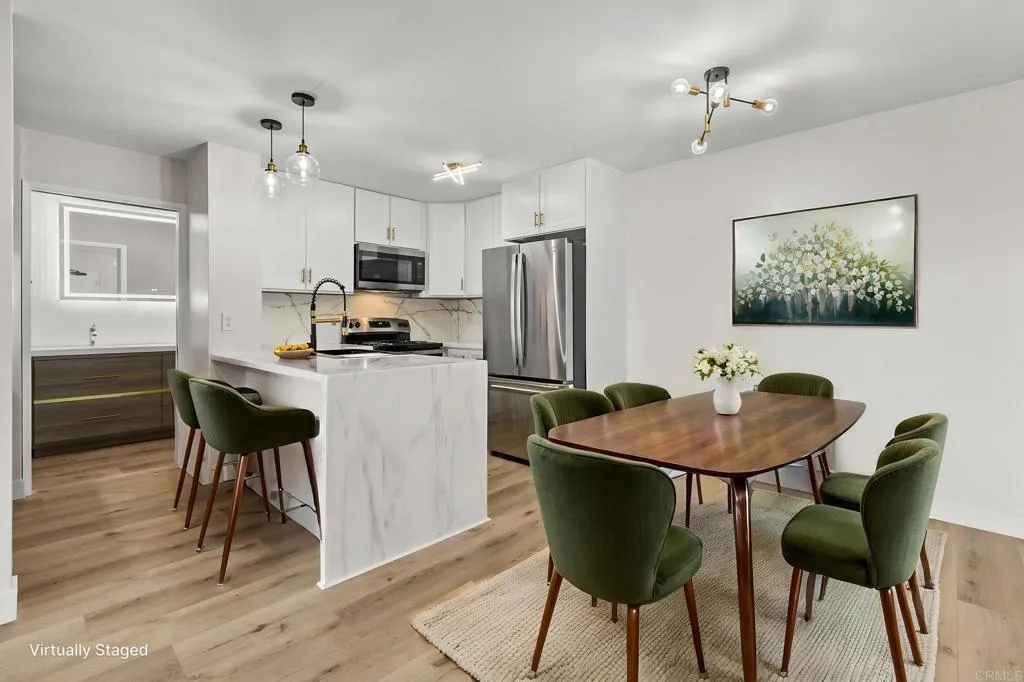 Located in the highly desirable Plaza complex in Pacific Beach, this beautifully refreshed one bedroom, one bath condo showcases stylish upgrades & an exceptional coastal lifestyle. The unit has been renovated throughout with new flooring, fresh interior paint, a brand new kitchen featuring new appliances, countertops, cabinetry, sink & faucet, along with a custom cabinet storage area complete with a wine fridge. The bathroom has been fully updated with a new tub and a sleek double vanity, while new light fixtures throughout the home create a bright & modern feel. The spacious bedroom features a striking board & batten paneled accent wall, adding character & design appeal. Situated in a quiet section of the complex, the unit enjoys views of the tennis courts without public walkways or foot traffic directly outside, providing added privacy rarely found in the community. The Plaza complex features secured entry on all doors, 24 hour security, and resort style amenities including multiple pools, tennis courts, a fitness center with sauna, movie room, billiards room, barbecue area, library, & inviting indoor and outdoor seating areas overlooking the lagoon fountain. The unit includes one assigned parking space in the secured garage with convenient access near the unit. Ideally located close to freeways, shopping, dining, & just minutes from Pacific Beach, this is a must see opportunity in one of San Diegos most sought after coastal communities. **Some Pictures are Virtually Staged**