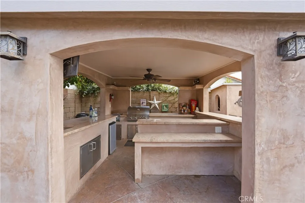 Welcome to this beautifully designed 4-bedroom, 2.5-bath home that blends comfort, space, and effortless indoor-outdoor living. High ceilings and an open floor plan create a bright, airy atmosphere throughout the main living areasideal for both everyday living and entertaining. A formal dining area is highlighted by a new drop-down light fixture, while the kitchen features new countertops and overlooks the inviting family room. The spacious primary suite provides a relaxing retreat with a walk-in closet and private bath. The warm and welcoming family room with a gas fireplace opens directly to the backyard, seamlessly extending the living space outdoors. Step outside to your private oasis featuring a sparkling pool and jacuzzi, perfect for relaxing or hosting guests. An outdoor kitchenette with refrigerator and sink enhances the space for effortless entertaining. Additional exterior amenities include a pool storage room, workshop, and dedicated storage area, offering exceptional functionality. A 3-car garage provides ample parking and storage. Conveniently located near the 22 and 55 freeway, this home offers the perfect balance of space, style, and resort-like amenitiesready to welcome its next owners home.