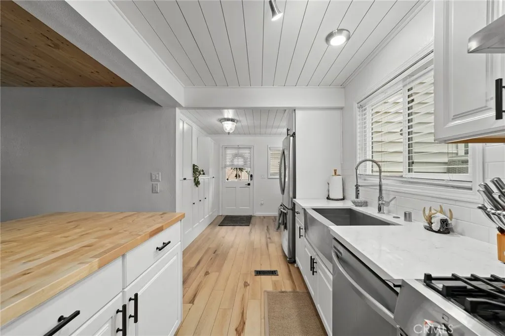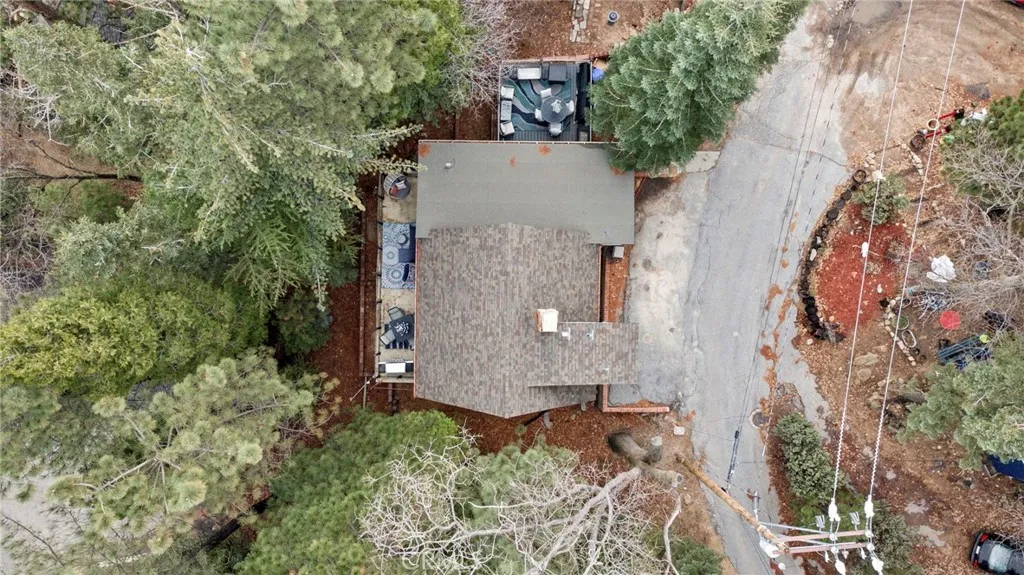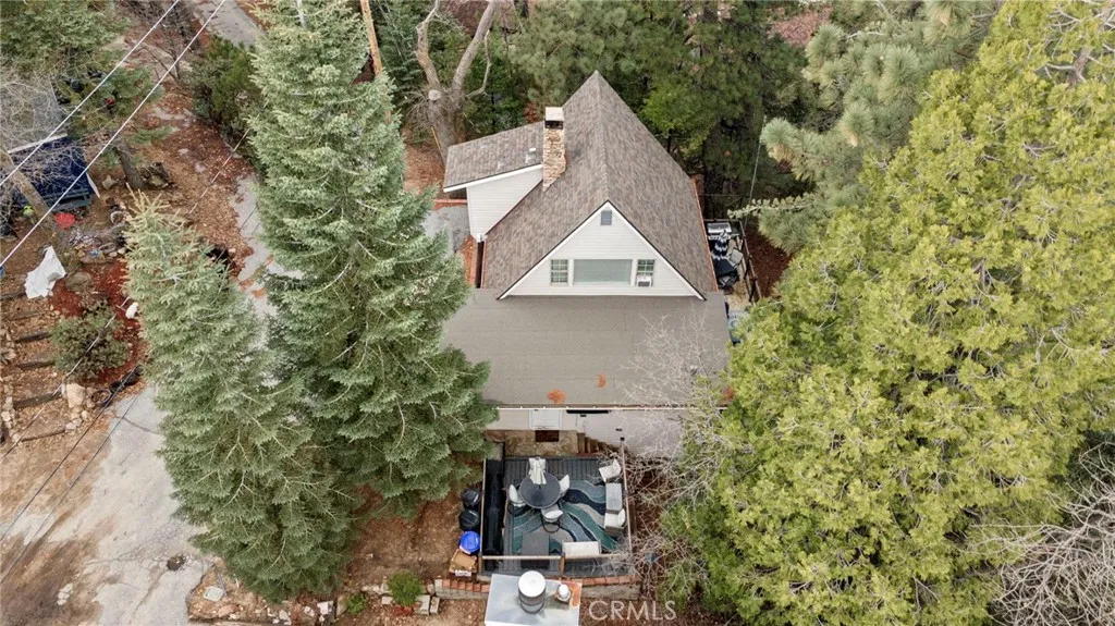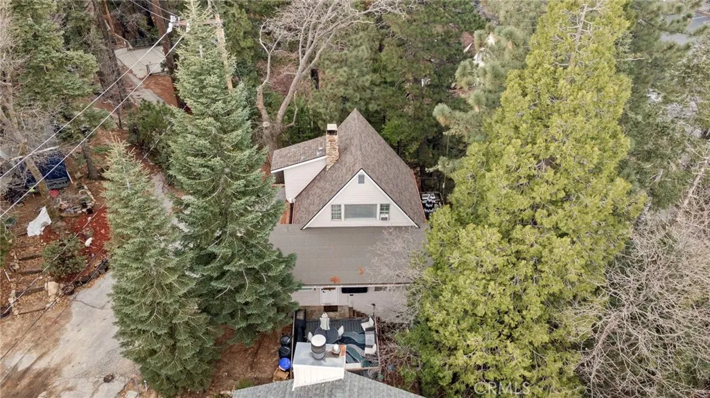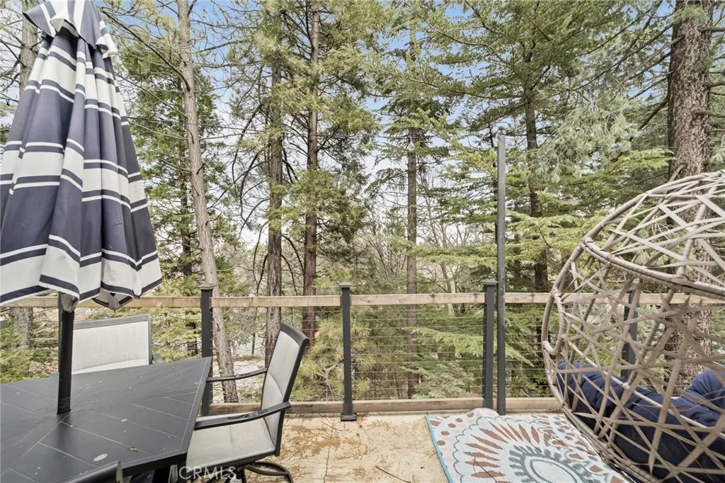 Tucked among the trees, this beautifully updated Lake Arrowhead cabin perfectly blends modern upgrades with timeless mountain charm. An oversized front deck welcomes you inan ideal space for relaxing, entertaining, or simply soaking in the peaceful forest surroundings. Inside, the bright and airy entryway features a wall of pantry and storage cabinets, along with a cozy breakfast nook offering space for a coffee bar. A newly installed window fills the home with abundant natural light. The renovated kitchen boasts quartz countertops, a peninsula with a custom butcher-block top, a stainless steel sink, and newer flooring. It opens seamlessly to the living room, where a stone fireplace, tongue-and-groove ceiling, recessed dimmable lighting, and a mini-split system create a warm and inviting gathering space. Sliding glass doors lead to the rear deck, complete with newer railings and serene treetop views. The first-floor bedroom feels like a private retreat, featuring built-in bookshelves, a sliding glass door with direct access to the rear deck, newer ceiling fixture, and updated blinds. A beautifully updated first-floor bathroom offers a walk-in shower. Upstairs, the primary bedroom provides a cozy escape, highlighted by a unique open-concept soaking tub set atop real hardwood floorsperfectly complementing the mountain setting. An additional bedroom, half bath, and ample storage complete the second level. Outside, newly renovated exterior steps lead to the backyard and build-up area, which includes laundry and generous space for additional storage. Situated on a quiet cul-de-s