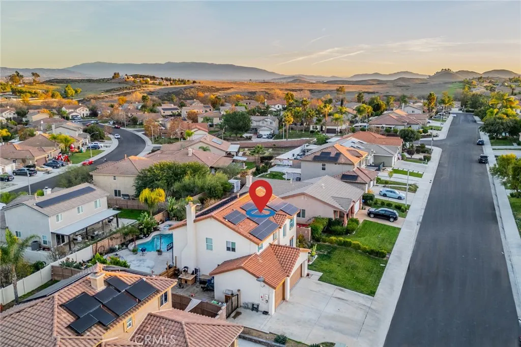 POOL & SPA NEWLY REPLASTERED*** Beautiful home nestled in Menifee bordering Murrieta with NO HOA. This beautiful 4 bedroom, 3 full bath home with open floor plan features a gorgeous entry way, newer tile flooring that leads you to the beautiful large kitchen with an oversized island with marble countertops, wooden columns, built in microwave, stainless steel farmhouse sink, double oven and a built in wine cooler. Open to the dining area and large family room with beautiful fireplace. Downstairs you also have a room that can be used as an office or optional downstairs bedroom (currently being used as a bedroom). The downstairs bathroom is handicap accessible. Walk up the stairs, where you will find a nice open loft area, 3 guest bedrooms, a full guest bathroom, individual laundry room and a spacious Ensuite Master bedroom. The beautiful Master features separate shower, tub and toilet as well as a walk-in closet not to mention the beautiful views to the Valley and Temecula Wineries right from your master bedroom. The beautiful and spacious backyard perfect for entertaining features a beautiful pool and spa that have just been newly replastered. You will also find Lemon and plum fruit trees, fire pit area, and a separately fenced dog and play areas for children. The front yard is low maintenance landscaping, not to mention the large 3-car garage with laundry hook-ups as well, oversized driveway for RV/TOY parking. This home is energy efficient with solar (23 panels). There is a community park, easy access to the 215 freeway, close to stores, schools, Costco, Trader Joes and a