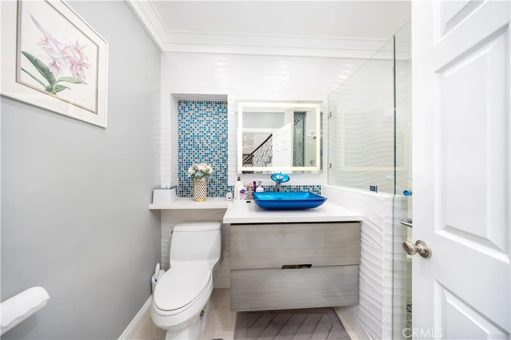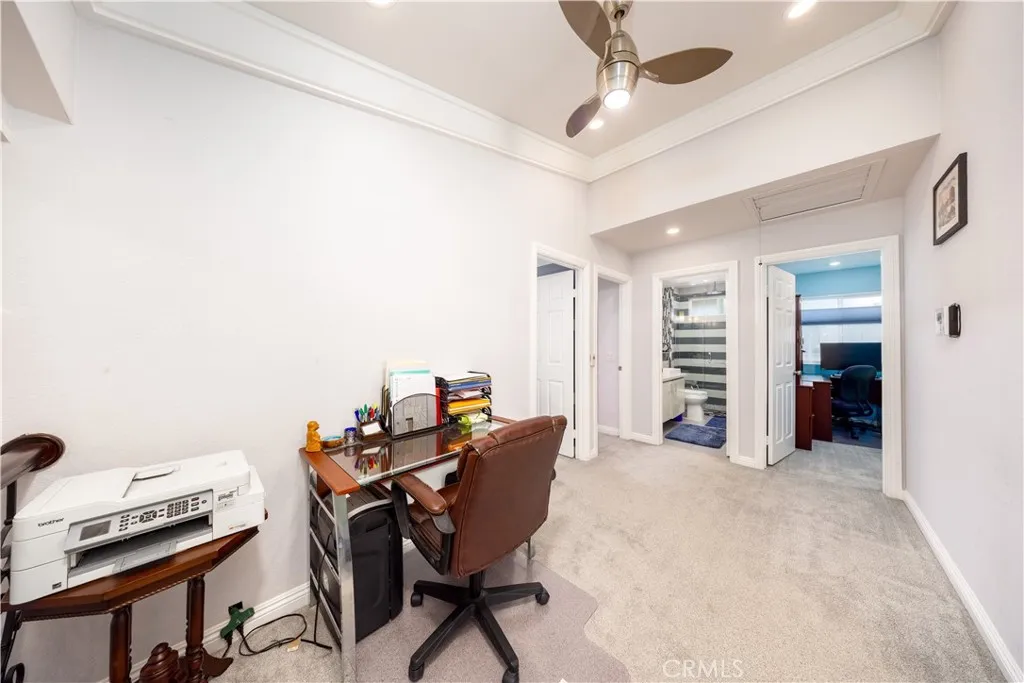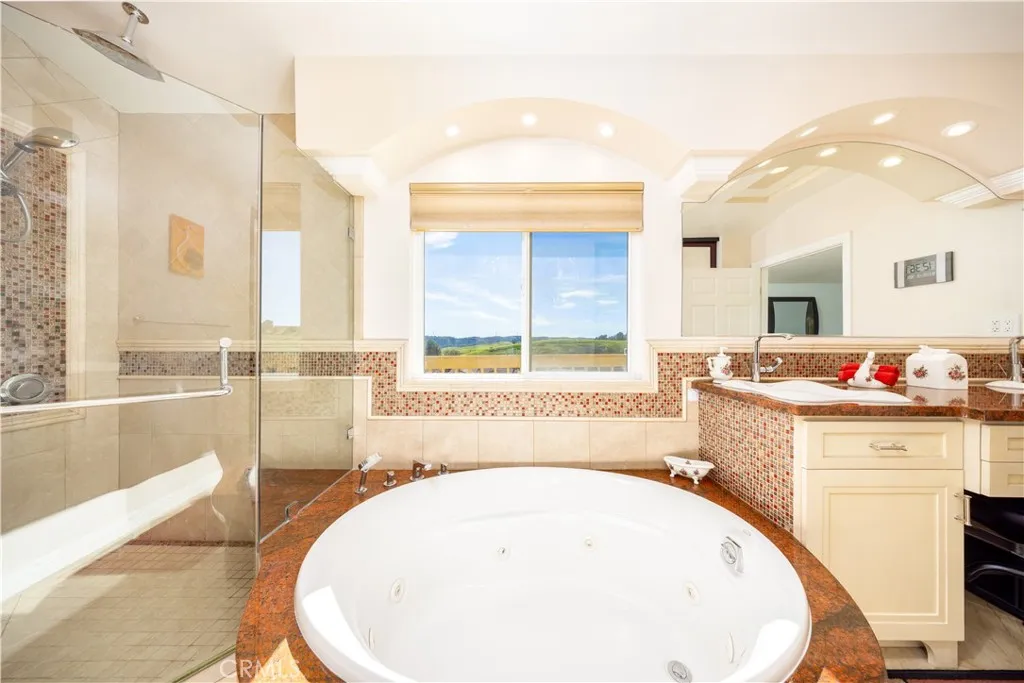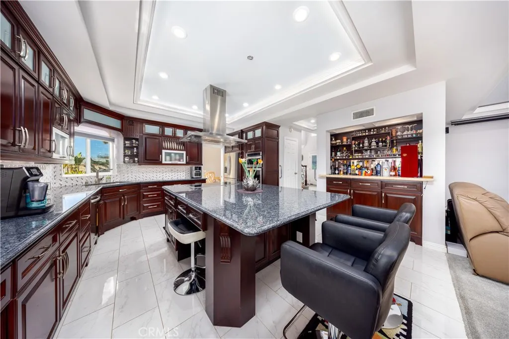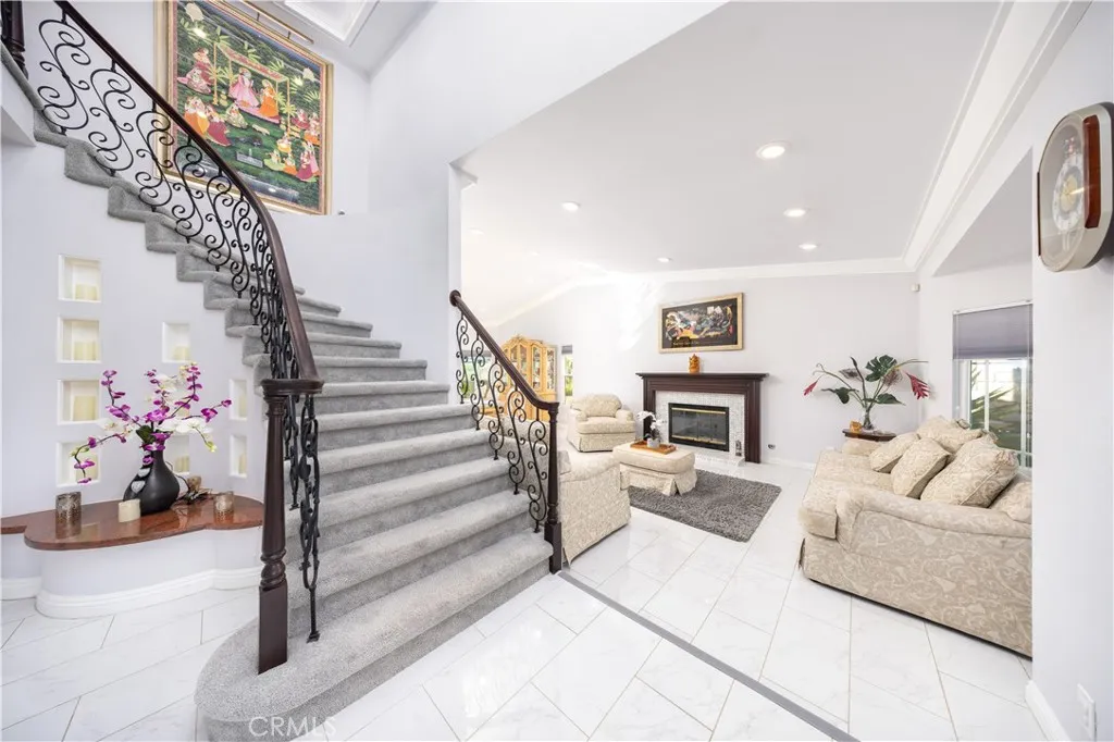 Welcome to this beautifully updated Diamond Bar home, ideally positioned to capture impressive birds-eye views overlooking neighboring homes, the Country Estates gated community above, and the lower-level street belowoffering one of the areas most desirable vantage points. Step through the grand double front doors into a bright, airy interior filled with natural light and south-facing rear garden views. The updated kitchen is spacious and well appointed, featuring a large center island with seating for up to six, walnut-stained custom cabinetry, expansive windows, and stainless-steel KitchenAid appliances, including an induction cooktop and food-warmer drawer. The scenic views from the kitchen are truly captivating. The adjacent day room is surrounded by windows and enhanced by a recessed ceiling with multi-color LED border lighting, creating a warm evening ambiance. The dining room offers ample space for entertaining with panoramic garden views, while the living room features bay windows, a central fireplace, crown molding, recessed LED lighting, and an elegant staircase with scrolled iron balusters. Upstairs, the spacious primary suite includes a luxurious en-suite bathroom with dual vanities, a soaking tub, a separate shower, and Ming red granite finishes. A patio door opens to an oversized upper deck with sweeping hill and neighborhood views. Three additional bedrooms and one full bathroom complete the upper level. Additional features include a three-car garage with built-in storage, a workbench, water heater, and washer/dryer hookups. The beautifully maintained rear ga