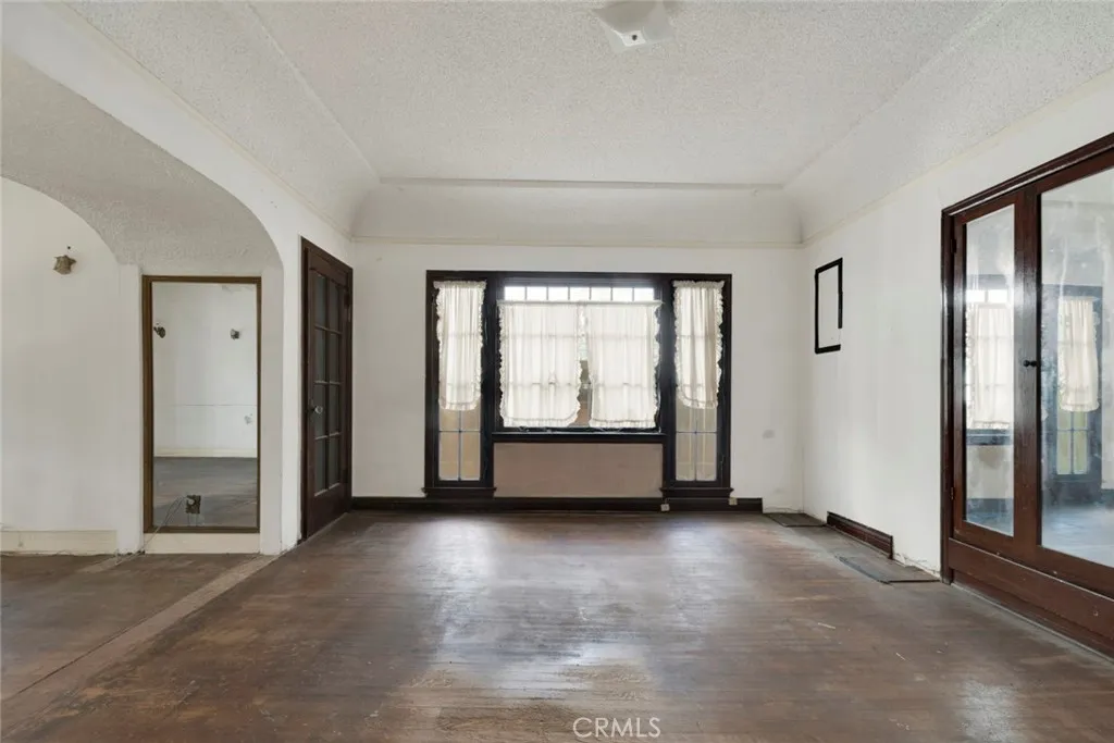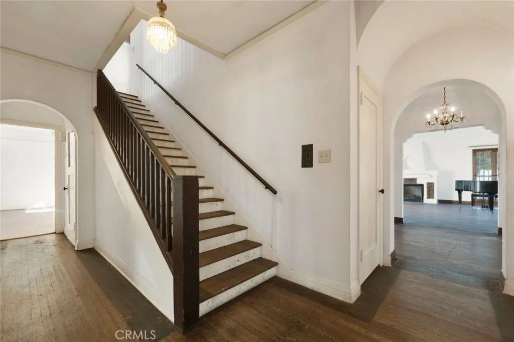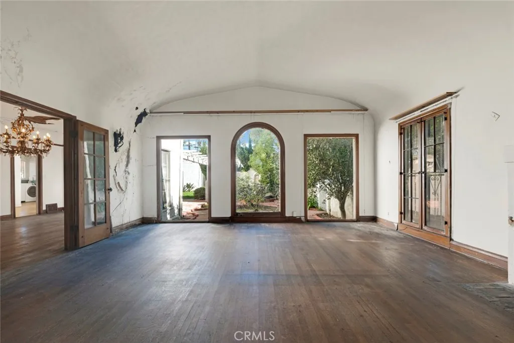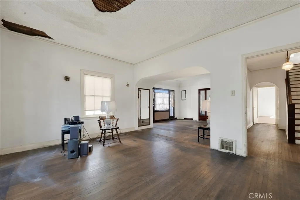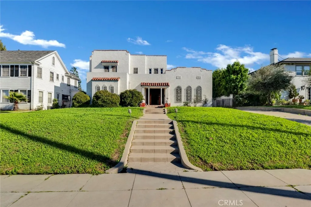 This grand Spanish Colonial Revival in coveted Country Club Park awaits a true visionary ready to restore it to its former splendor. Designed by notable 1920s female architect Anna C. Geck, who was responsible for many similar residences throughout Los Angeles and Orange Counties, the home reflects the elegance and craftsmanship of its era. Much of the original character remains intact, including vintage tile surrounding the fireplace, graceful arched windows, original hardwood floors, and many period light fixtures. The main level offers expansive formal living and dining rooms, a front parlor that may have originally served as two bedrooms, a kitchen with adjacent breakfast room, and a small bedroom and bath that once functioned as maids quarters. Upstairs, four generously sized bedrooms are served by two classic Jack-and-Jill bathrooms. At the rear of the property sits a detached one-bedroom, one-bath guest house of approximately 658 square feet, along with a three-car garage. Located within a Historic Preservation Overlay Zone, this property requires substantial renovation to its systems and structure, presenting a rare and meaningful opportunity to thoughtfully revive a significant architectural gem.