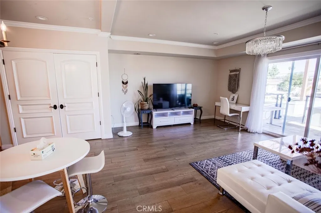 Welcome to this beautifully maintained 1-bedroom, 1-bath condo located at 1598 Long Beach Boulevard, Unit 201. Offering 910 sq ft of comfortable living space, this inviting residence features crown molding, crisp white walls, and a blend of wood-style flooring and plush carpet throughout. The modern kitchen is equipped with stainless steel appliances, perfect for everyday living and entertaining. The spa-inspired bathroom boasts a sleek, contemporary shower, creating a relaxing retreat. Enjoy the convenience of an in-unit washer and dryer tucked neatly into the closet with an added sink for extra functionality. From the living area, you'll have access to your private balcony, ideal for morning coffee or evening relaxation. This unit includes a rare attached 2-car garage and access to premium building amenities, including a welcoming lobby and a fully equipped fitness center. Centrally located with easy access to shopping, dining, and major freeways, this condo offers the perfect blend of style, comfort, and convenience.