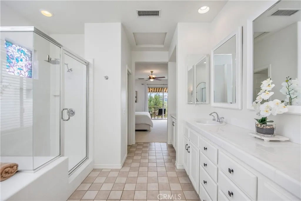 Welcome to 30 Sunswept Mesa a light-filled 5-bedroom, 3-bathroom pool home with 3,327 sq ft of living space, nestled in the prestigious gated enclave of Oak View Estates. Private, quiet and peaceful. Step through double doors into soaring ceilings, beautiful natural light, and spacious formal living and dining areas. At the heart of the home is a private atrium-style courtyard, accessible through French doors, bringing outdoor ambiance and sunshine into the main living spaces. The main level offers two bedrooms and a full bath ideal for guests, multigenerational living, or home office needs. The kitchen opens to the family room with a cozy fireplace, creating an inviting everyday living space. This freshly updated home features brand new carpet, a fully repainted interior in a light, bright palette, refinished white kitchen cabinetry, updated white bathroom cabinets in the primary suite, and a newly painted dual staircase that makes a stunning first impression. Upstairs, a generous loft adds flexibility, while the primary suite includes dual walk-in closets, a soaking tub, walk-in shower, and dual vanities with refreshed white cabinetry. Two additional bedrooms share a Jack-and-Jill bath, and an oversized upstairs laundry room adds convenience. Outdoors, enjoy a saltwater pool and spa and firepit surrounded by lush landscaping and beautiful mountain and canyon views offering the perfect private escape. The home has been fully repiped and impeccably maintained throughout. Located on a picturesque street just a short walk to Canyon Vista Elementary and Westridge Park, this