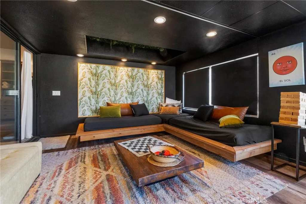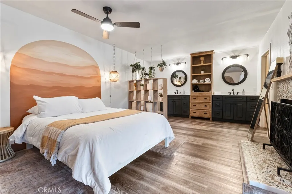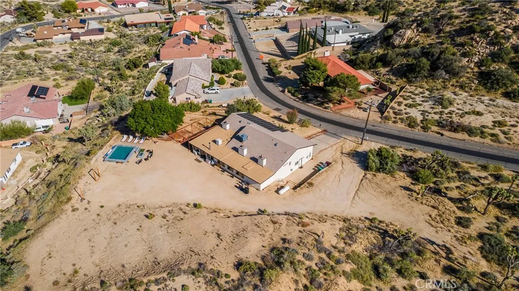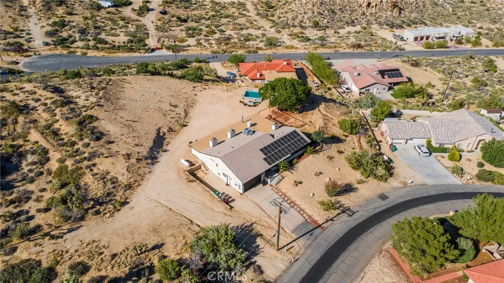 **PANORAMIC VIEW** FULLY FURNISHED & FULY PAID SOLAR PANELS** Welcome to Casa Nopal, your magical secluded retreat is situated on the upper part of the desireable County Club Estates and tucked away in the foothills of Yucca Valley close to Joshua Tree & Pioneertown. This ranch style 3bd 2ba home features 2,812sqft and sits on a 1acre lot surrounded by mountains & the city below, with the most beautiful sunrises & sunsets. Some of the great features of this home includes a kitchen update less than three years old, with beautiful quartz counter tops, custom cabinetry, two electric range/ovens, perfect to prepare your favorite meals, and plenty of open space. There are three fireplaces in the home, one is located upon entry to the house in the elegant sunken seating area, the second one is located in the living room and the third fireplace is located in the primary suite as well as an outdoor fire pit. The primary suite features dual sinks/vanities with updated custom cabinetry, and an extra large walk-in closet. An addition to the other two bedrooms, there is a large second living/billiard room perfect for hosting and entertaining guest and enjoying a cocktail from your professional grade bar with surround system and LED lighting. The open yet private backyard is an entertainers dream with plenty of parking as well as for a large RV. The yard includes a custom patio & pergola, recently added in-ground pool with available heat, an outdoor firepit & propane flat grill, market lights for outdoor dining and plenty of open space for outdoor activities or just lounge in the sun. T